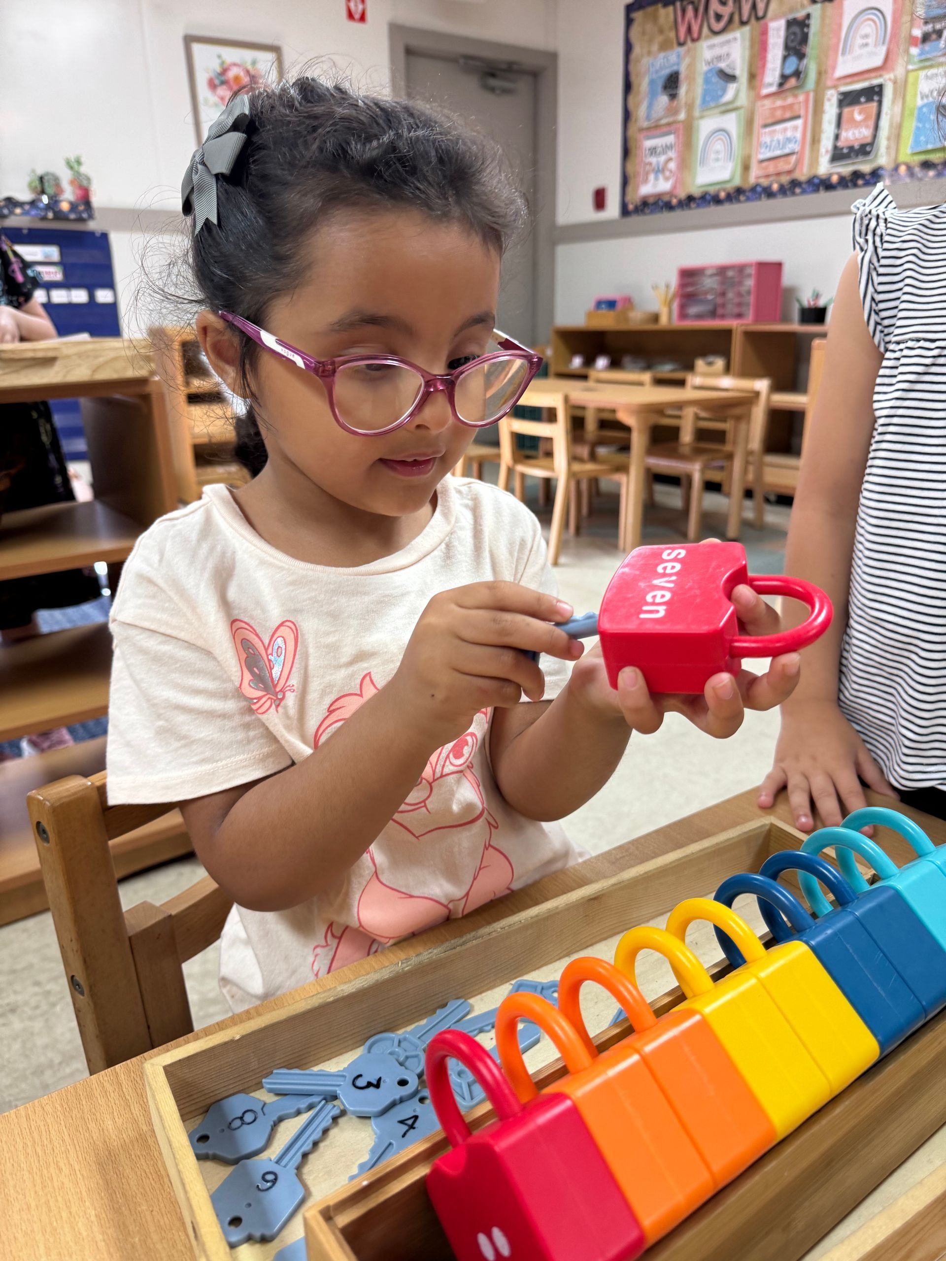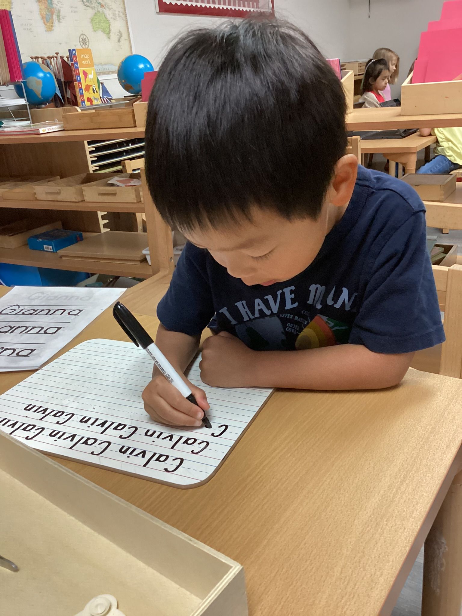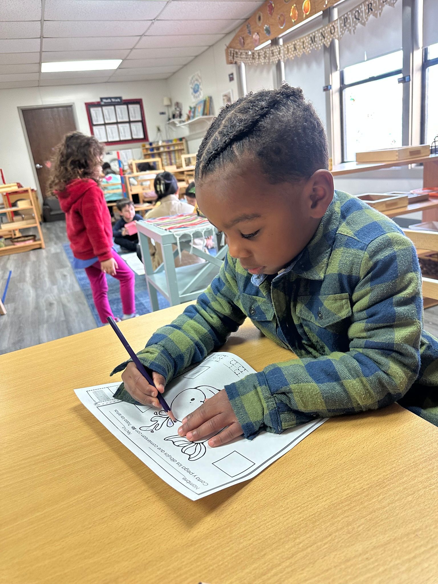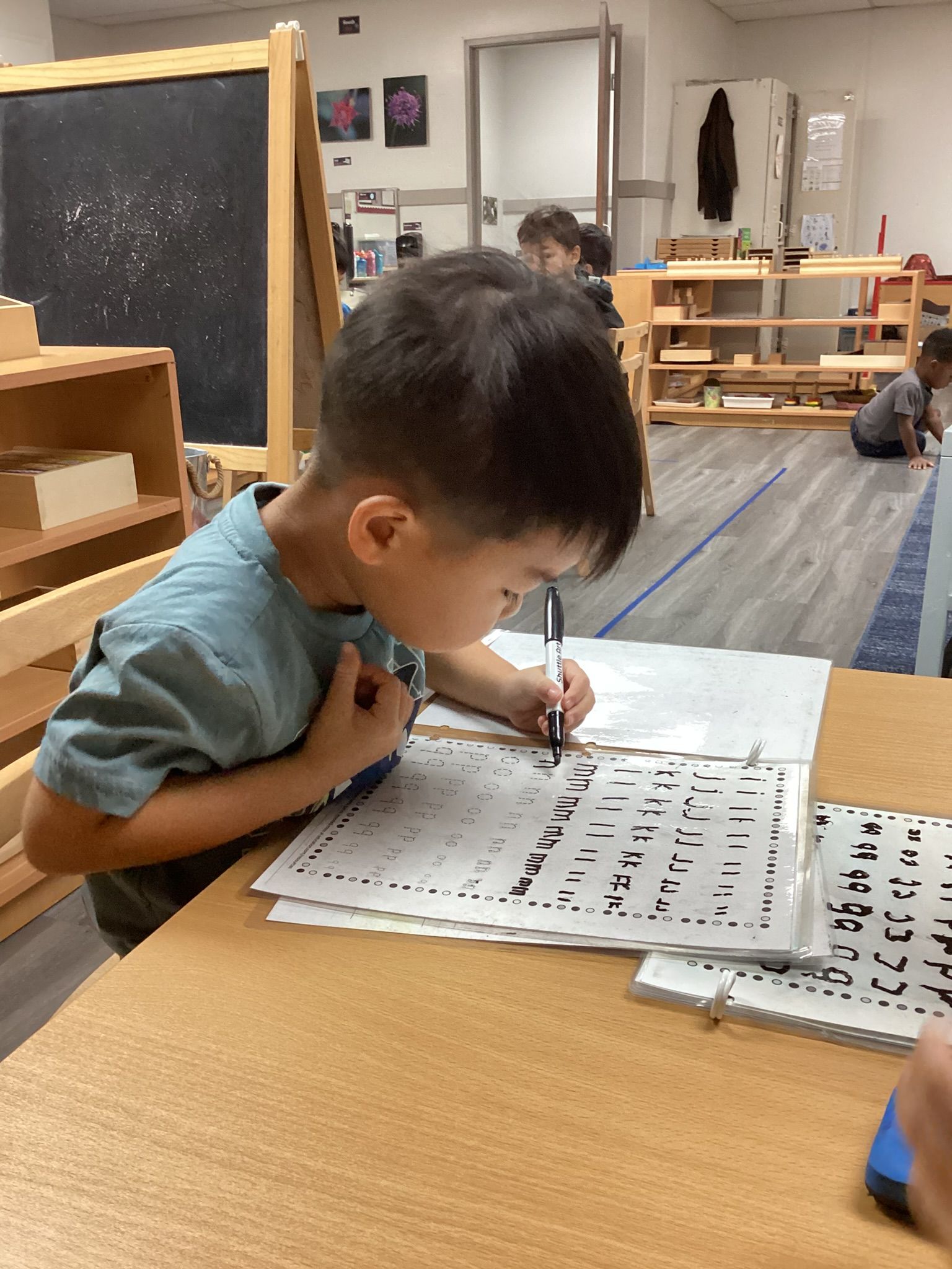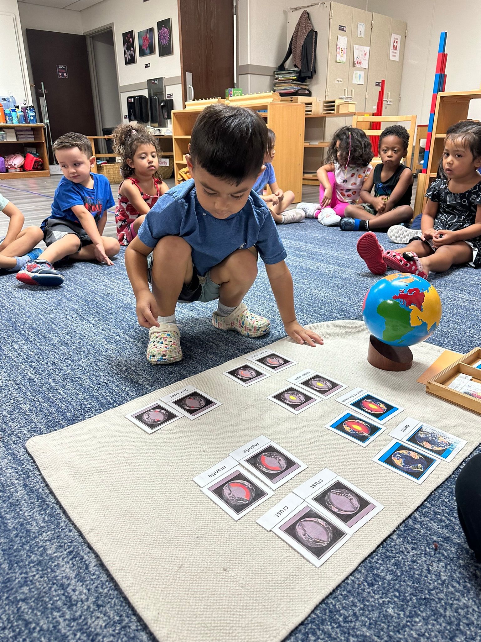 We learned the seven continents and colored a globe to understand the specific colors of the continents. The children also learn the difference between a globe vs a map. They worked on practical life and vocabulary that describes the difference between large and small, heavy and lighter. They used tongs, basting, lids, containers, tweezers, locks and keys. For language, the children worked with matching cards, three-part cards, memory games, tracing and writing letters. They also worked on their phonics. The book for the month was The Kissing Hand by Audrey Penn. The children learned how to sit at circle time. For Math they worked on association of number rods and cards. They learned to count with a spindle box, and how to trace numbers with the sandpaper numbers, also counting and tracing numbers from 1-10. For the special days the children participated in share days and being snack host. For enrichment the children enjoyed using the computers, cooking, music, art and gardening.