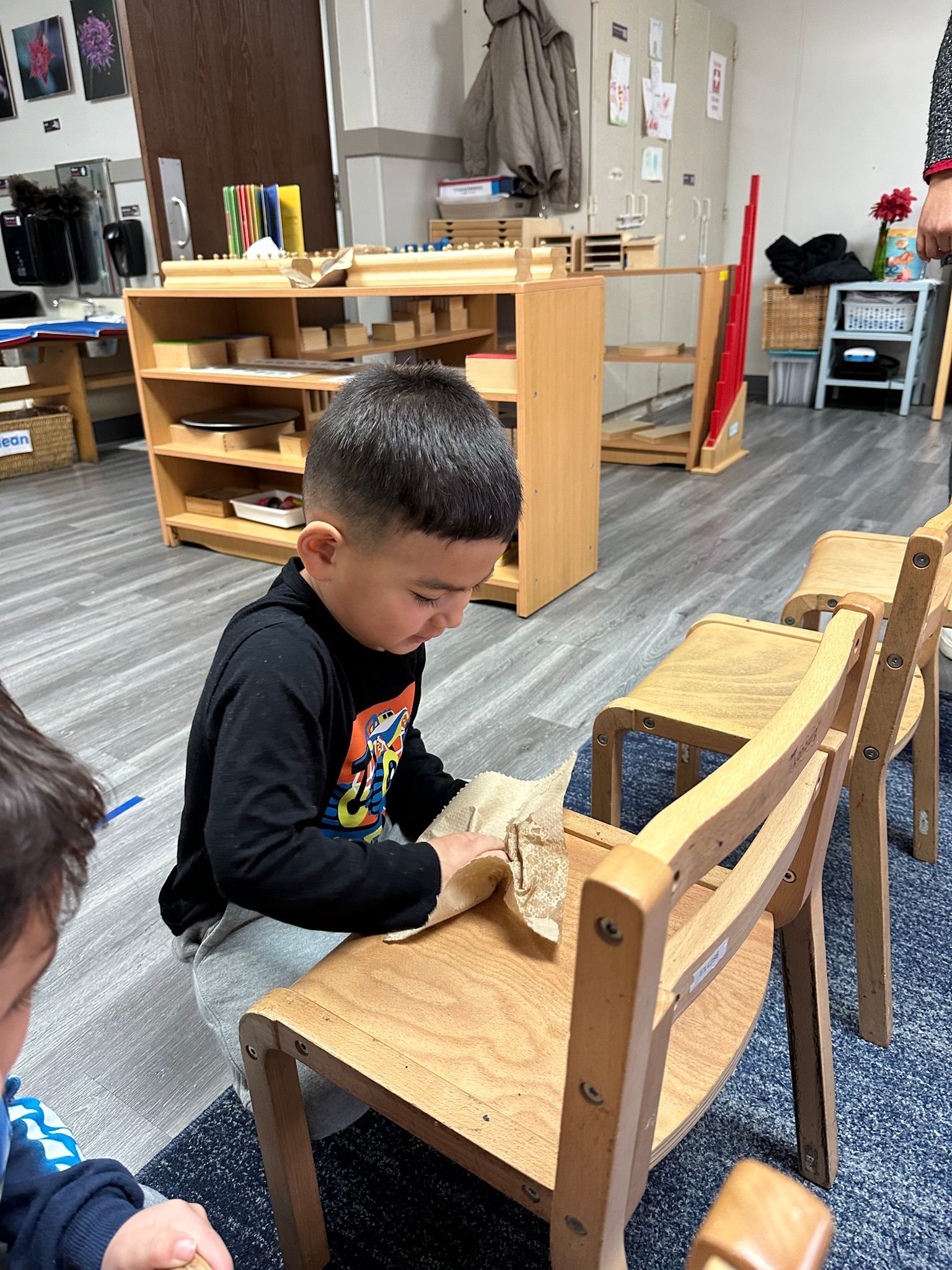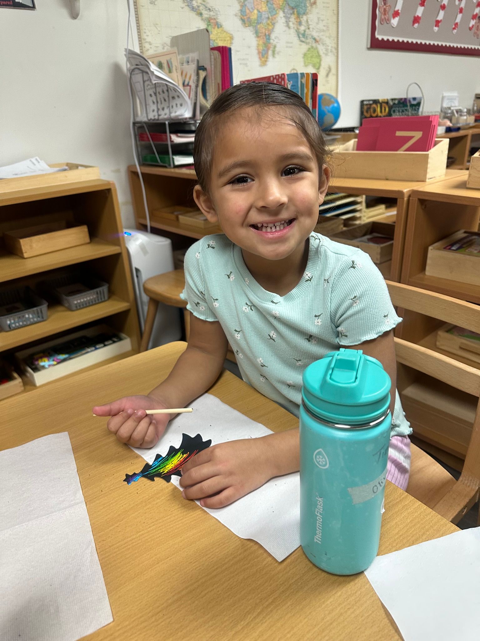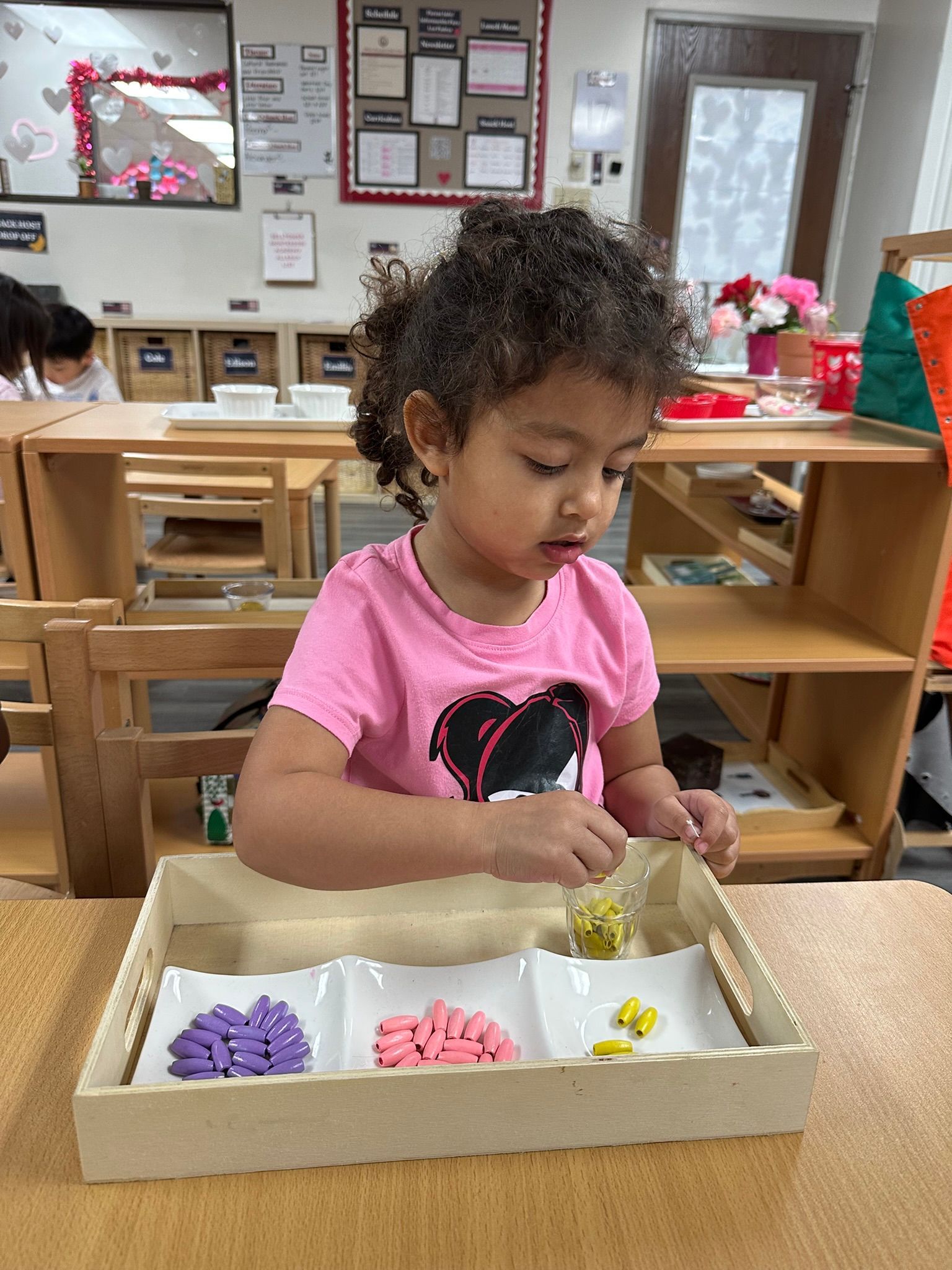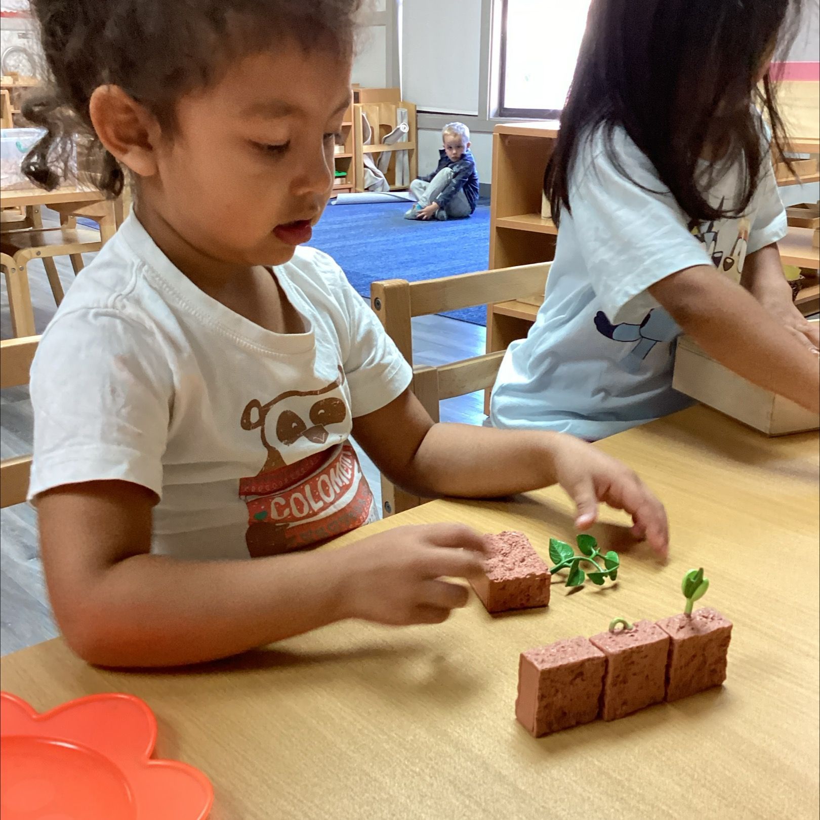 We learned the seven continents and colored a globe to understand the specific colors of the continents. The children also learn the difference between a globe vs a map. They worked on practical life and vocabulary that describes the difference between large and small, heavy and lighter. They used tongs, basting, lids, containers, tweezers, locks and keys. For language, the children worked with matching cards, three-part cards, memory games, tracing and writing letters. They also worked on their phonics. The book for the month was The Kissing Hand by Audrey Penn. The children learned how to sit at circle time. For Math they worked on association of number rods and cards. They learned to count with a spindle box, and how to trace numbers with the sandpaper numbers, also counting and tracing numbers from 1-10. For the special days the children participated in share days and being snack host. For enrichment the children enjoyed using the computers, cooking, music, art and gardening.