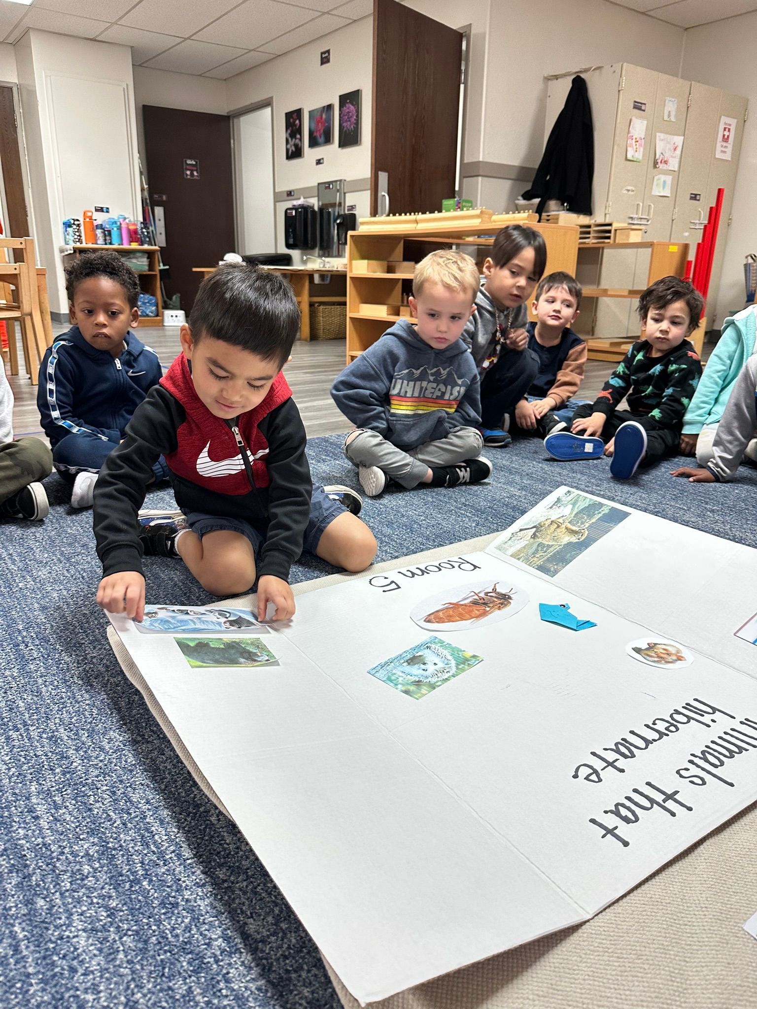 The children had the opportunity to learn what animals need to hibernate, the places they hibernate, and for how long. They sorted the animals that hibernate from the animals that do not. We learned a hibernation song and that is how the children learned about the different environments for hibernation. A common animal we looked at was penguins and the different species.