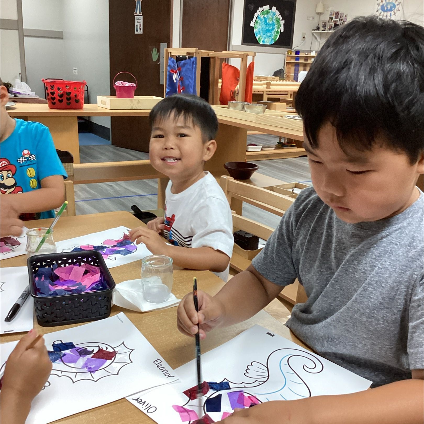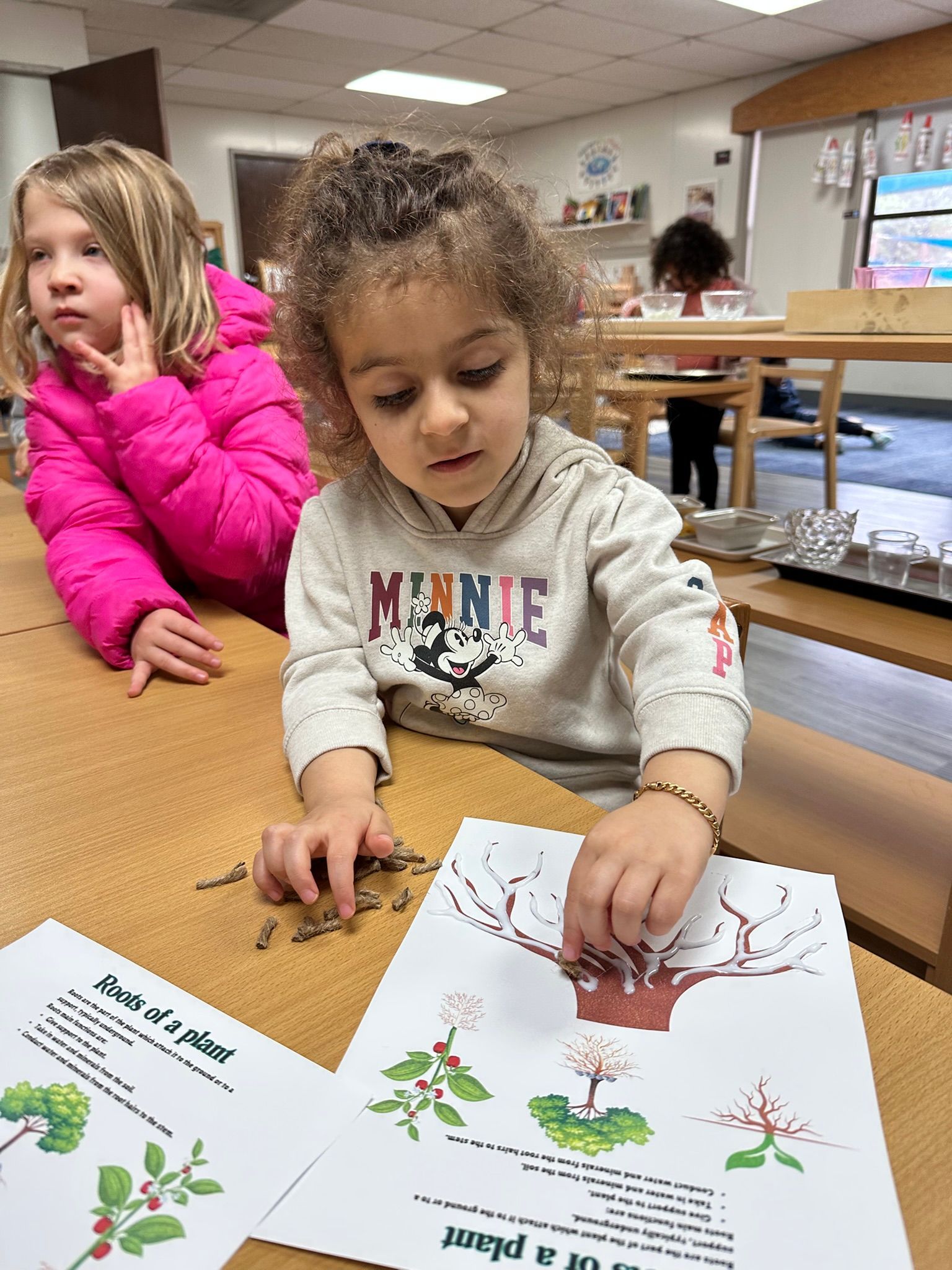 Our Montessori jobs included zoology, and they worked with three-part cars panda bears, elephants, and silkworms. The next was botany, where they worked with parts of the roots, parts of the tree, and parts of the flower. For science, we studied water cycles. For art, they made friendship art, such as a handprint of best friends, cutting out little hearts, creating and best friend art. Along with practical life, sensorial, language, and math themes. For our next job, we learned about grace and courtesy, where they learned good manners, bathroom manners, and how to carry their belongings to school.