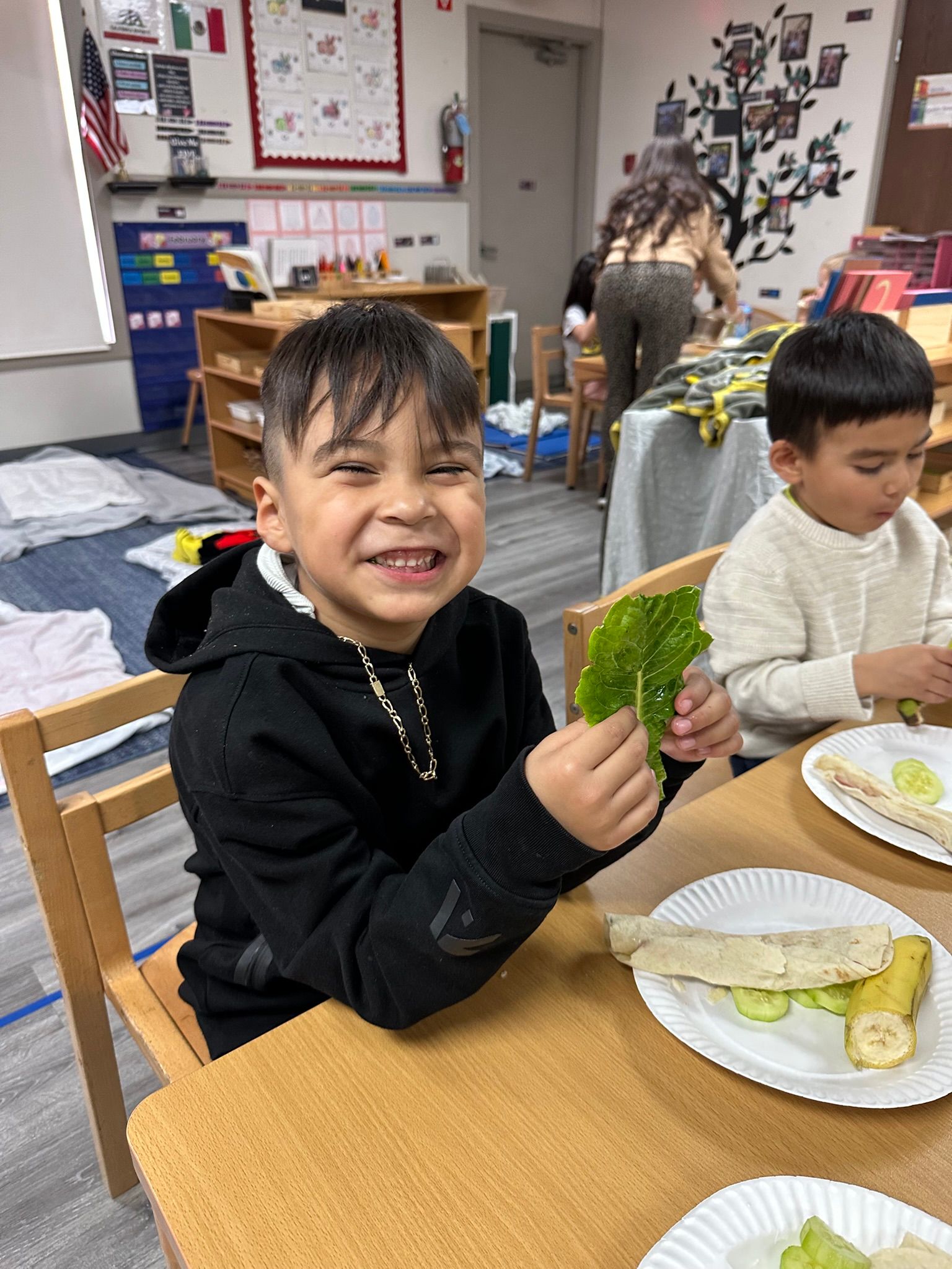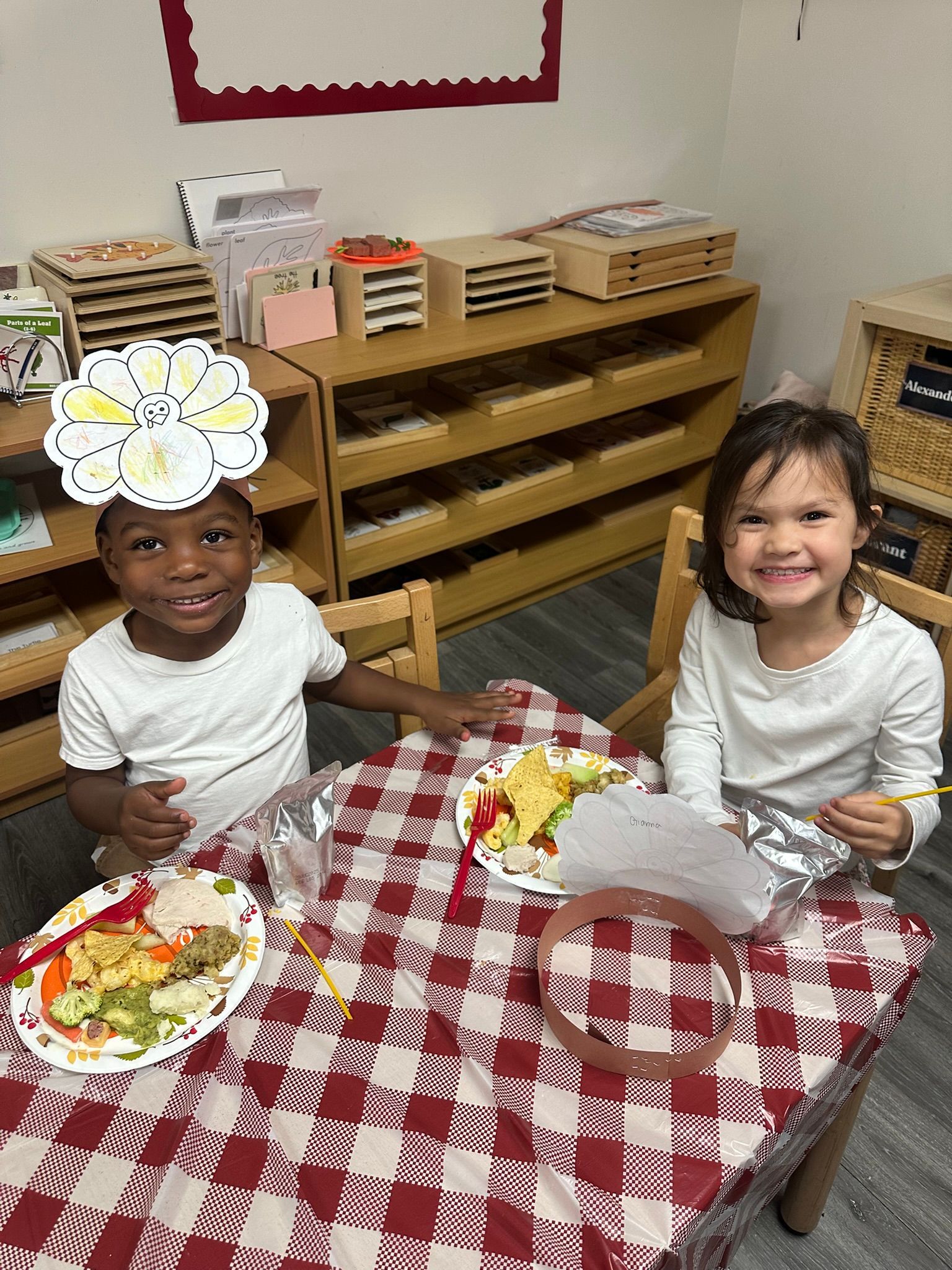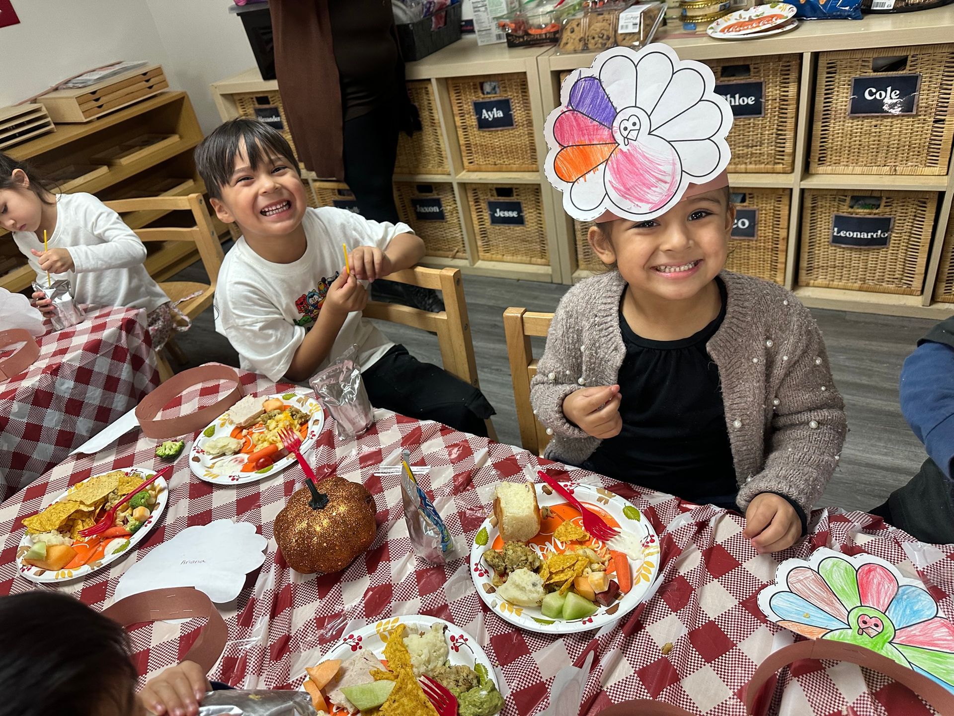 For Spanish the children learned the parts of the body, fruits and vegetables. They all shared what they were thankful in Spanish. The children loved their Thanksgiving party, and they learned the story behind the celebration.