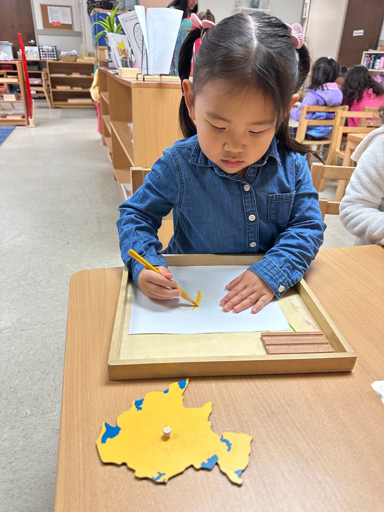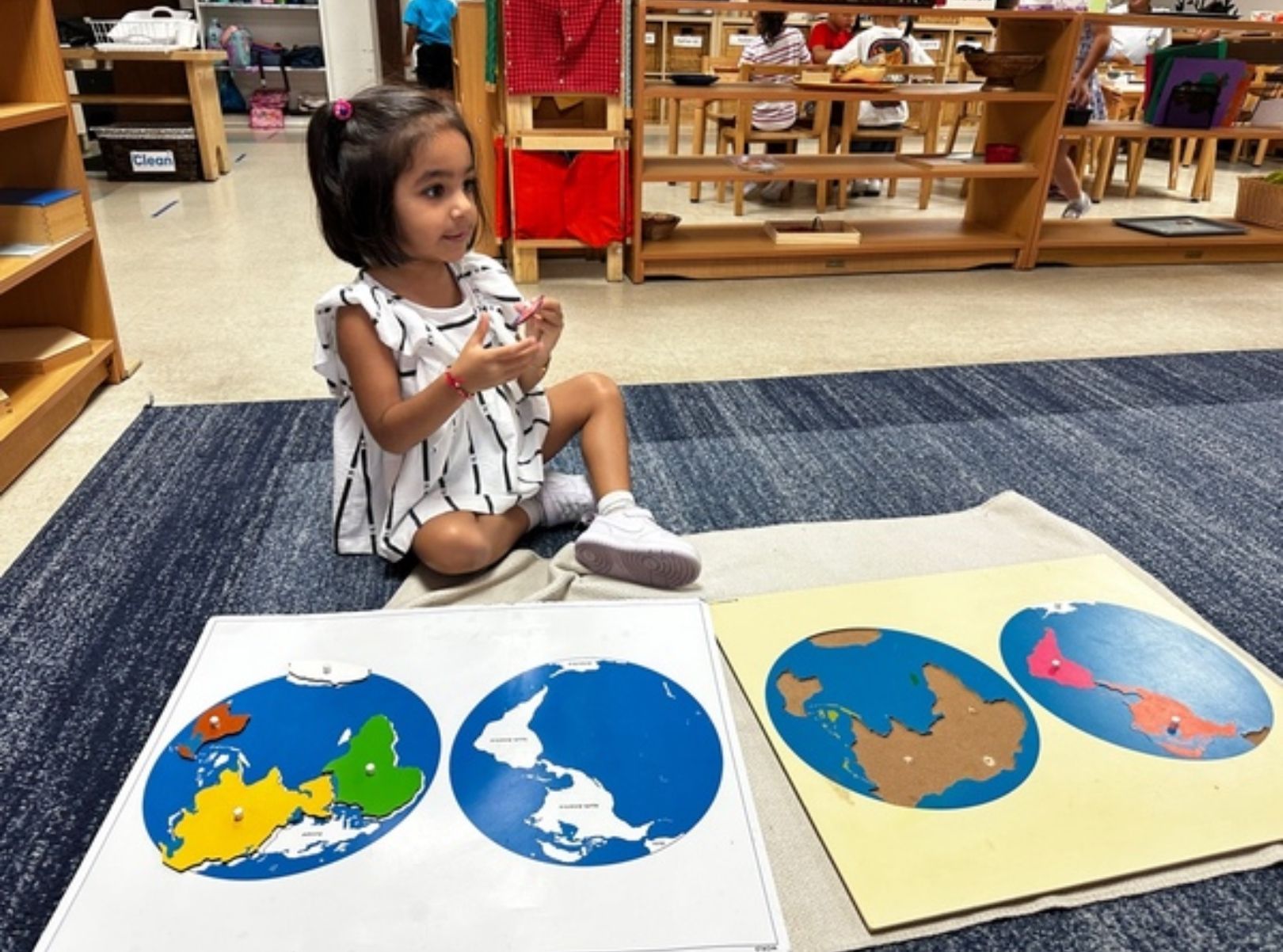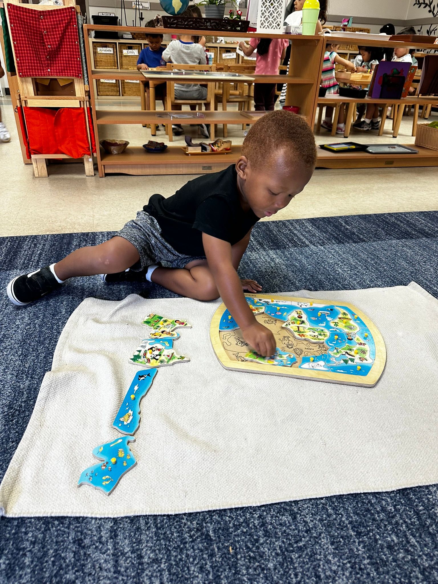 We have been going over all our classroom/playground rules and how we can maintain a clean environment. During the first month we also focused a lot on normalization of the classroom and routine. We learned how to use a dustpan and spray bottle to clean our tables. Children were also introduced to several Montessori jobs during our circle time like the pink tower and knobless cylinders. They have really enjoyed our practical life shelves. A couple of their favorite jobs were the lock and key and the 7 continents large map puzzle.