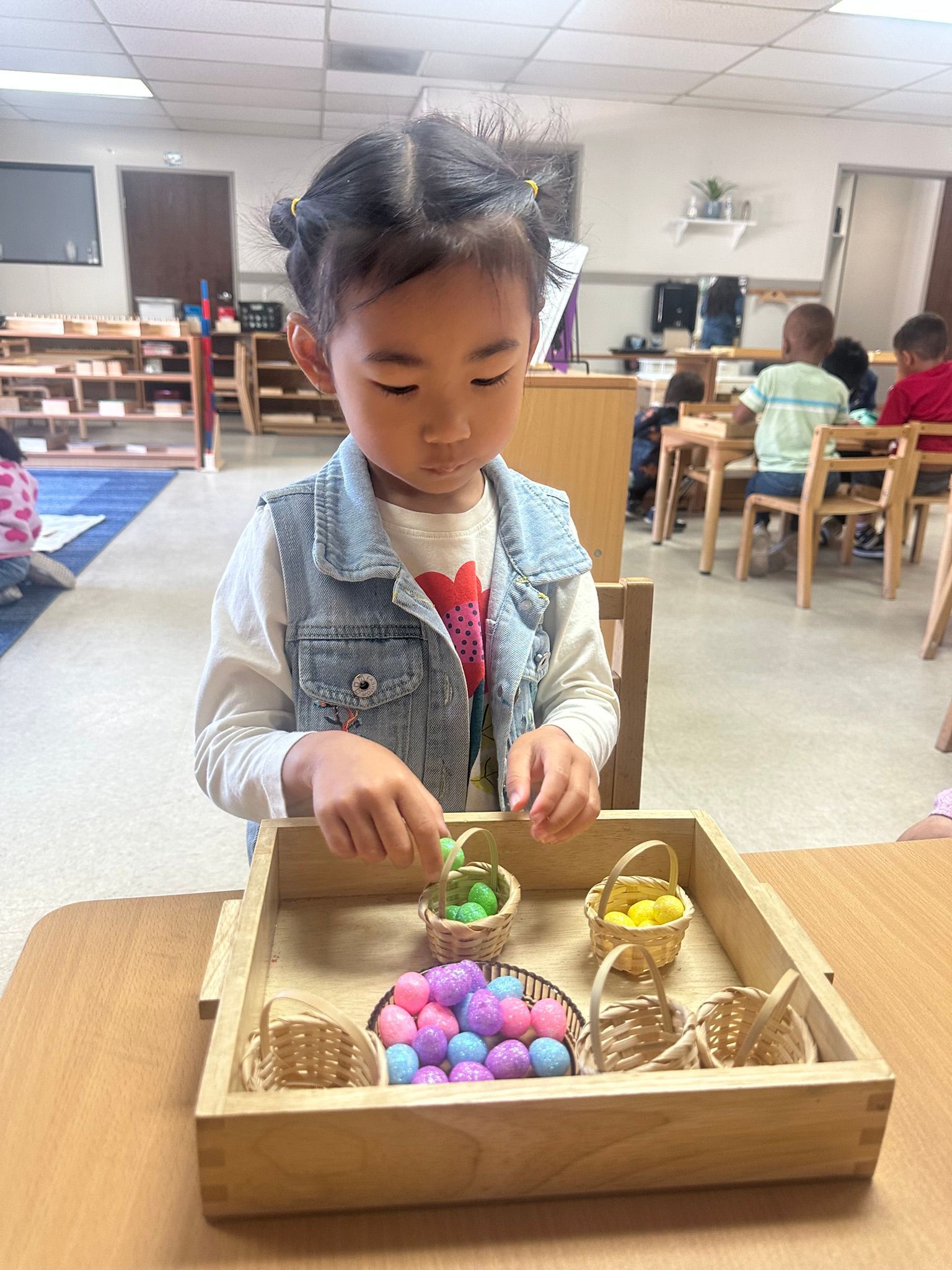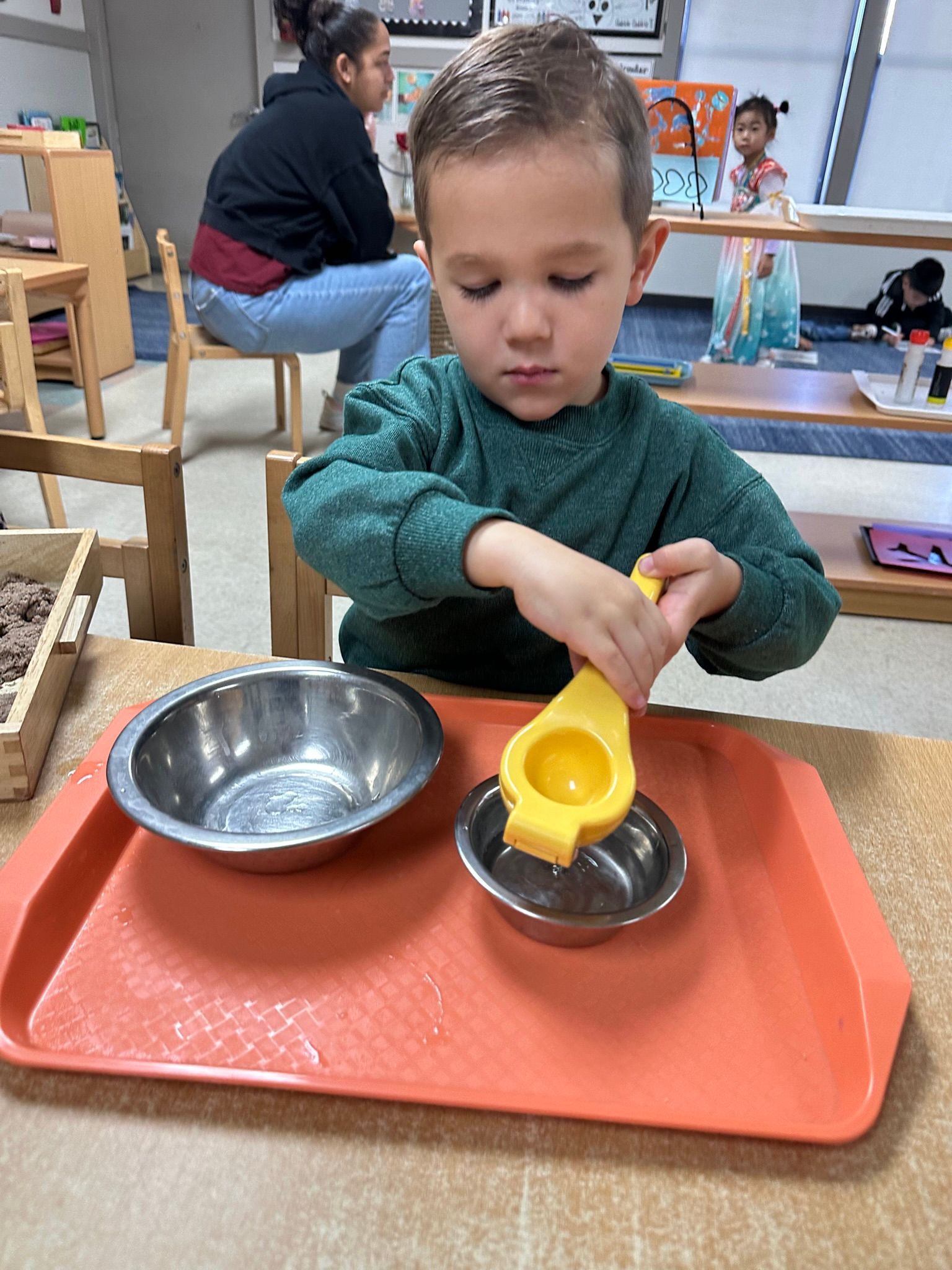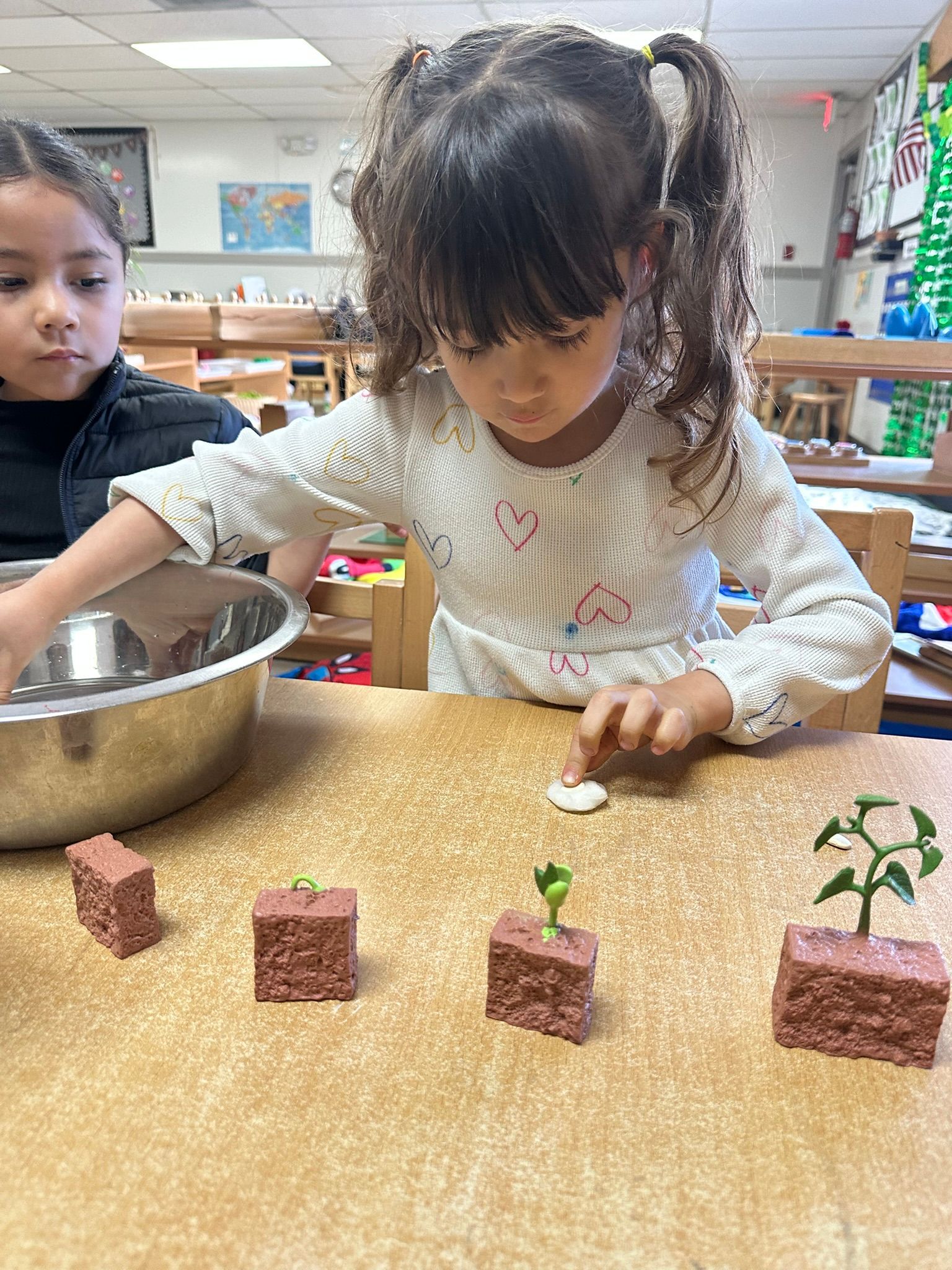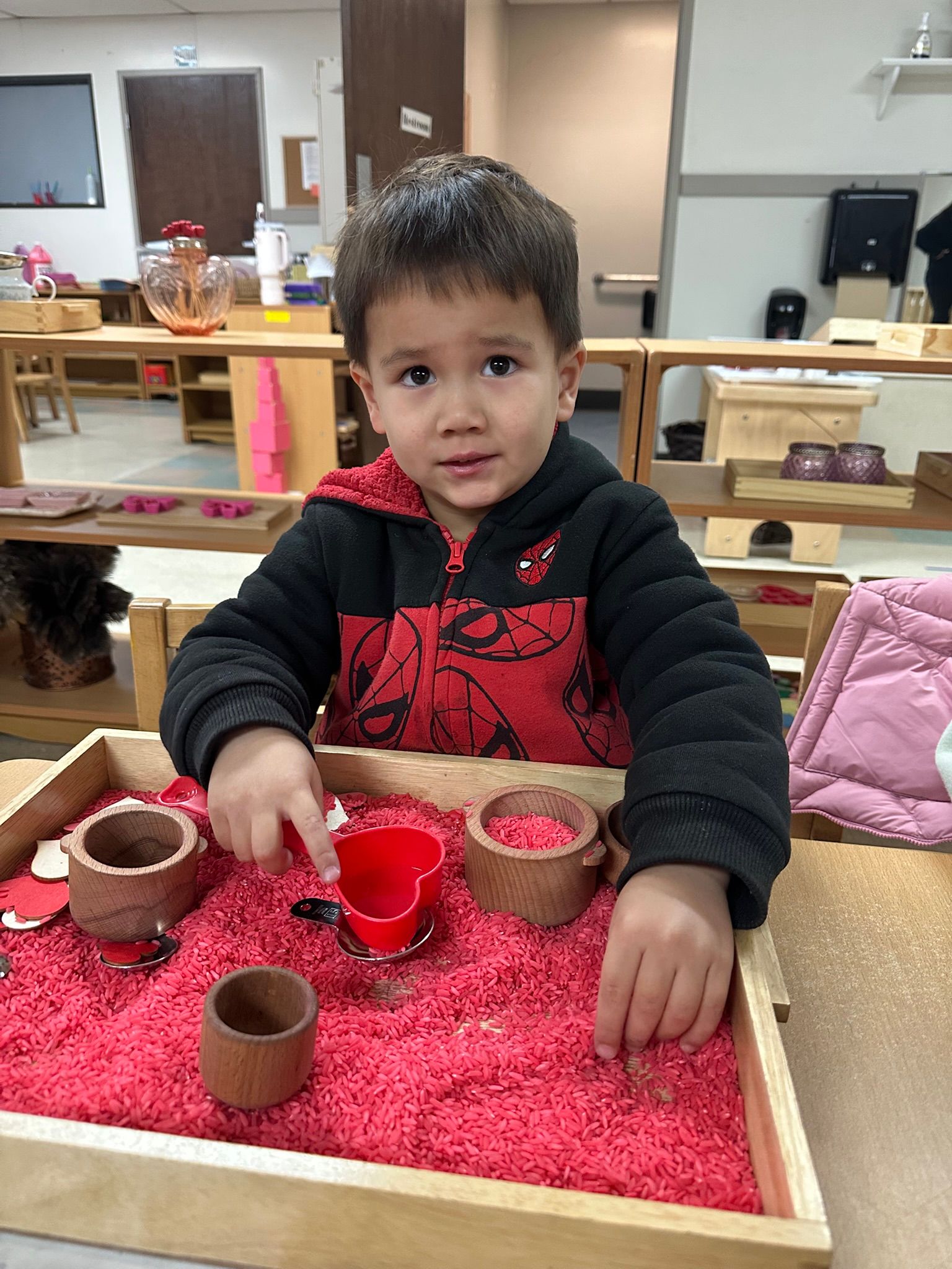 The children have been working on watering our garden plants. We enjoyed the fun spirit week we had with all the crazy hair, backwards clothes, sport day, superhero/princess, favorite color day! The children really enjoyed using the computers during our enrichment time. They have been practicing number order and writing. We continue practicing letter sounds and identifying their letters, as well as practicing their handwriting. We are enjoying our string work and pouring water work. We are continuing to practice our manners inside and out of the classroom.