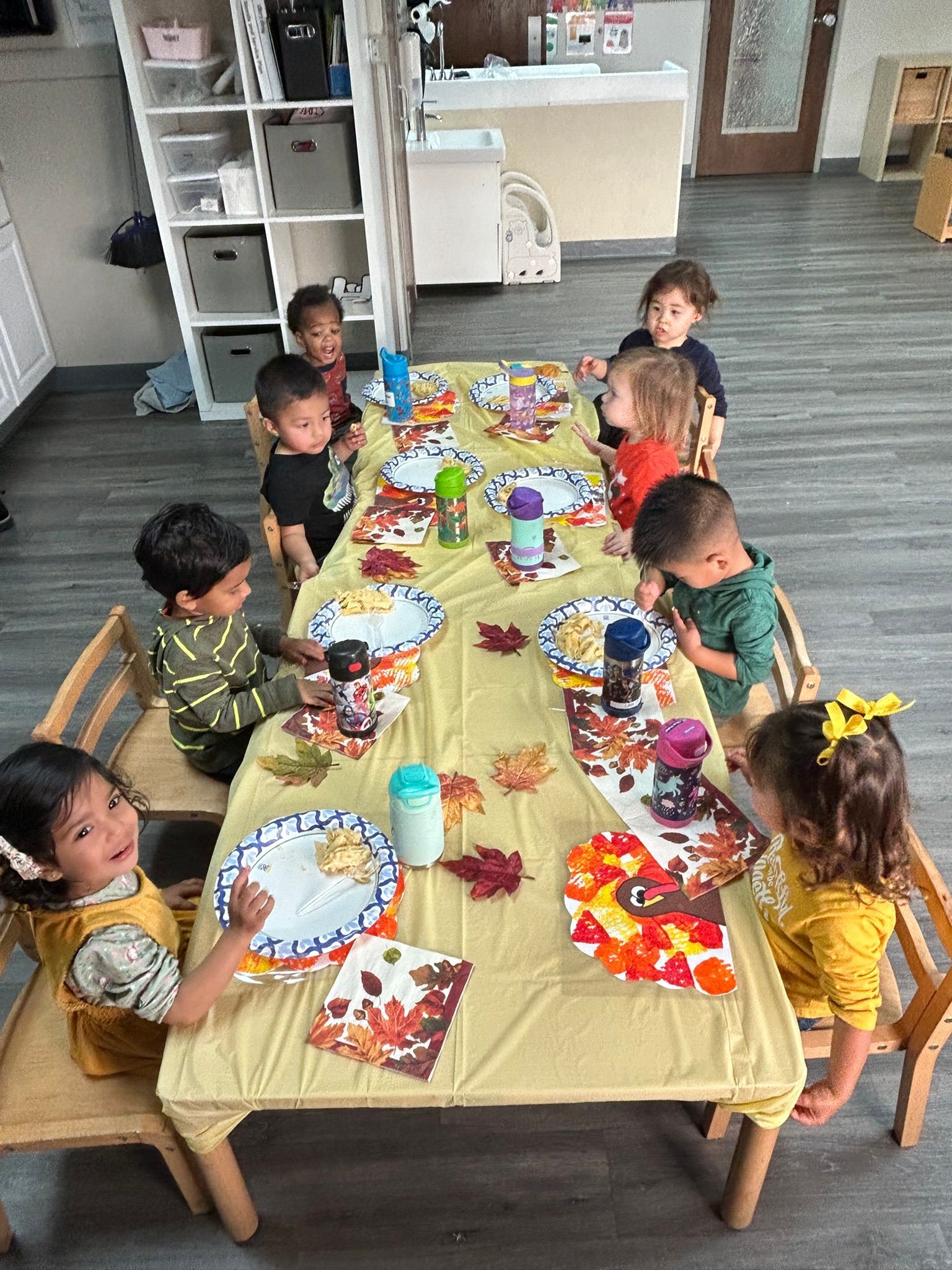 Our Montessori curriculum led us on a journey of discovery. We talked about the names of different fruits and vegetables and practiced cutting pretend fruit on a cutting board. We used magnifying glasses to explore our world map and to look at the leaves that have been falling on our playground. In the Math area we were given our first introduction to the bead stair, it helps us begin to understand the concept of quantity building and number to quantity association. In the Sensorial area we investigated different textures with our fabric matching job and the sandpaper boards. As always, we were introduced to our letters of the month I, J, and K. For art we did marble paintings to make fall leaves. We had a great time sharing and trying many different foods during our Thanksgiving Feast.