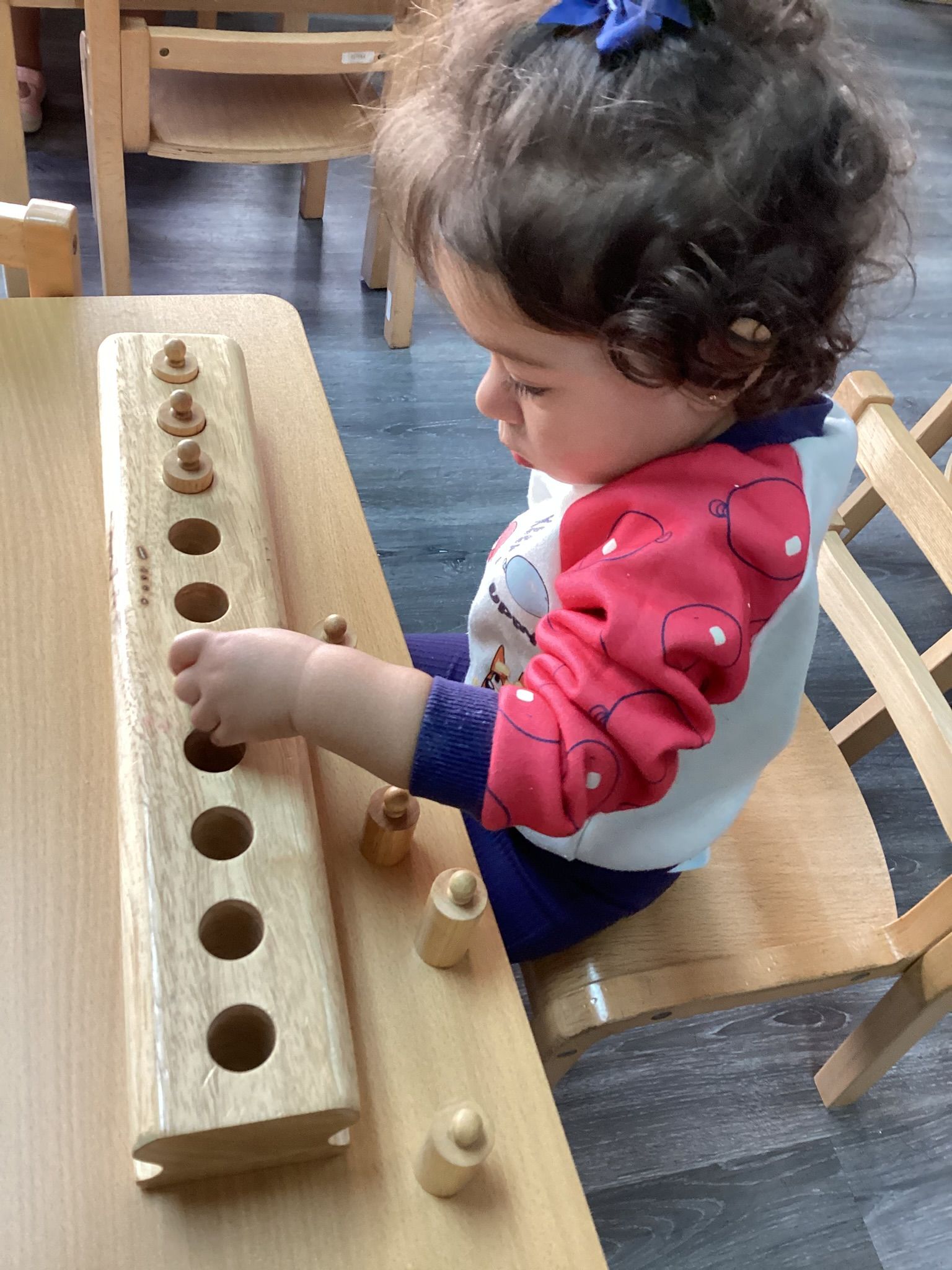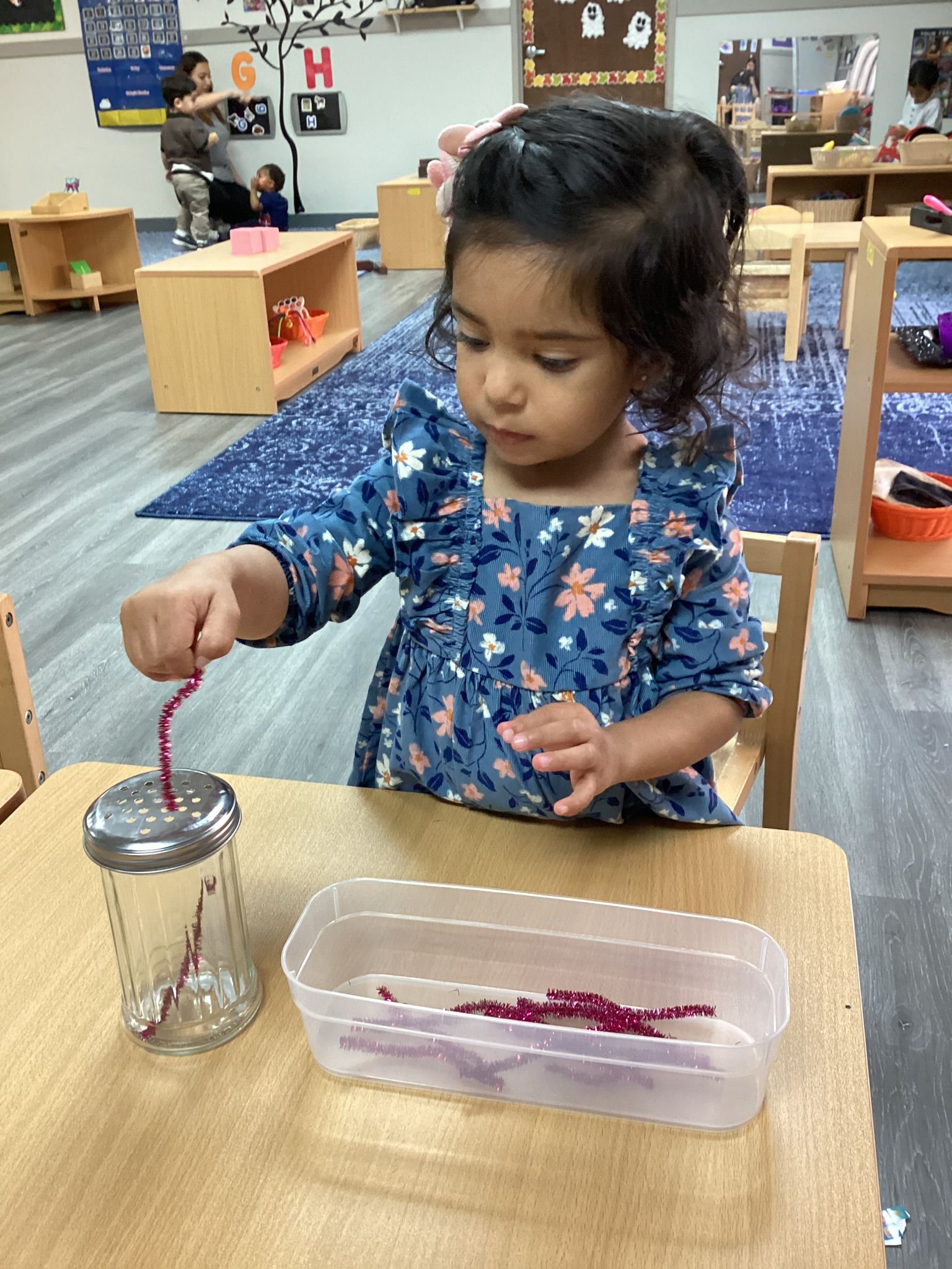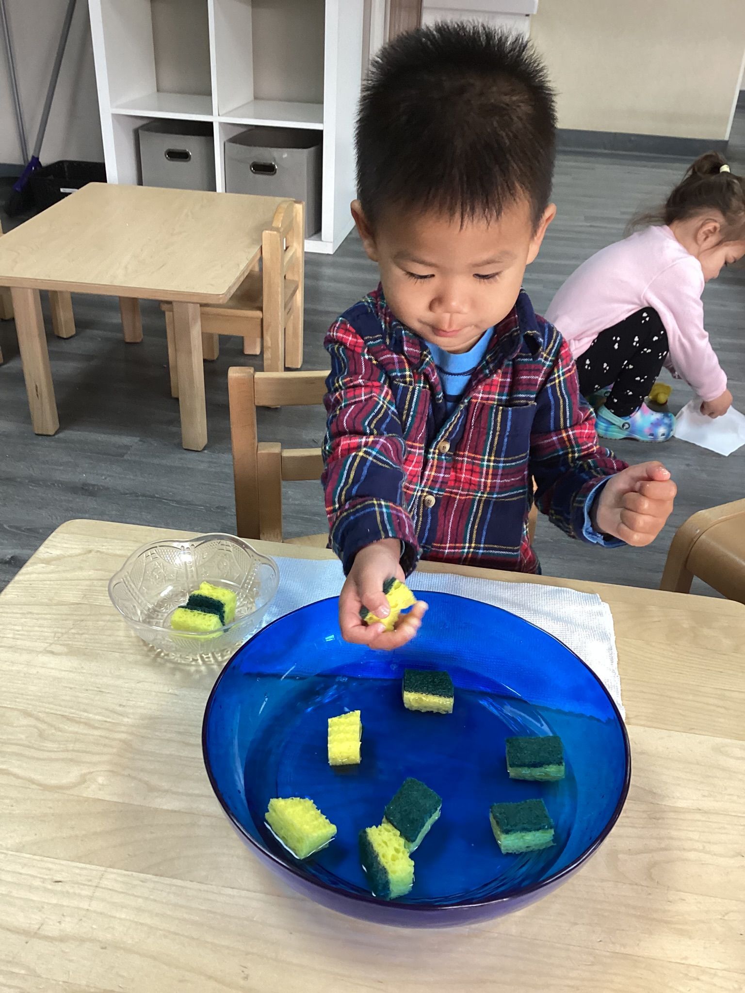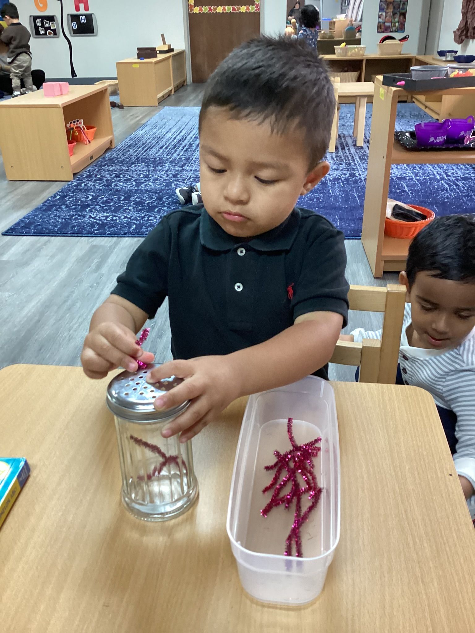 Our Montessori curriculum this month continued to focus on care of the environment, we practiced washing our tables and clearing our plates after lunch. Our book of the month, The Very Hungry Caterpillar, gave us a look at the life cycle of the butterfly and we had fun using chalk to make our flying butterfly art. In our cultural area we learned the names of some popular animals that are native to South America with our animal picture matching material. In the Sensorial area we introduced the words big and small and compared the two with the help of our pink tower. In the practical Life area, we spent our time strengthening our pincher grasp and our hand eye coordination with popsicle stick posting.