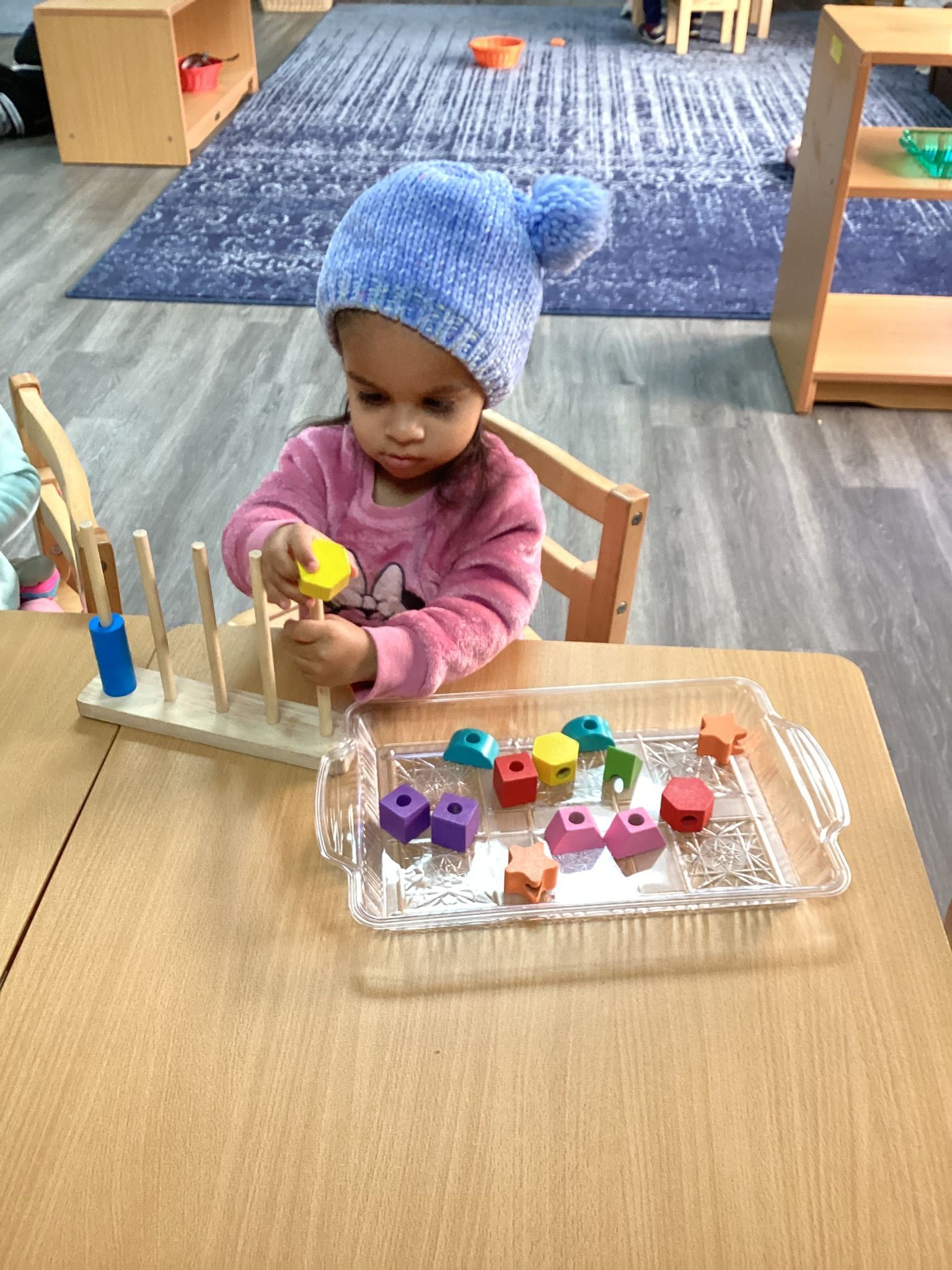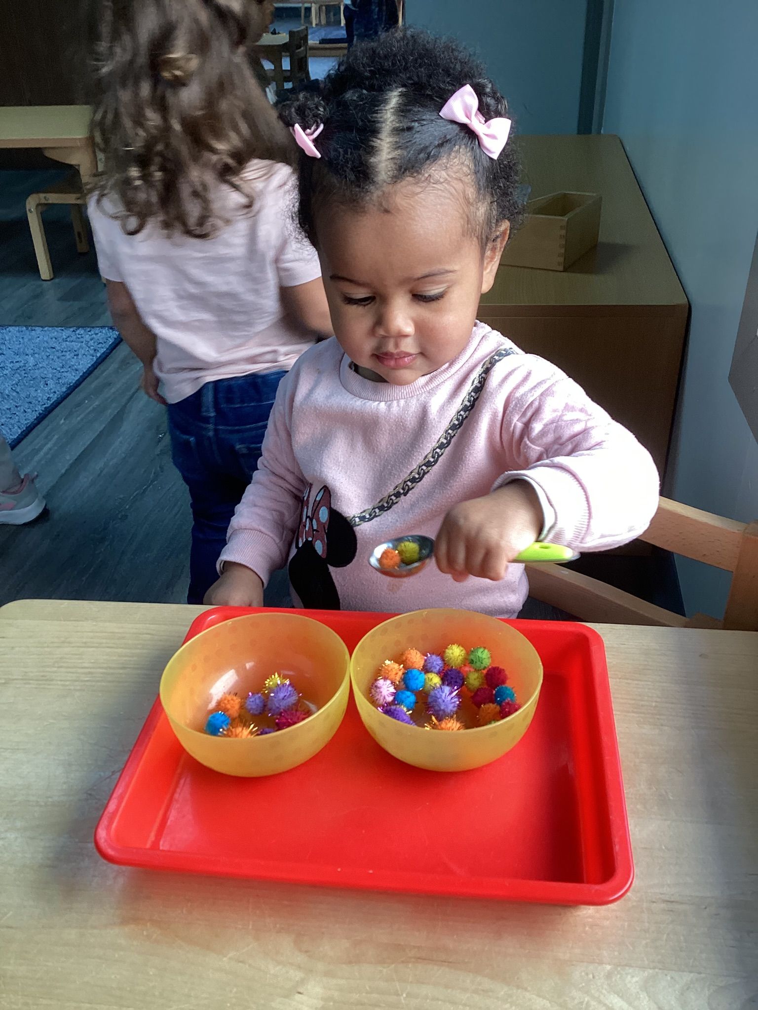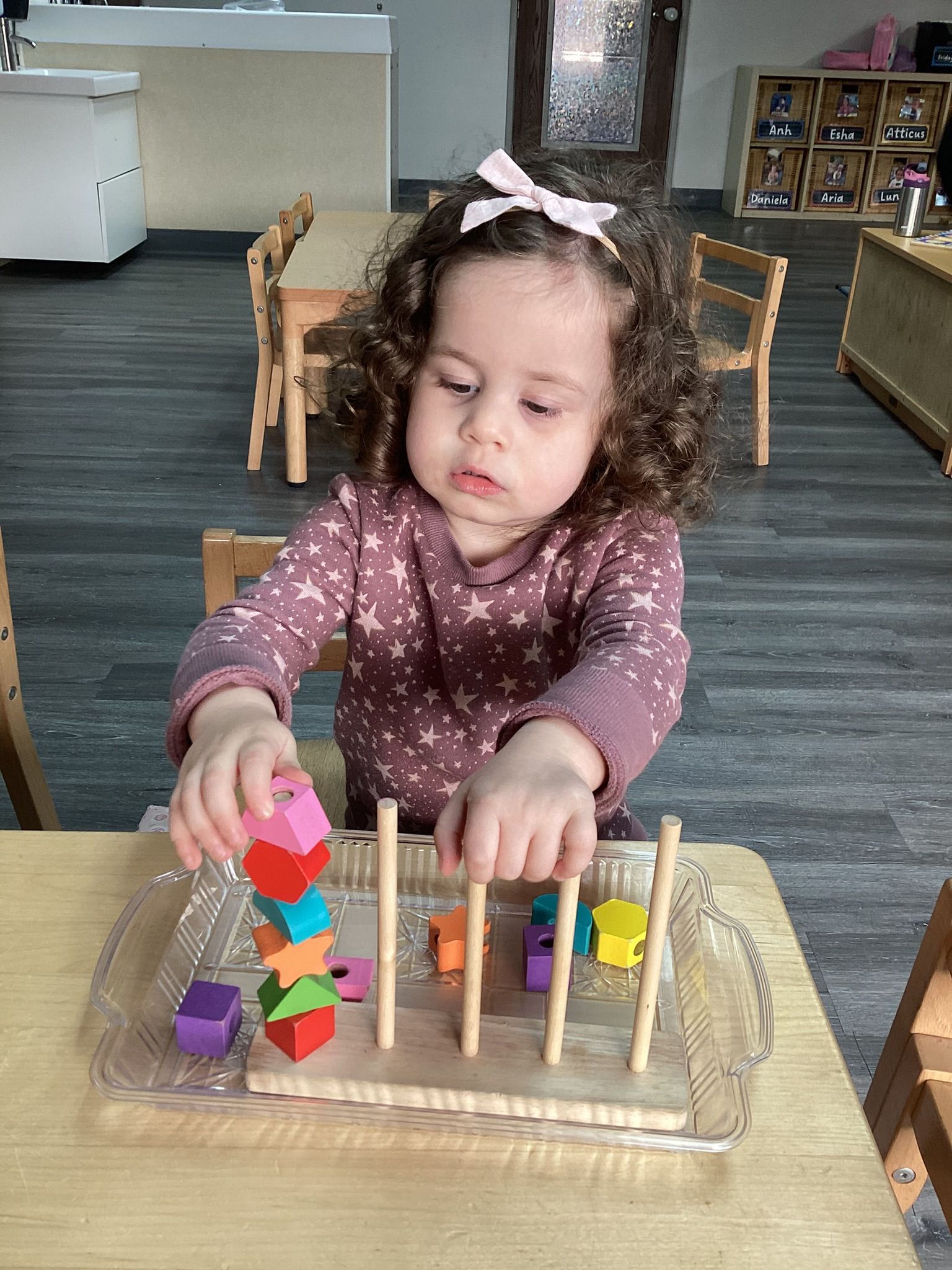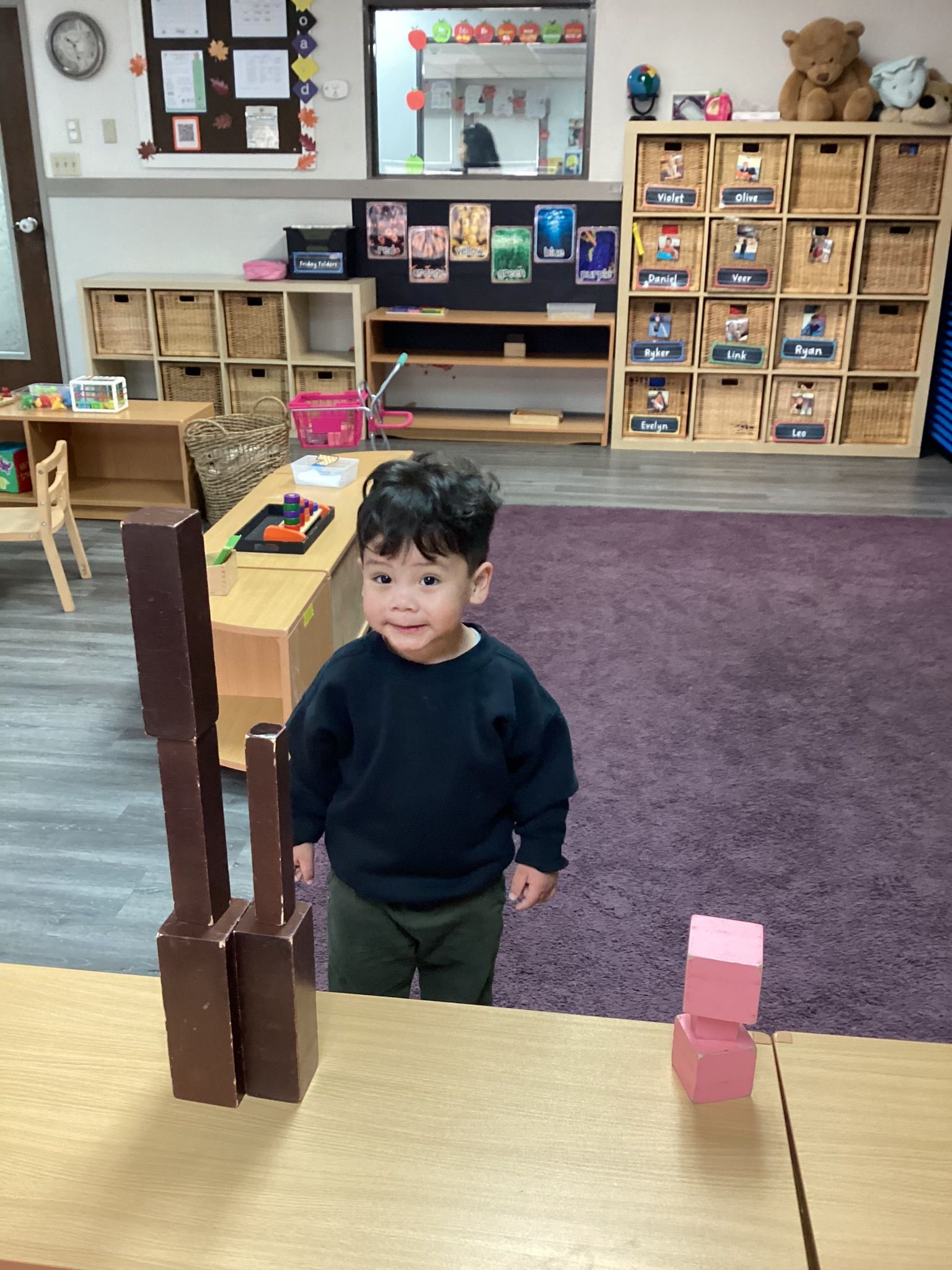 Our Montessori curriculum this month continued to focus on care of the environment, we practiced washing our tables and clearing our plates after lunch. Our book of the month, The Very Hungry Caterpillar, gave us a look at the life cycle of the butterfly and we had fun using chalk to make our flying butterfly art. In our cultural area we learned the names of some popular animals that are native to South America with our animal picture matching material. In the Sensorial area we introduced the words big and small and compared the two with the help of our pink tower. In the practical Life area, we spent our time strengthening our pincher grasp and our hand eye coordination with popsicle stick posting.