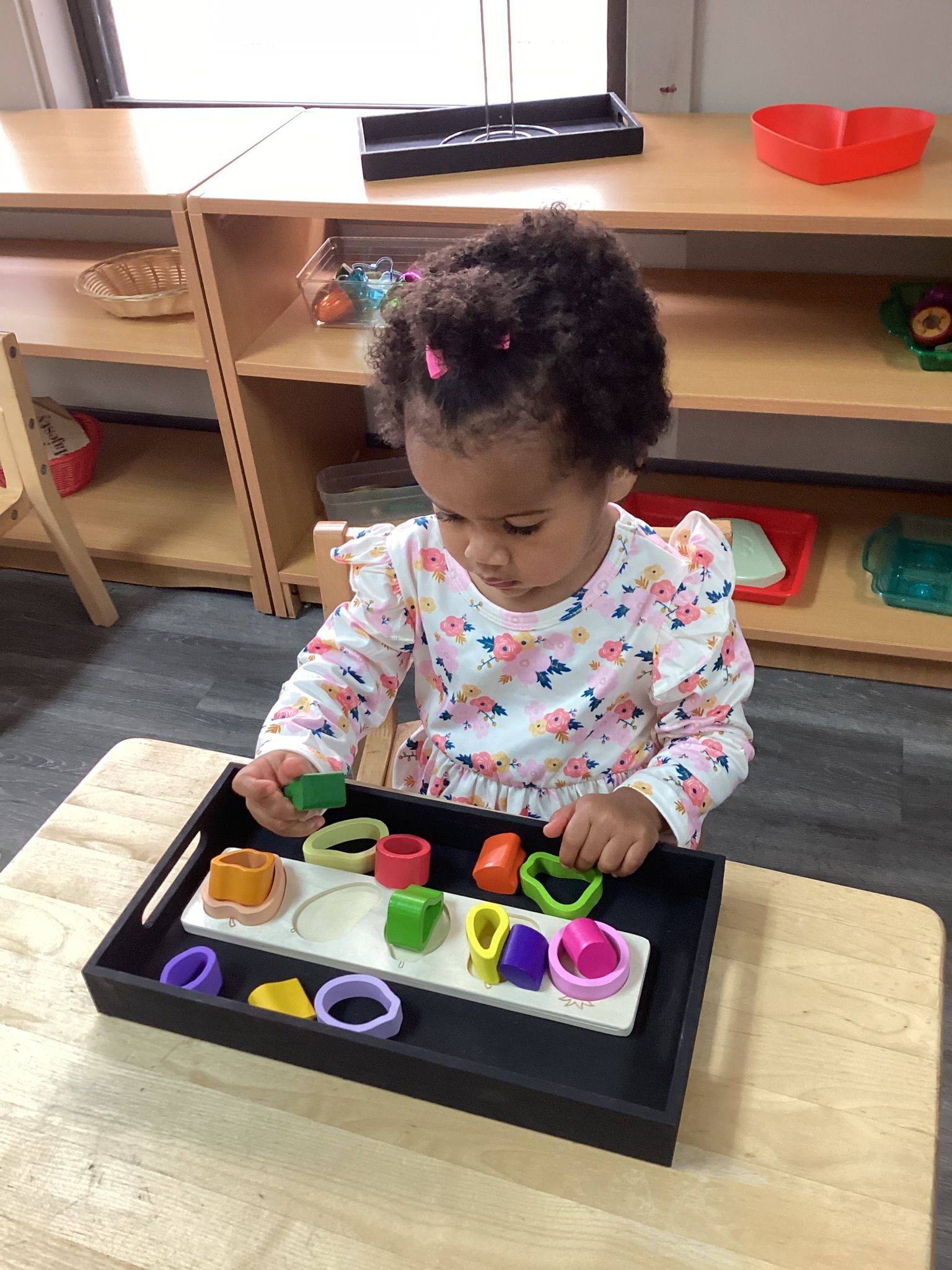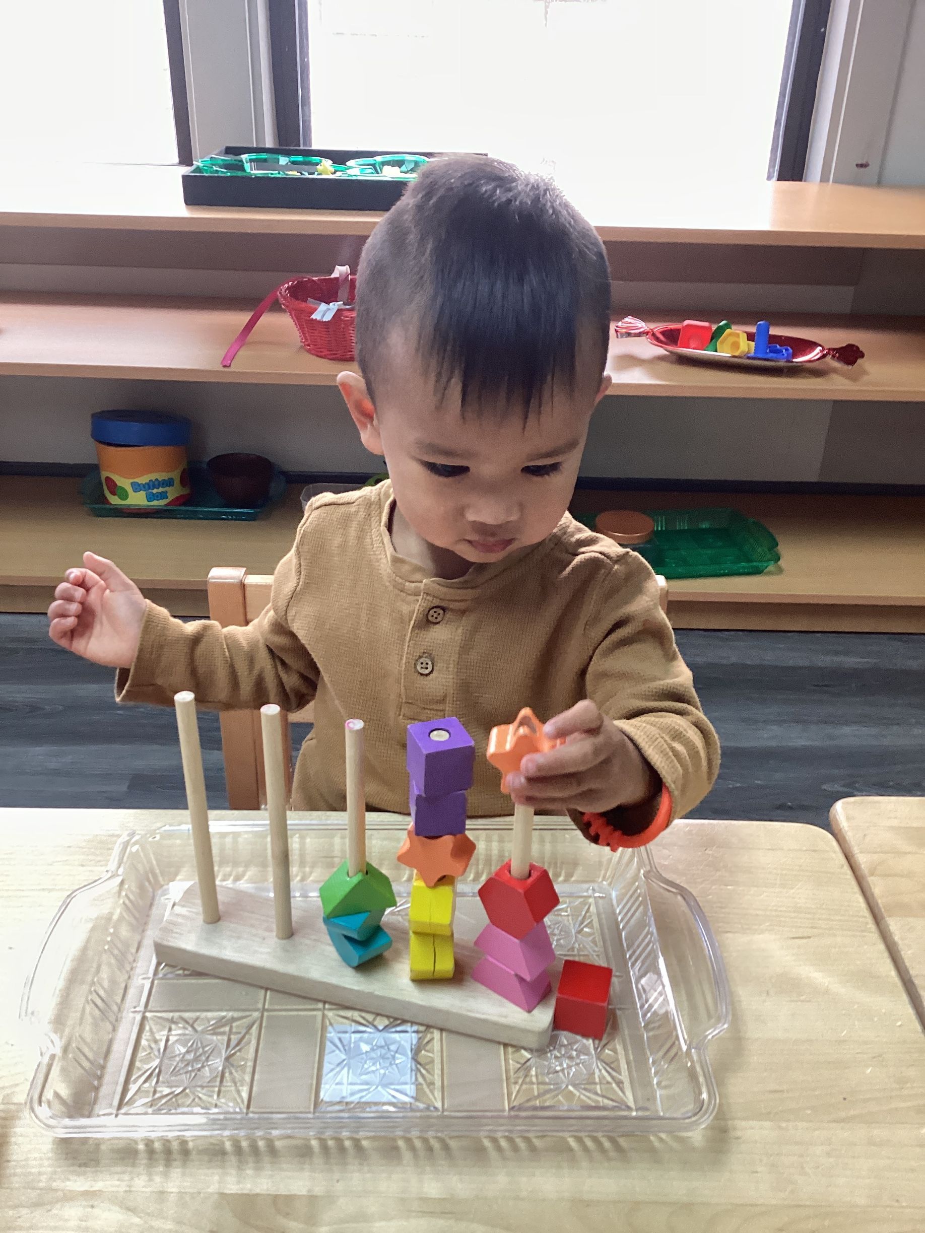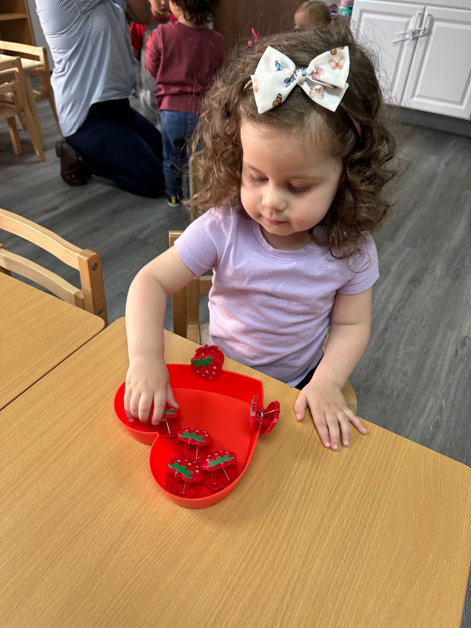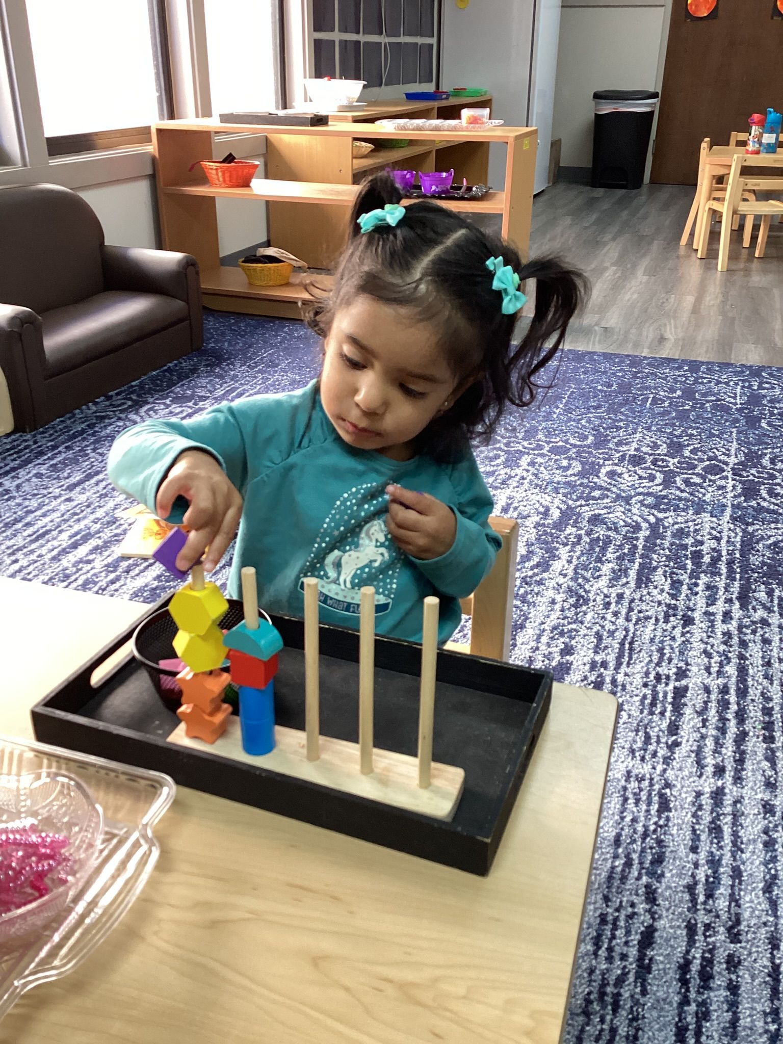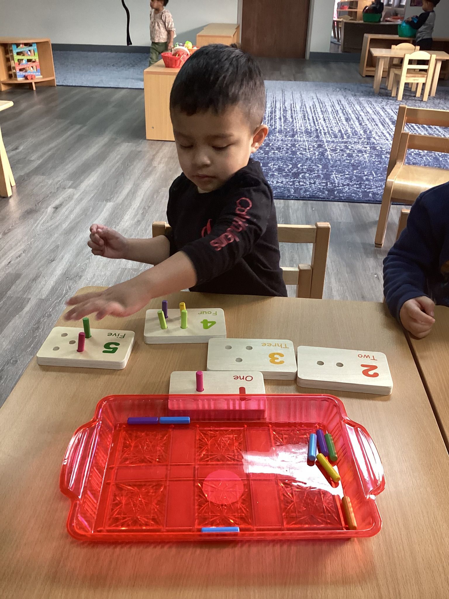 Our Montessori curriculum this month continued to focus on care of the environment, we practiced washing our tables and clearing our plates after lunch. Our book of the month, The Very Hungry Caterpillar, gave us a look at the life cycle of the butterfly and we had fun using chalk to make our flying butterfly art. In our cultural area we learned the names of some popular animals that are native to South America with our animal picture matching material. In the Sensorial area we introduced the words big and small and compared the two with the help of our pink tower. In the practical Life area, we spent our time strengthening our pincher grasp and our hand eye coordination with popsicle stick posting.