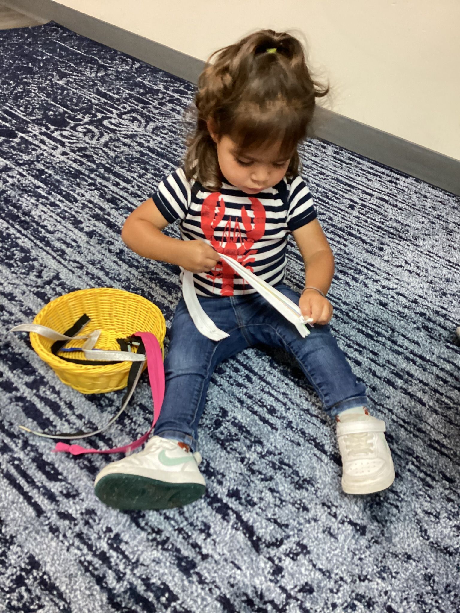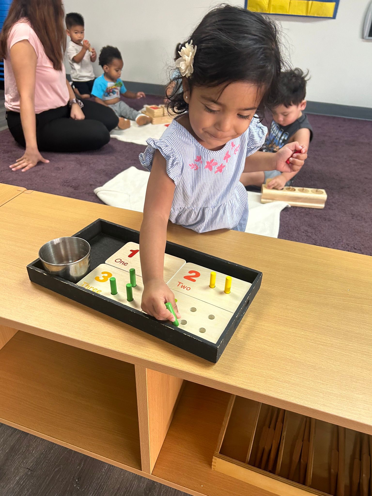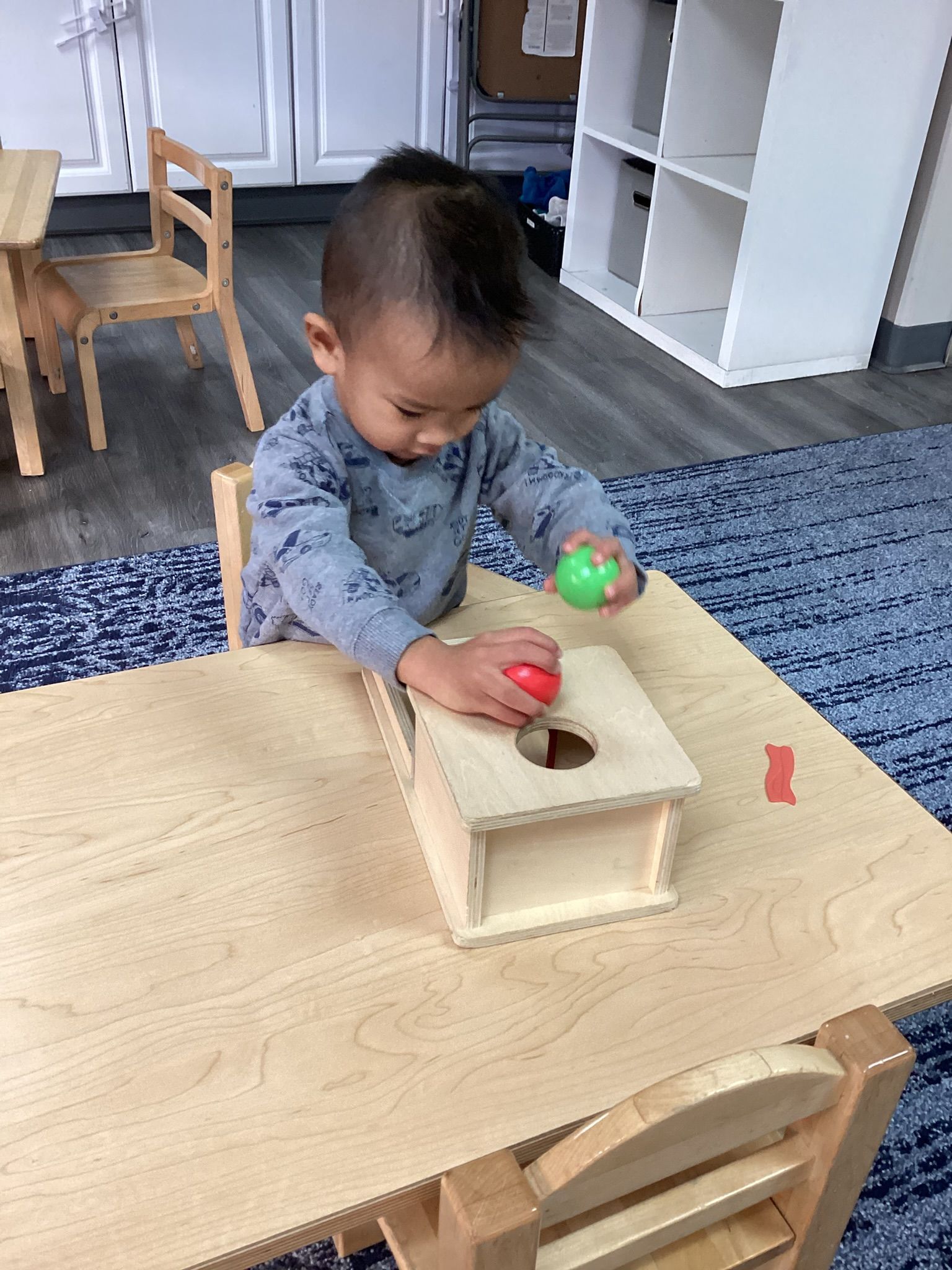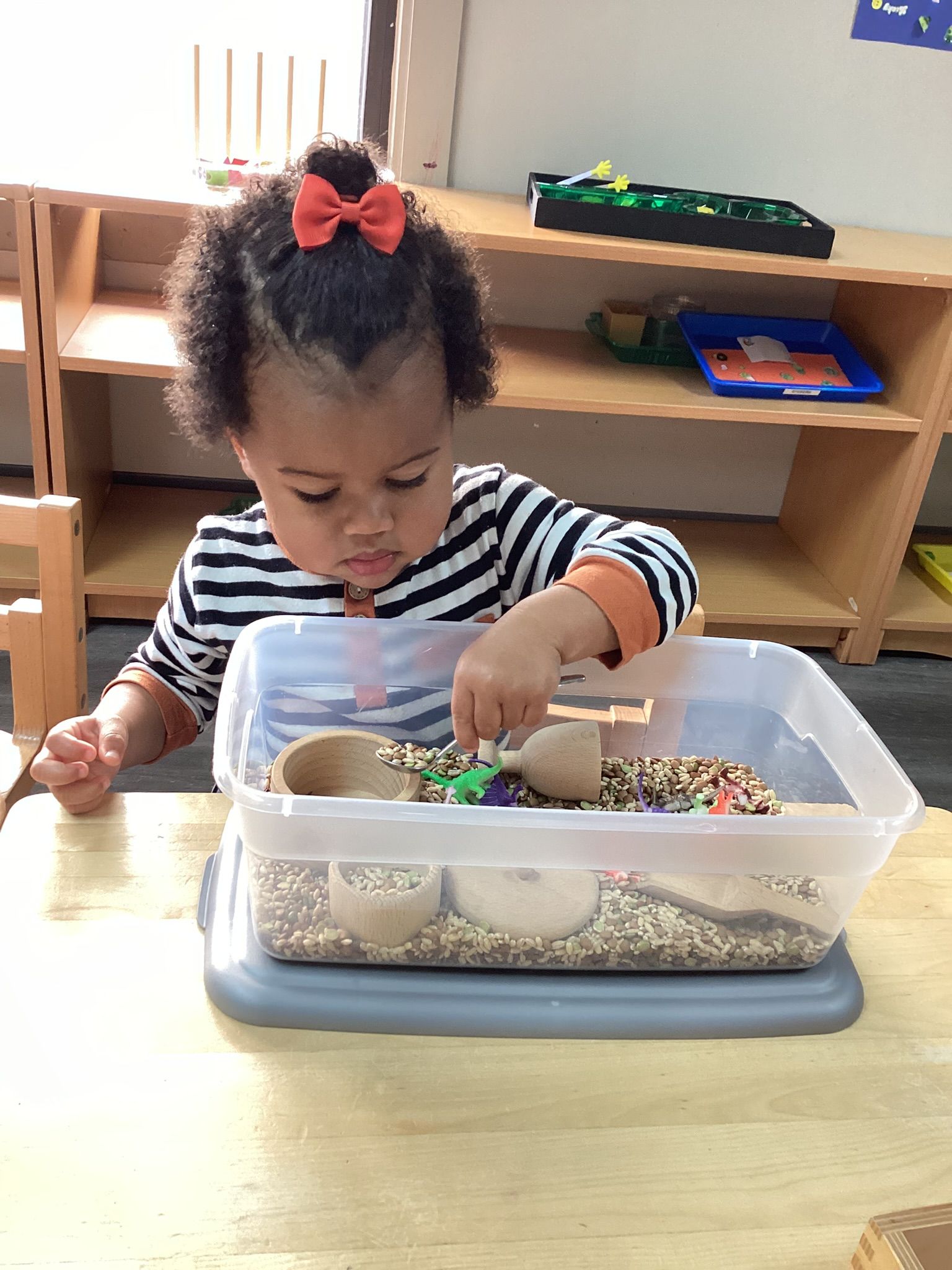 Our Montessori curriculum this month continued to focus on care of the environment, we practiced washing our tables and clearing our plates after lunch. Our book of the month, The Very Hungry Caterpillar, gave us a look at the life cycle of the butterfly and we had fun using chalk to make our flying butterfly art. In our cultural area we learned the names of some popular animals that are native to South America with our animal picture matching material. In the Sensorial area we introduced the words big and small and compared the two with the help of our pink tower. In the practical Life area, we spent our time strengthening our pincher grasp and our hand eye coordination with popsicle stick posting.