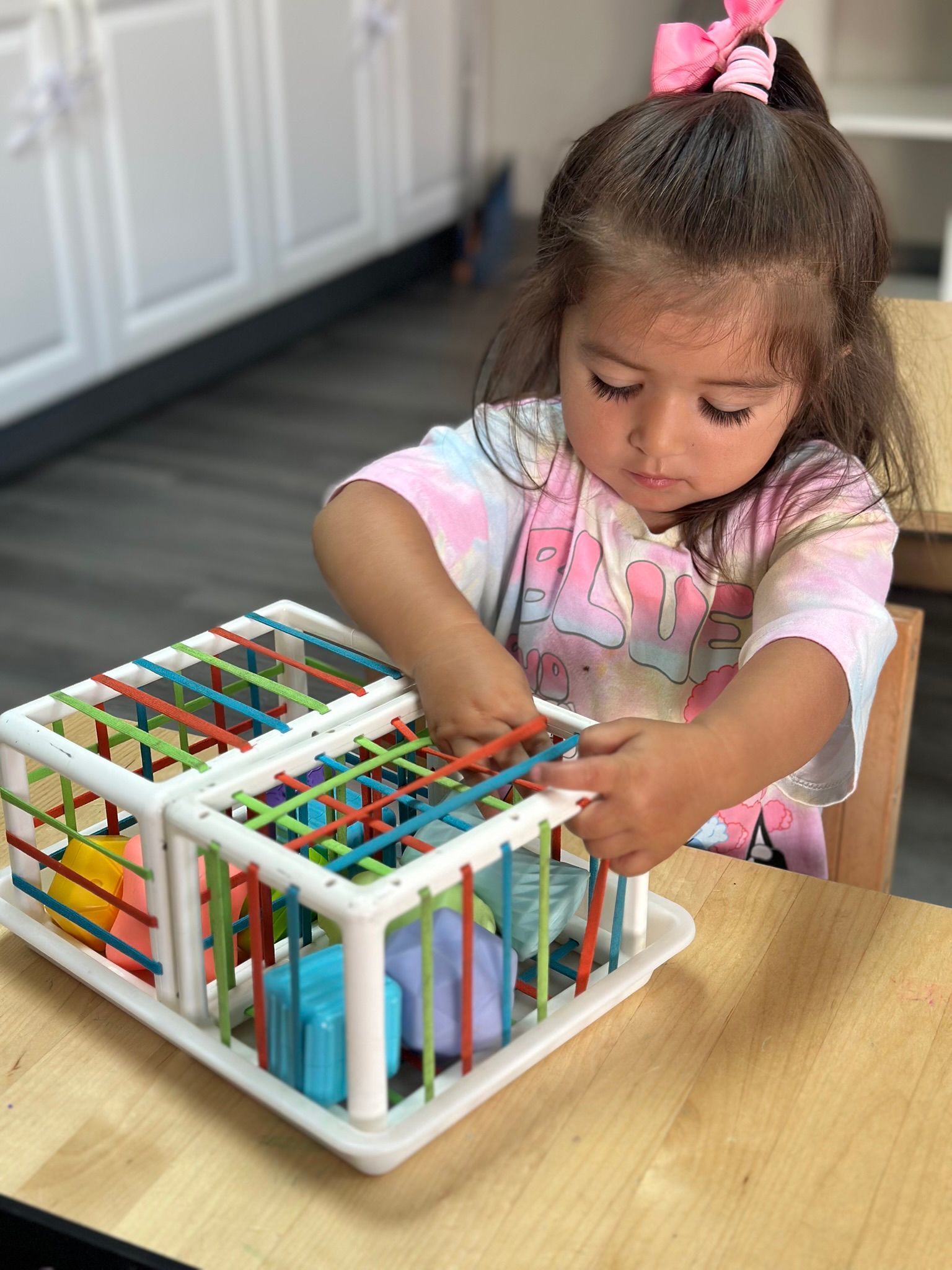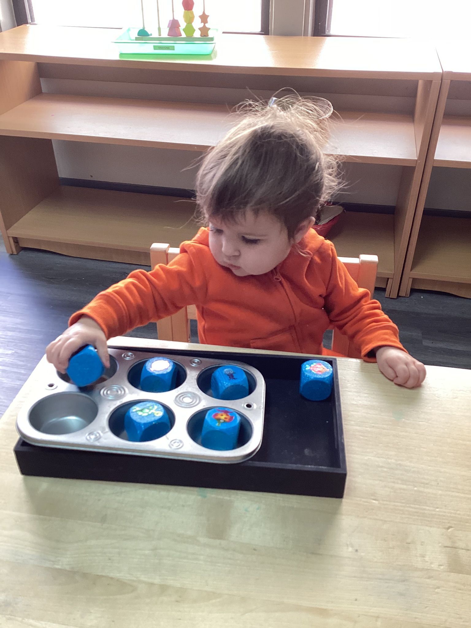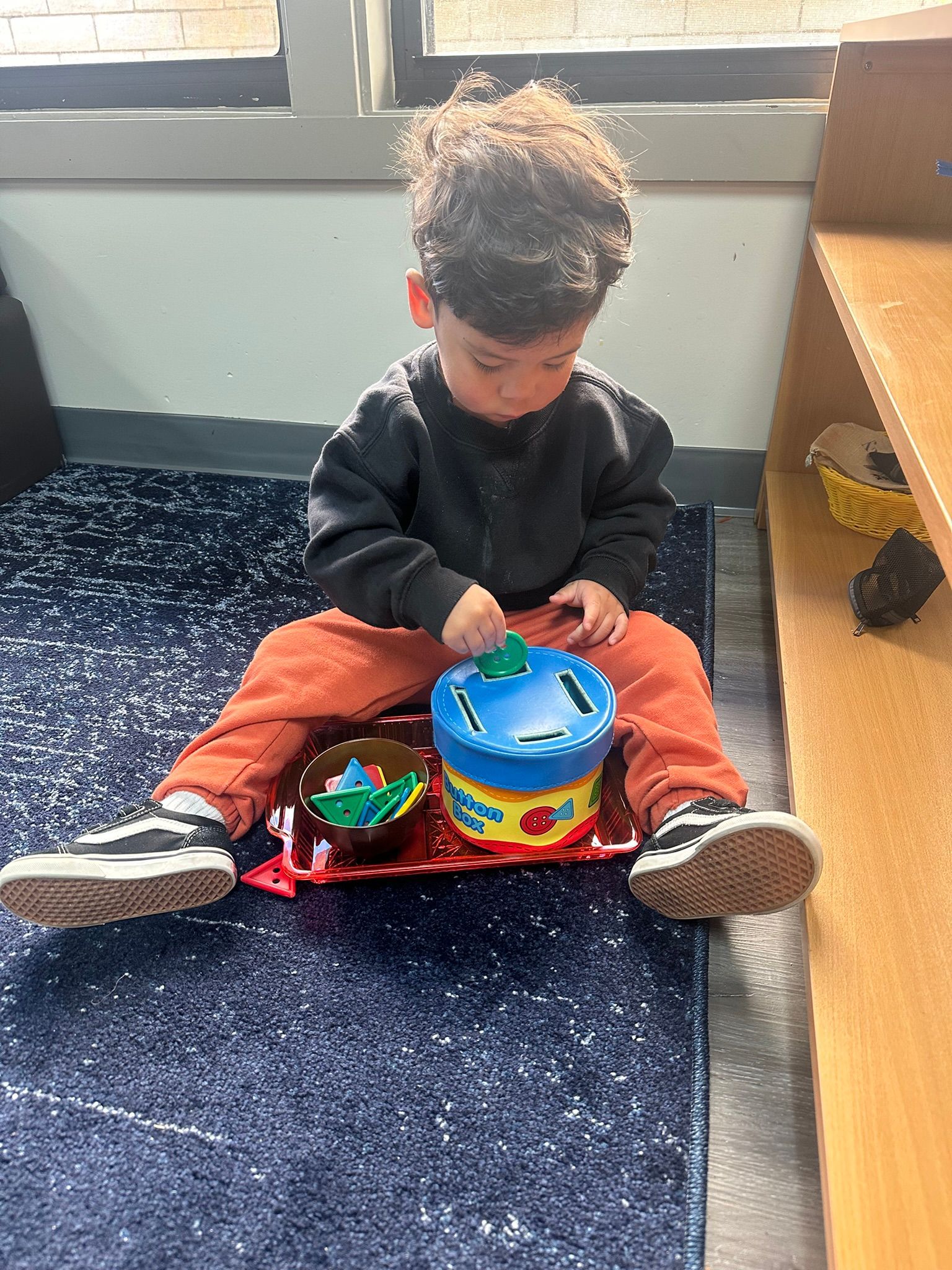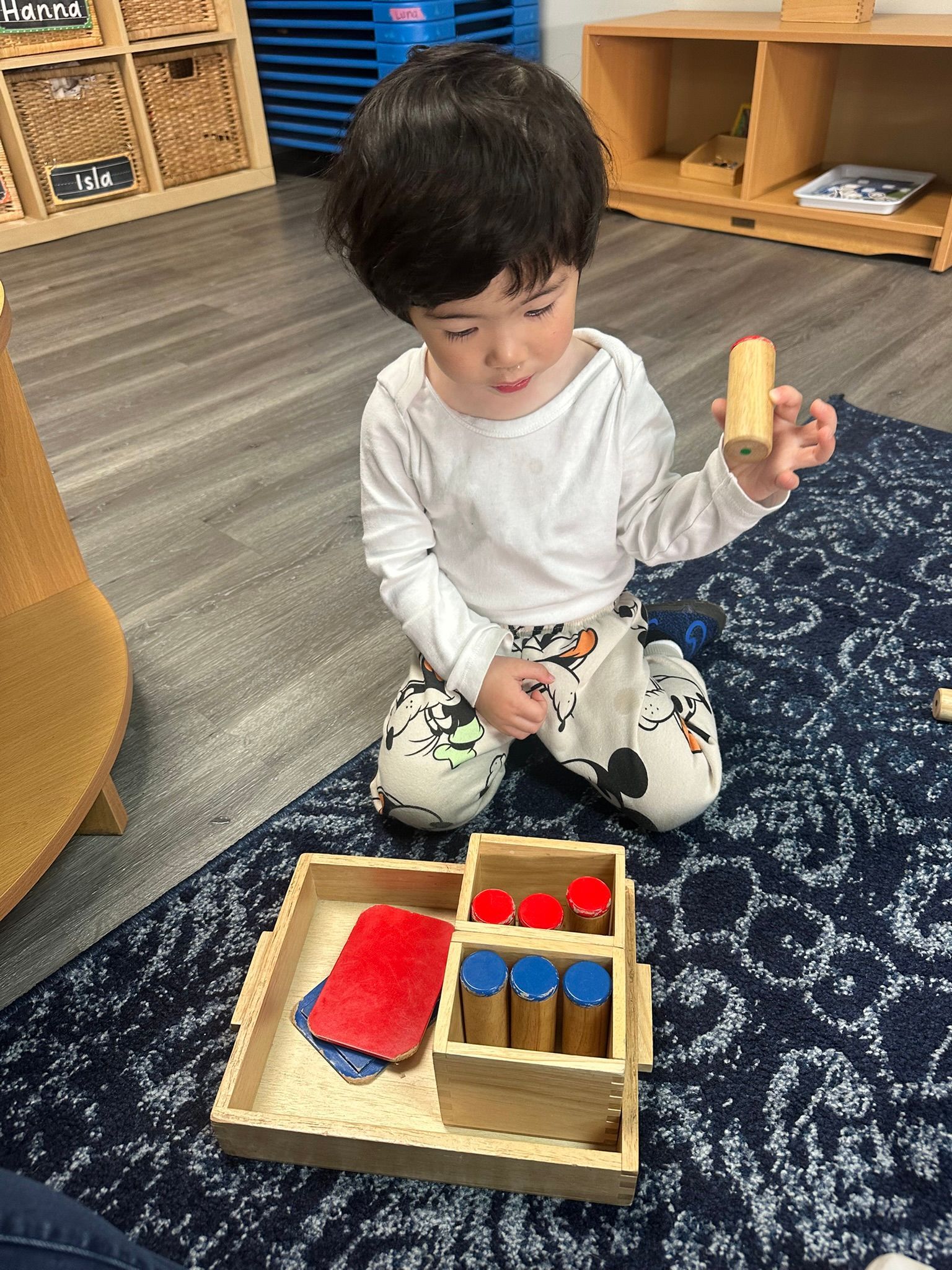 Our Montessori curriculum this month continued to focus on care of the environment, we practiced washing our tables and clearing our plates after lunch. Our book of the month, The Very Hungry Caterpillar, gave us a look at the life cycle of the butterfly and we had fun using chalk to make our flying butterfly art. In our cultural area we learned the names of some popular animals that are native to South America with our animal picture matching material. In the Sensorial area we introduced the words big and small and compared the two with the help of our pink tower. In the practical Life area, we spent our time strengthening our pincher grasp and our hand eye coordination with popsicle stick posting.