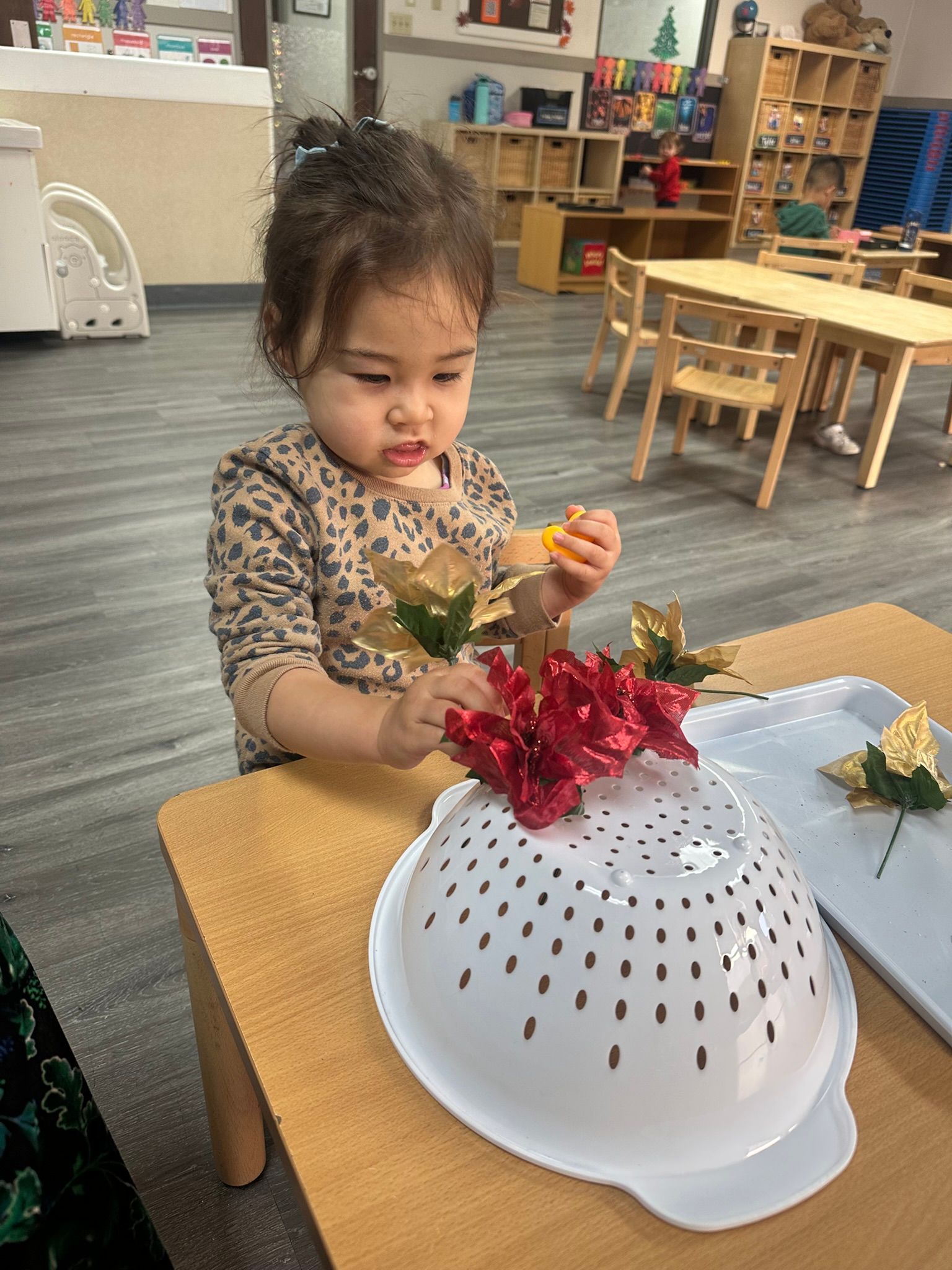 Happy Holidays and Seasons Greetings! December has gone by quickly for Room 3. The children enjoyed exploring all the new materials on the shelves and welcoming new friends to our class, welcome to Tylee and Dylan. It was wonderful to have all of you participate in our Annual Toddler Family Sing-Along. The children had fun sharing the goodies they brought for our Holiday party and enjoyed all our special dress-up days during Spirit week. We had a great time watching the children work together to decorate our classroom tree and having a chance to say hello to the big man himself, Santa Claus. Our Book of the month, The Giving Tree by Shel Silverstien, reminded us that giving can be just as fulfilling as receiving as we continue to learn how to take turns with our friends and how to show empathy when our friends are upset or sad.