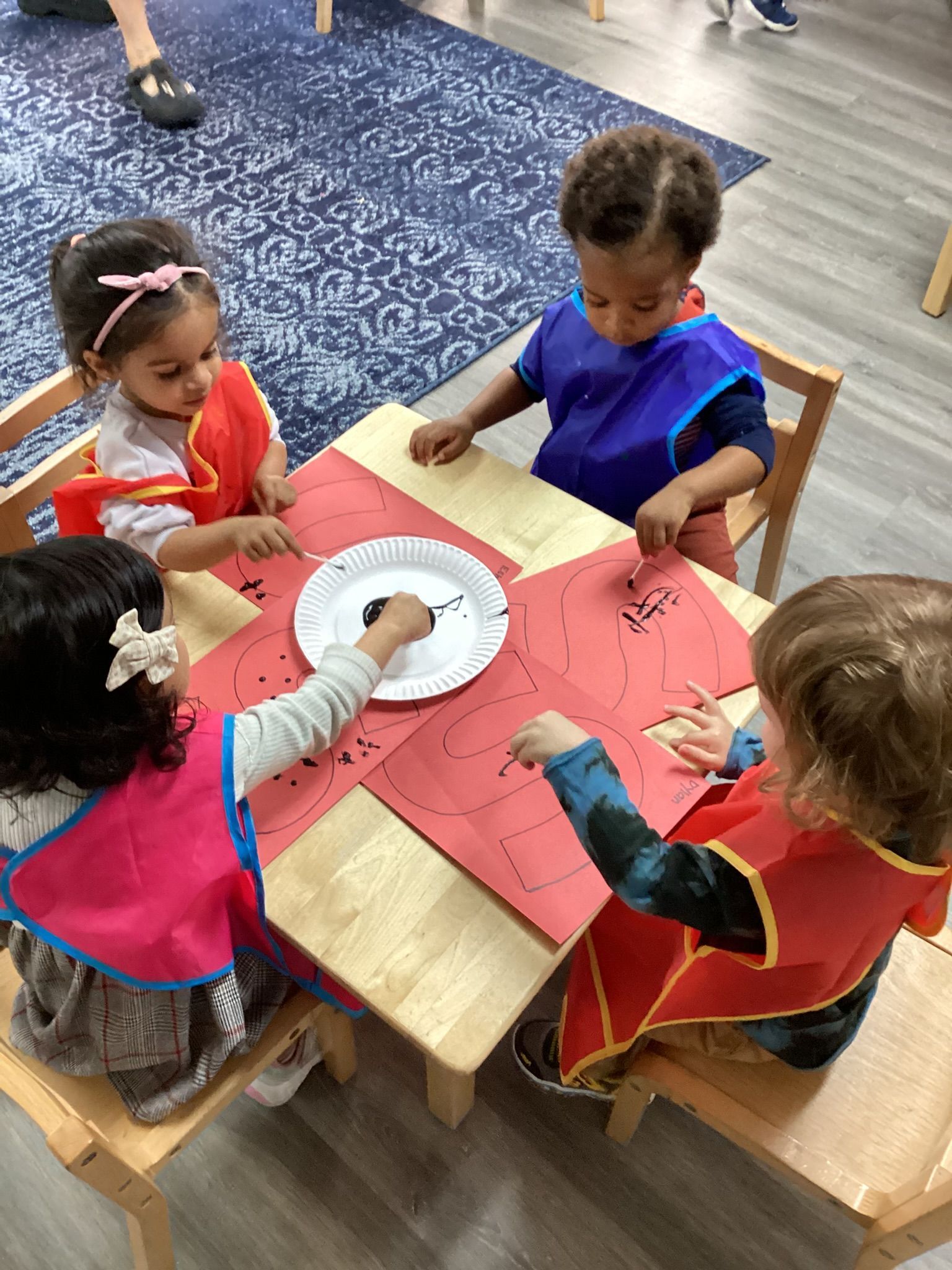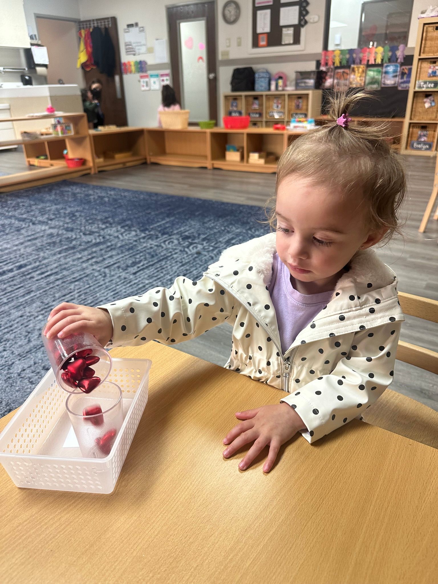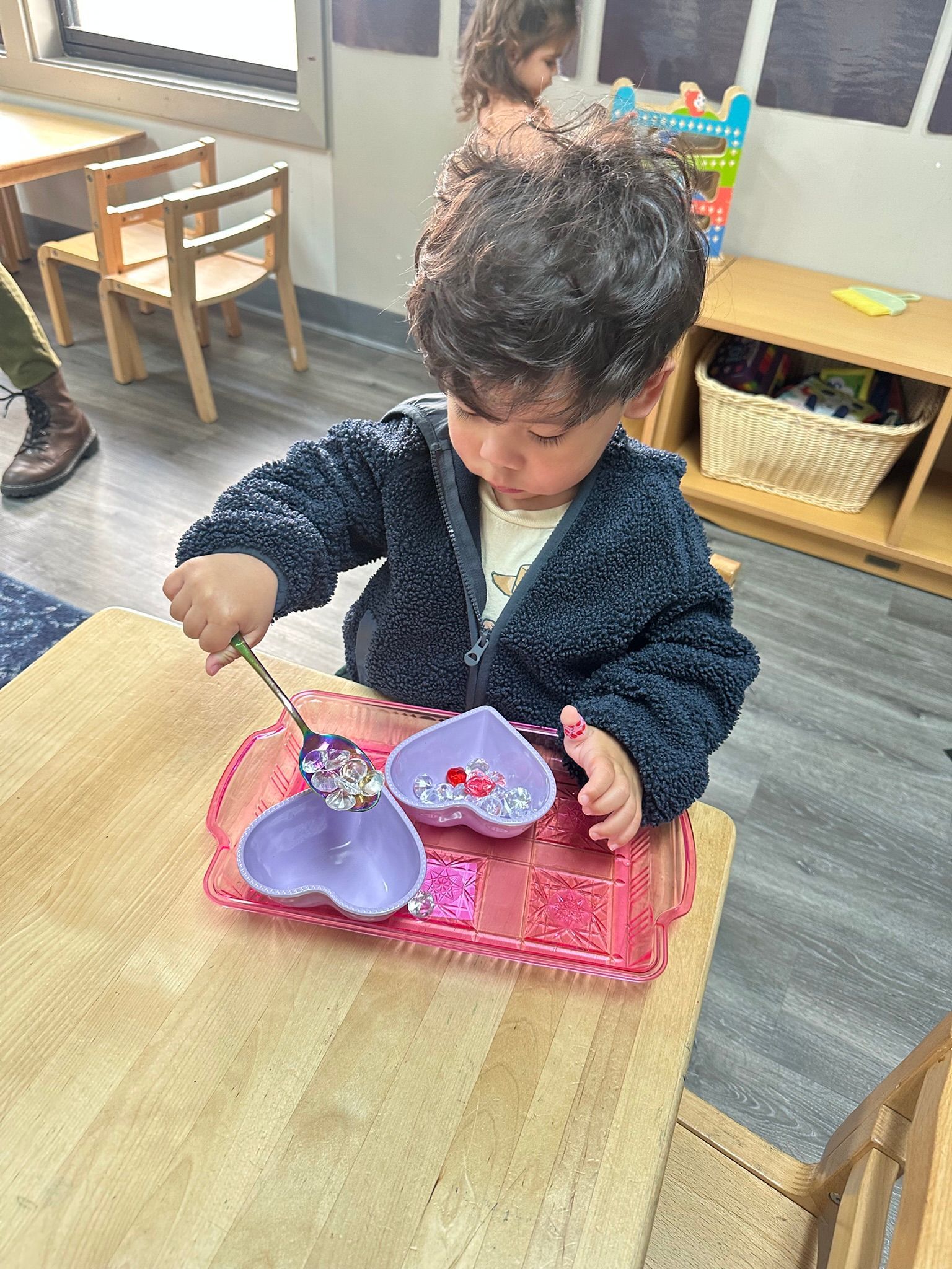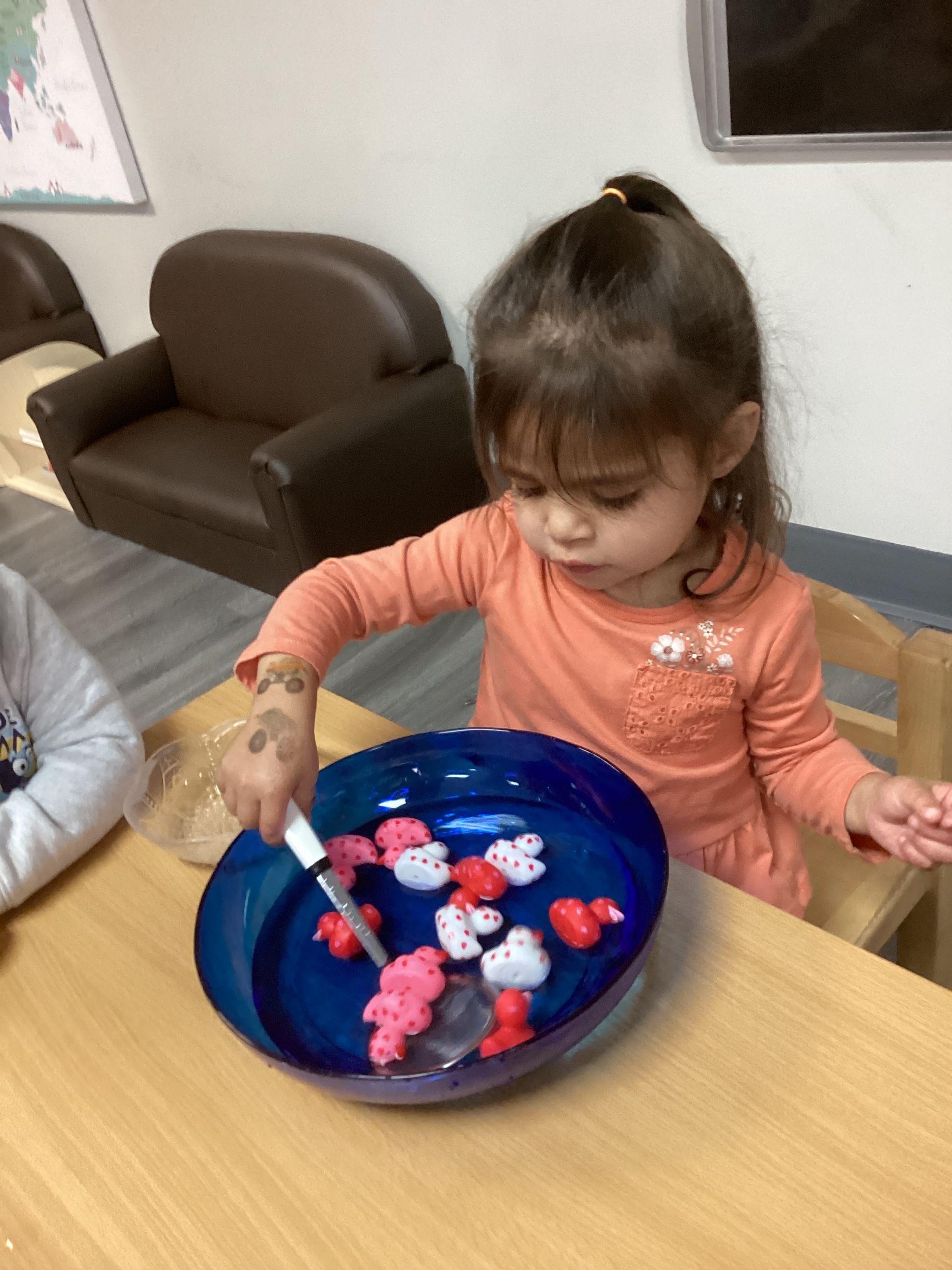 Our Montessori curriculum had us focusing on taking care of the people in our room. As we welcomed more friends into our classroom conflict resolution became a very important aspect of our learning. We were helping the children to use gentle hands with their friends and to take a break if they got frustrated. We let them know that It’s ok to have big feelings, but we must be careful with other people. On the academic side we were introduced to the letters s, t, u, and v. We touched the sandpaper letters and did art to reinforce our understanding. We enjoyed pouring, scooping and tonging hearts in practical life. We matched animals found in Asia in our Cultural Study area. We had loads of fun making bubble heart art!