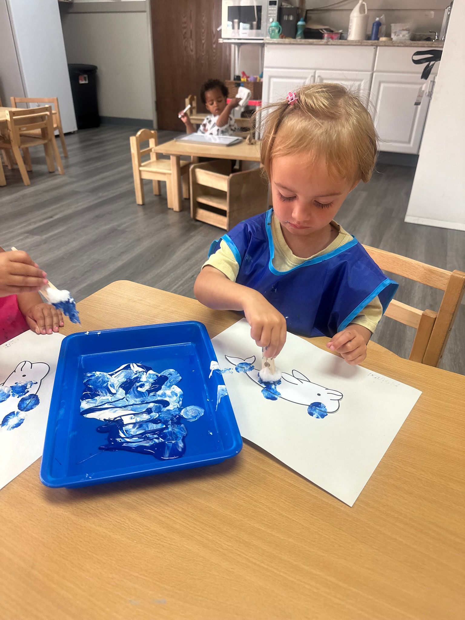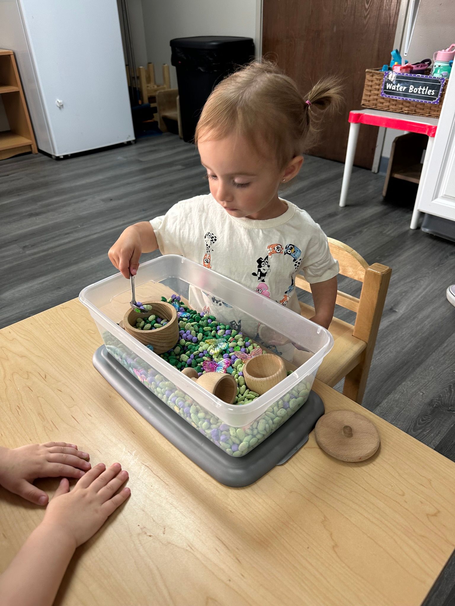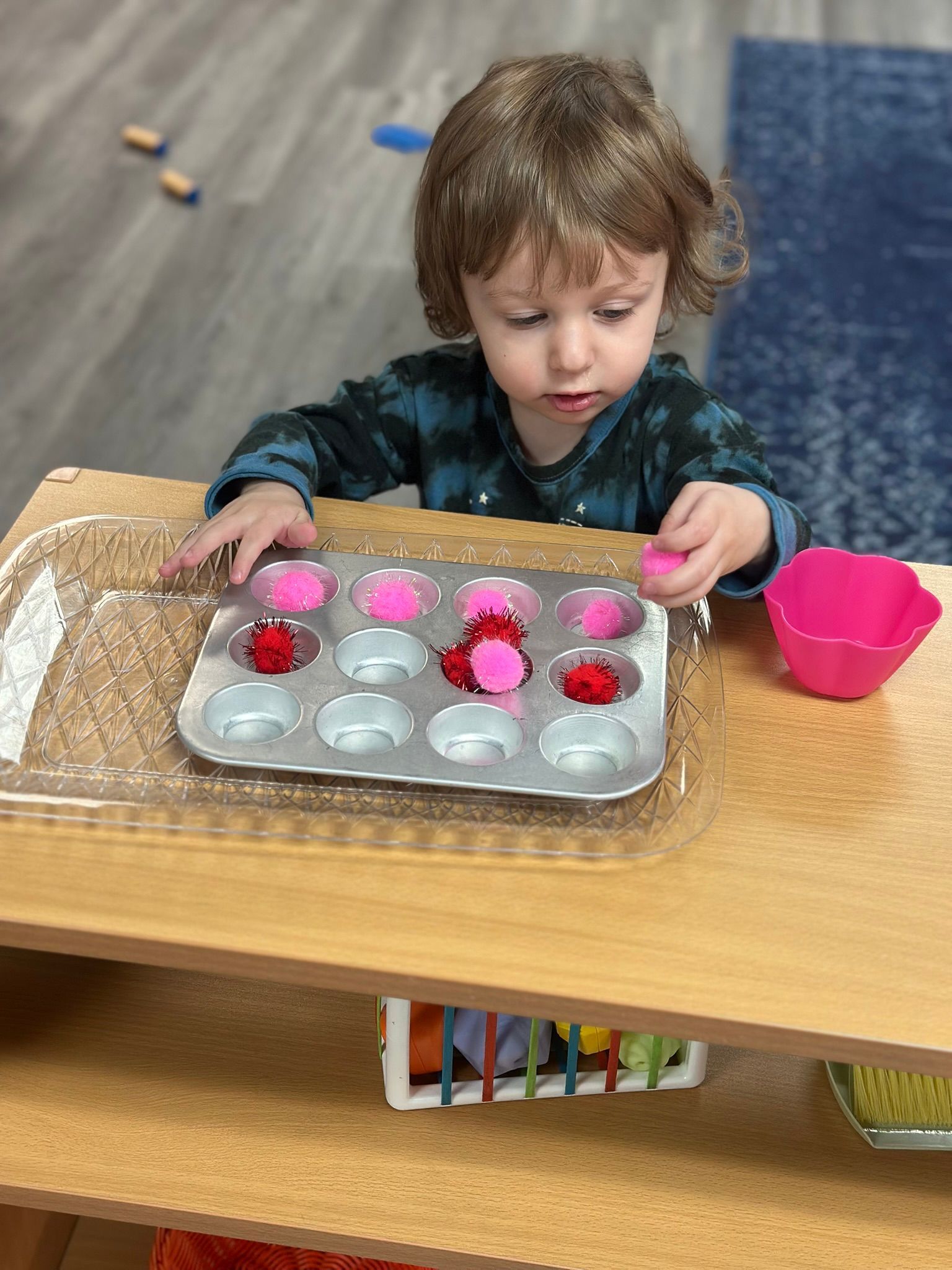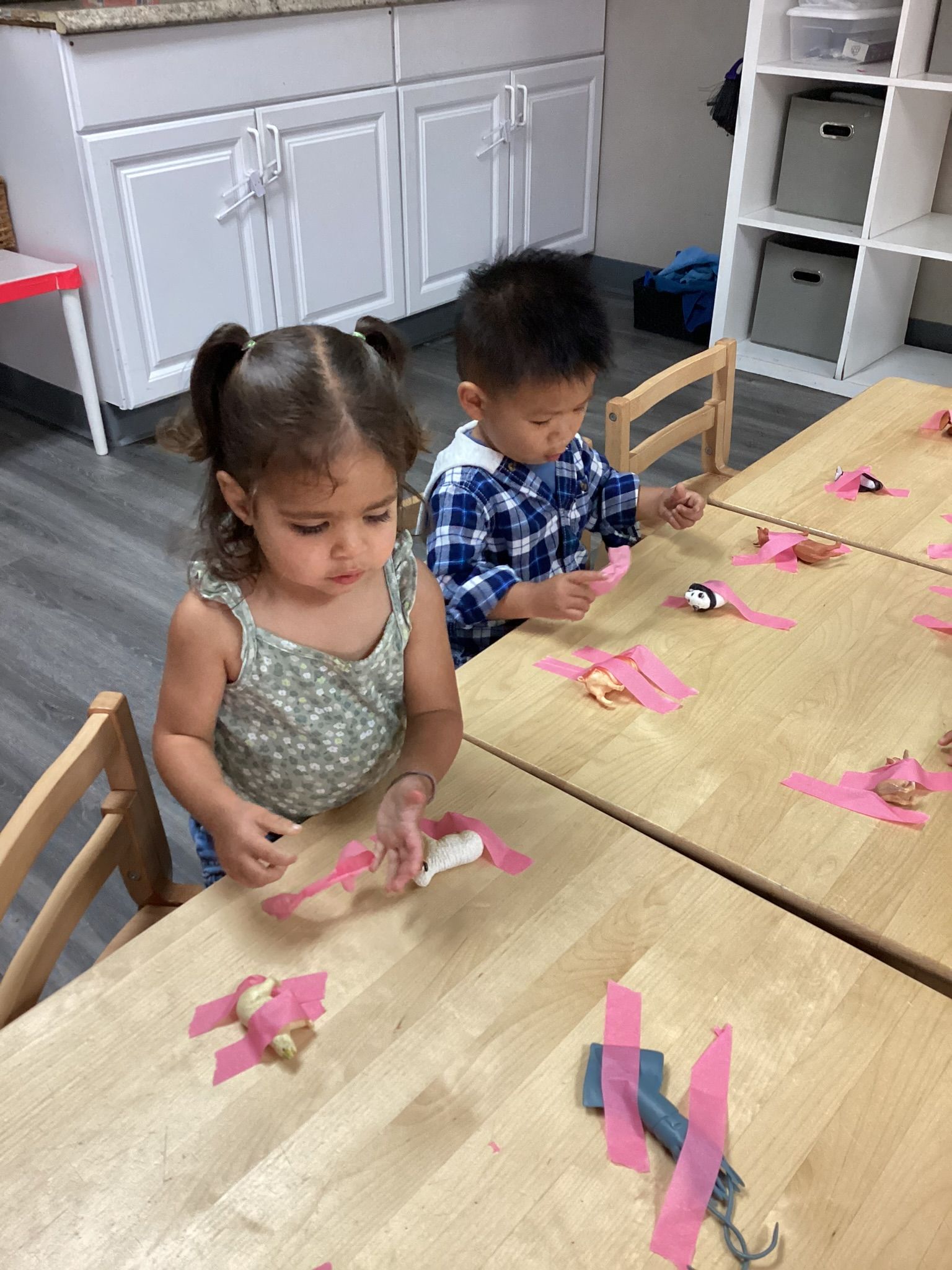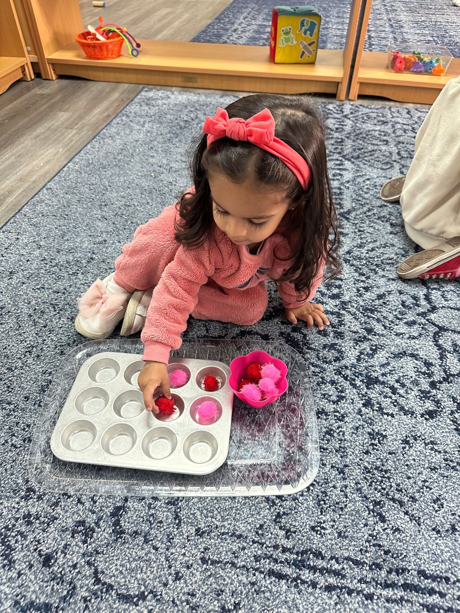 Our Montessori curriculum had us focusing on taking care of the people in our room. As we welcomed more friends into our classroom conflict resolution became a very important aspect of our learning. We were helping the children to use gentle hands with their friends and to take a break if they got frustrated. We let them know that It’s ok to have big feelings, but we must be careful with other people. On the academic side we were introduced to the letters s, t, u, and v. We touched the sandpaper letters and did art to reinforce our understanding. We enjoyed pouring, scooping and tonging hearts in practical life. We matched animals found in Asia in our Cultural Study area. We had loads of fun making bubble heart art!