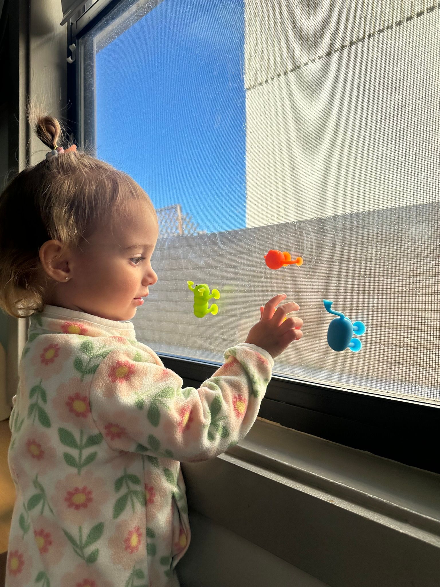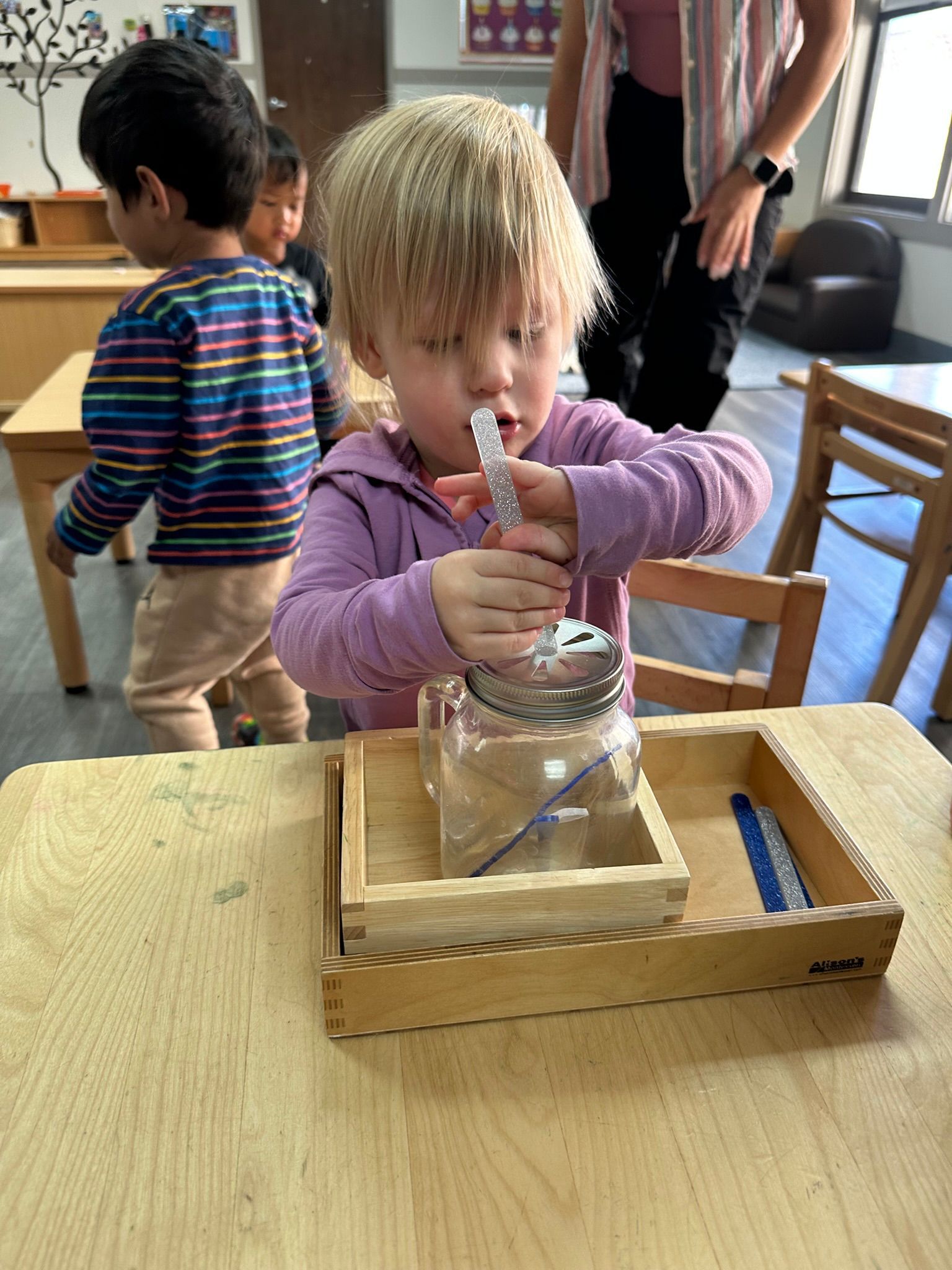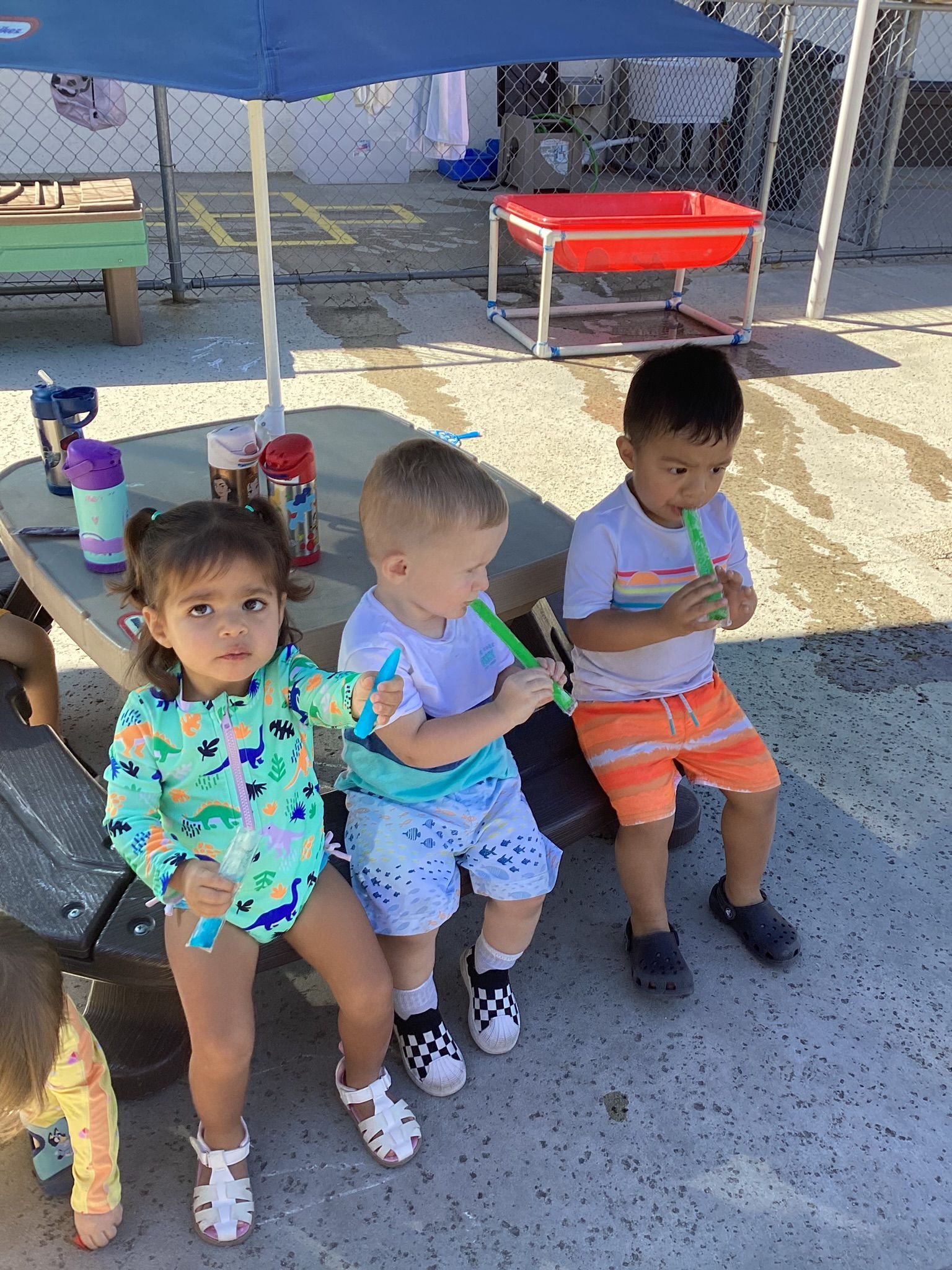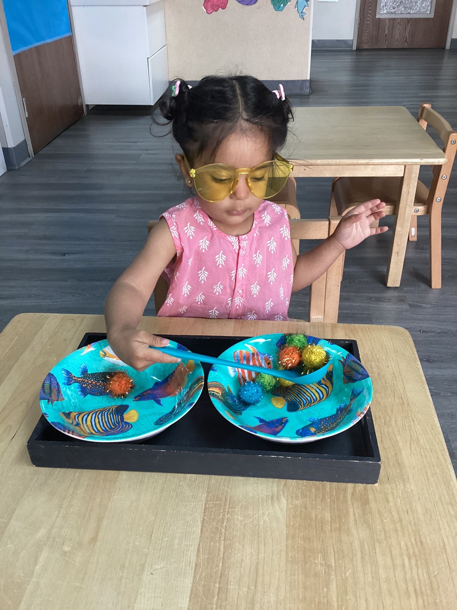 In our classroom we welcomed many new friends and began practicing our Montessori jobs. In practical life we practiced our fine motor skills by tonging sea animals and spooning Pom Poms. We were introduced to our colors with our fish puzzle and our colored glasses. We used all types of art materials to make turtles, fish, volcanoes, and constellations. We are all doing our best to sit in our chairs during snack and lunch time. Our favorite book of the summer was Bubbles.