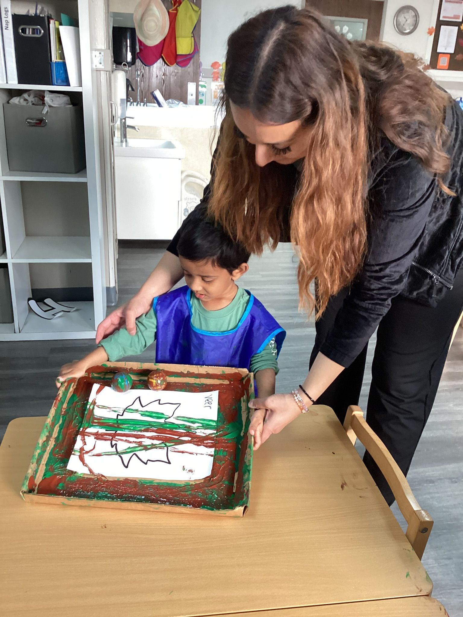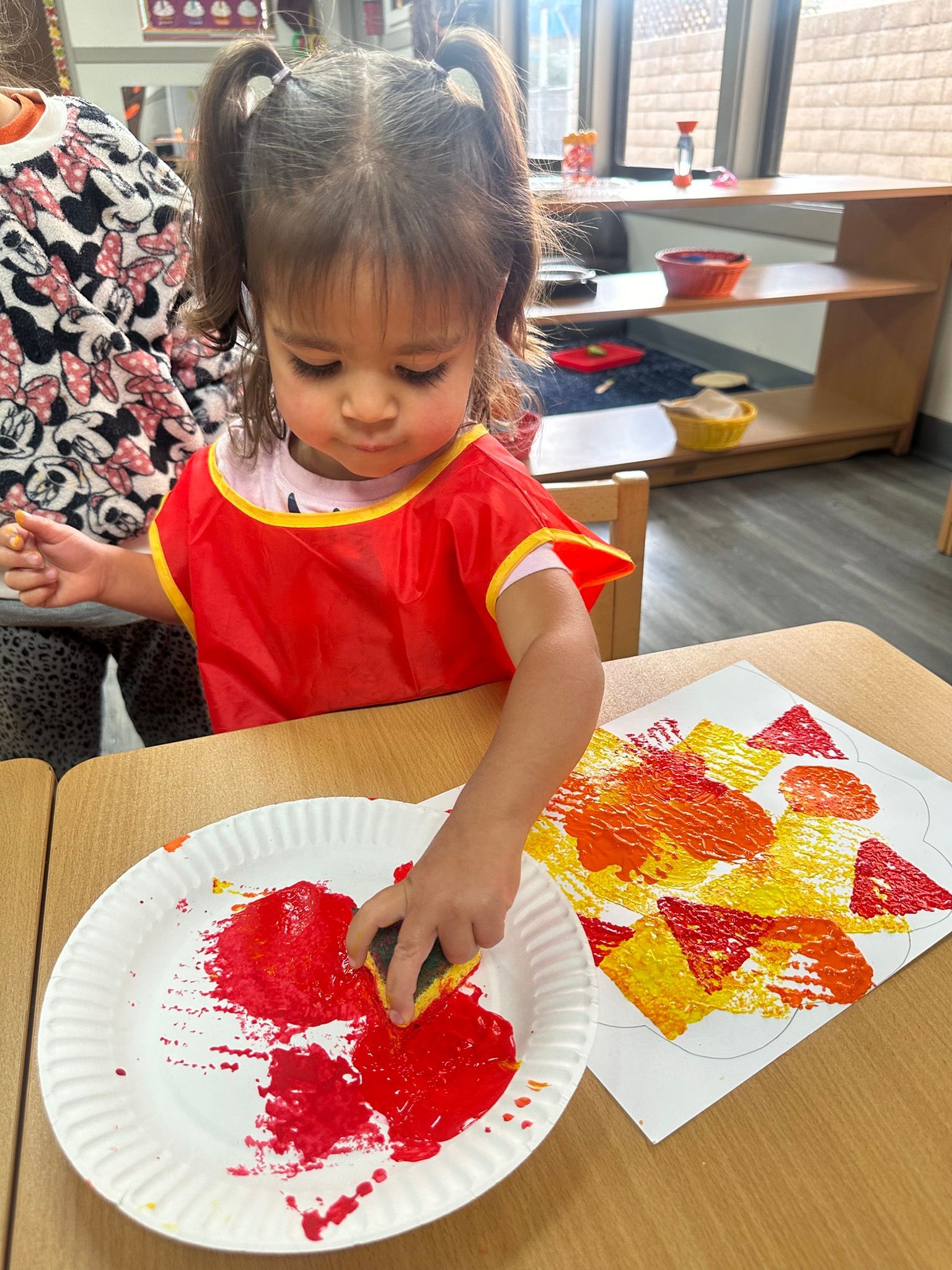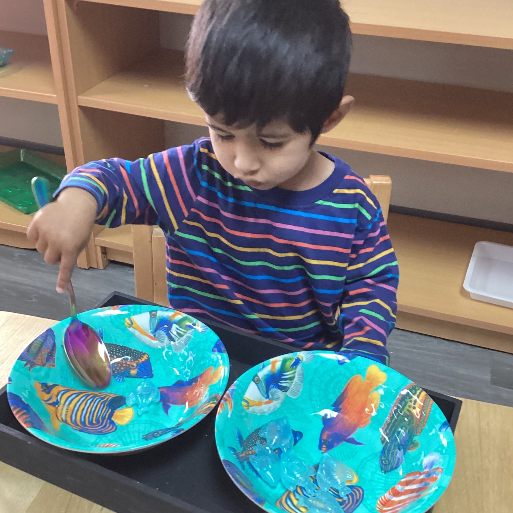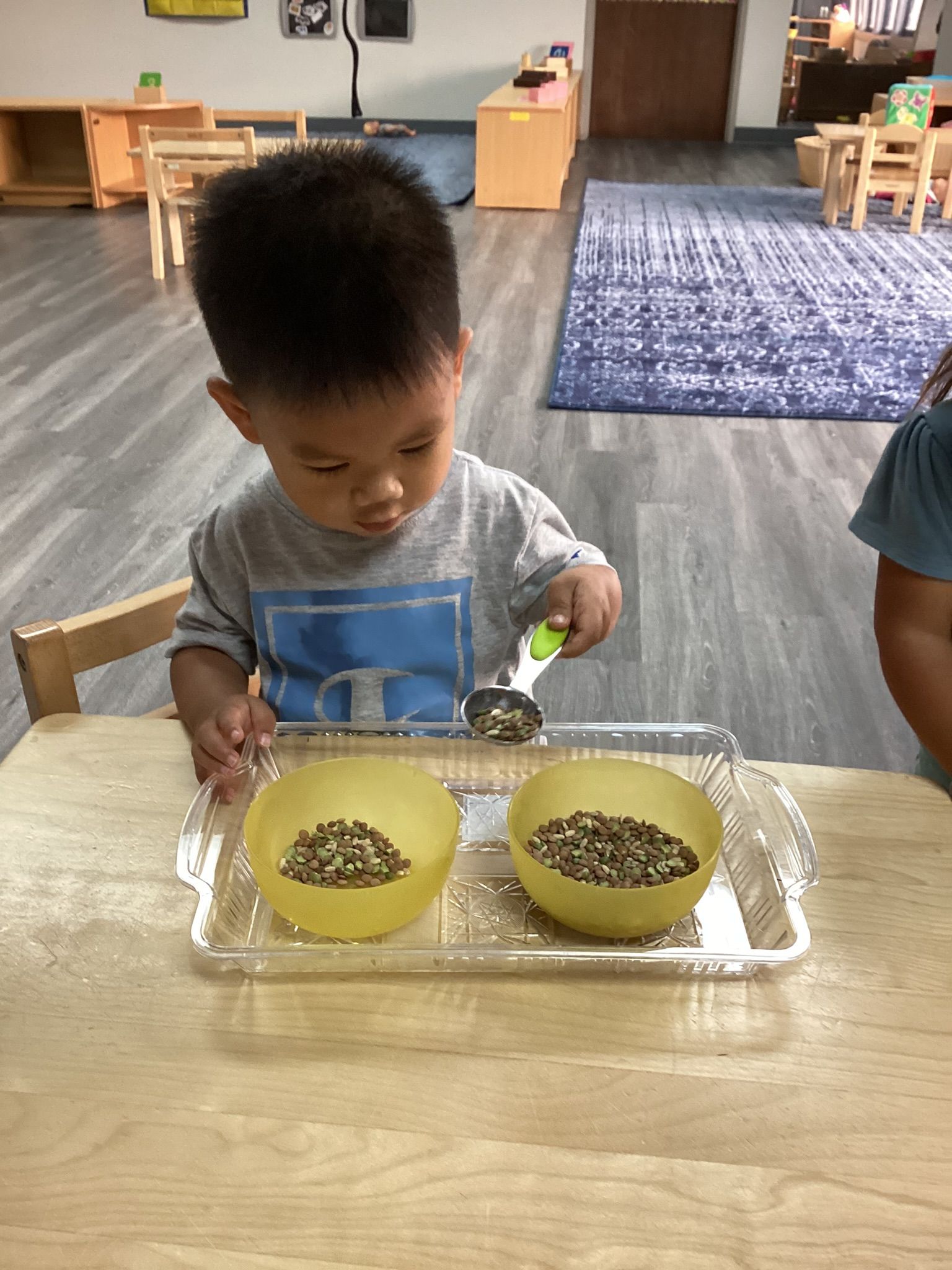 We went on a leaf hunt with our book of the month, Going on a Leaf Hunt by Steven Metzger, and made leaf handprints to add to our classroom tree. We enjoyed discovering the names of the planets in our Solar System with planet picture matching. We practiced our finger-painting skills while painting the sun. We strengthened our fine motor skills by spooning flowers and beans. In math we continued practicing the numbers 1-5 and introduced the number 6. In the sensorial area we talked about biggest to smallest with our knobbed cylinders.