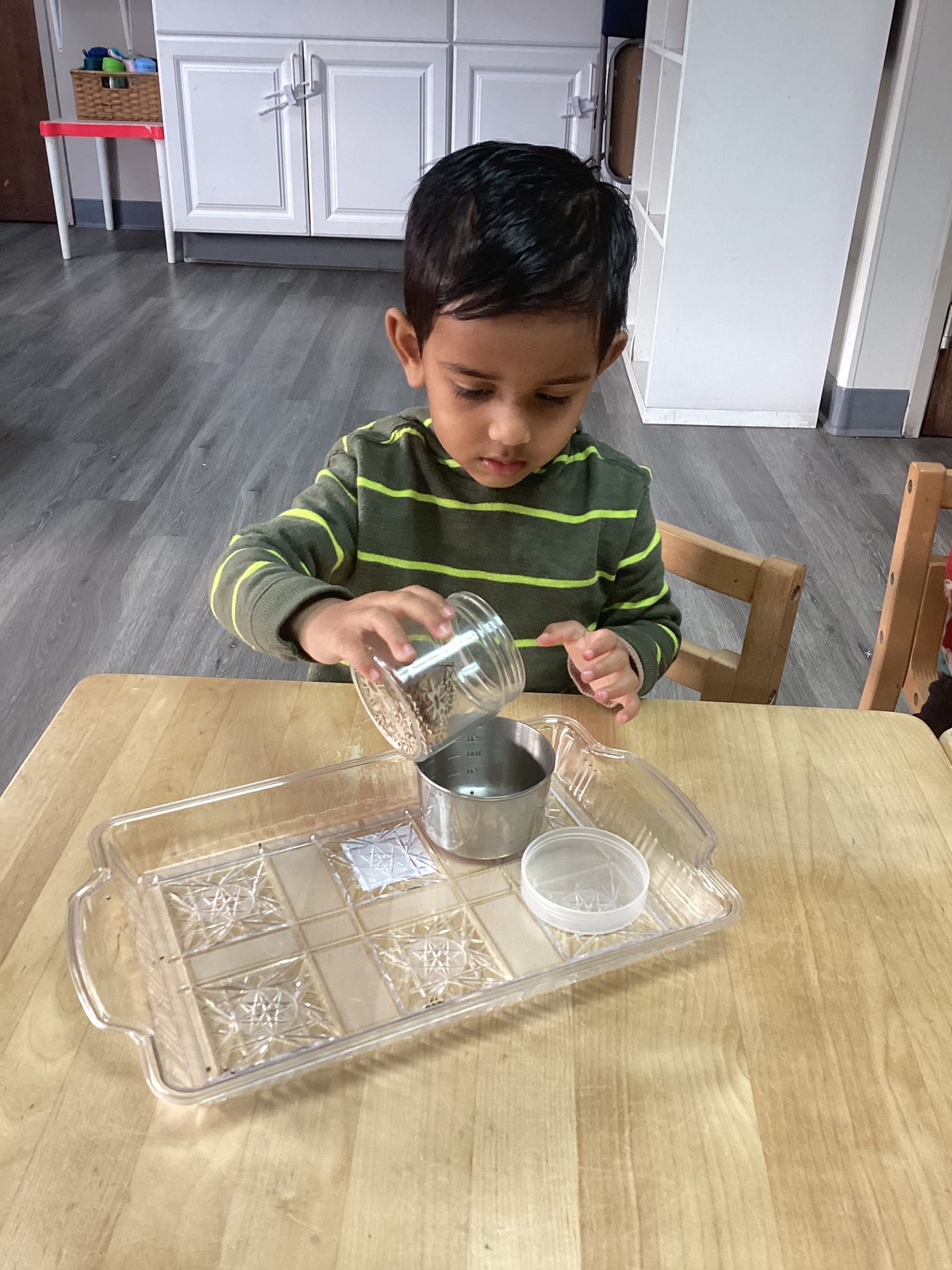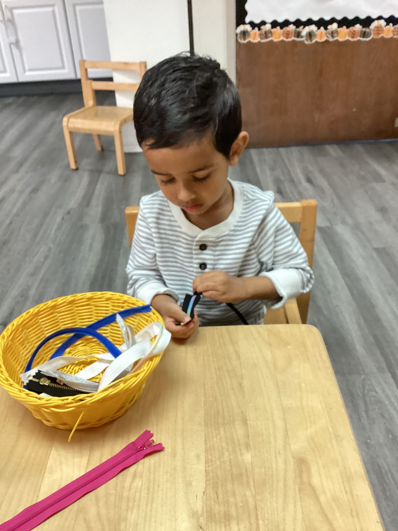 Our Montessori curriculum focused on reintroducing the class to rule number two: take care of the environment. We practiced taking jobs back to the shelves, pushing in our chairs, and being kind to the materials. Our favorite jobs were drawing on the white board and peeling stickers in the art area. We also got introduced to the letters and sounds o, p, q, and r. We made tape resist snowflake art and a snowscape. In the Practical life area, we practiced our fine-motor skills with lacing cards and zippers. In math we continued working on recognizing the numbers 0-9 and building quantities to 5.