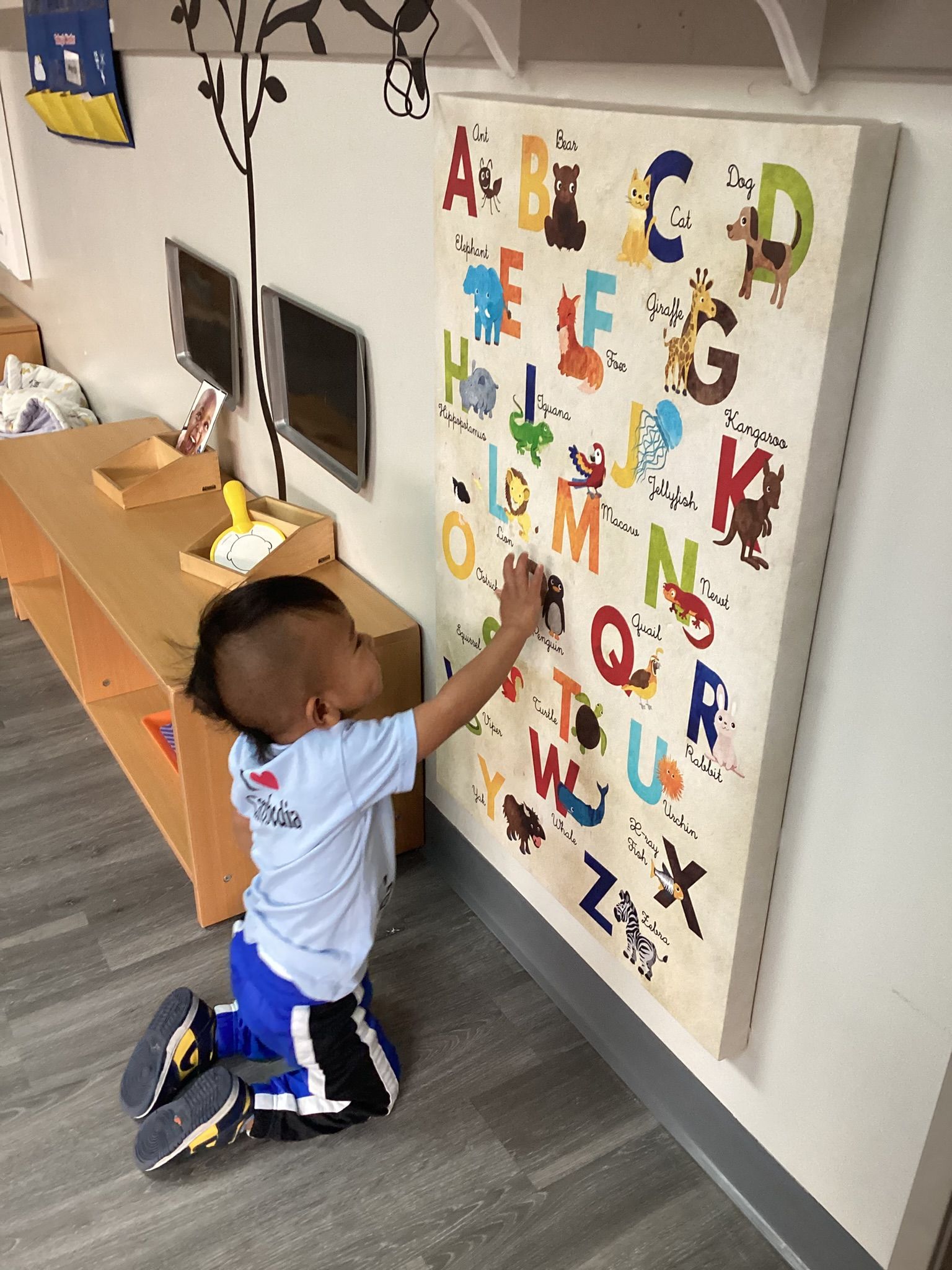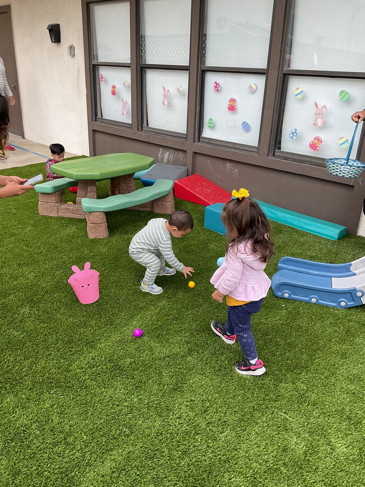 Our Montessori curriculum focused on care of the environment, we practiced pushing in our chairs and cleaning up our spills. Our book of the month, Chicka Chicka Boom Boom, helped us review all the letters of the alphabet and we did tape art of the first letters of our names. We made Volcano handprints and a globe to celebrate Earth Day. In the Sensorial area we were introduced to color tablets as we practiced naming colors. In the practical life area, we practiced our fine motor skills opening and closing containers with Easter Egg matching. For geography we visited the continent of Australia and leaned the names of animals that live there.