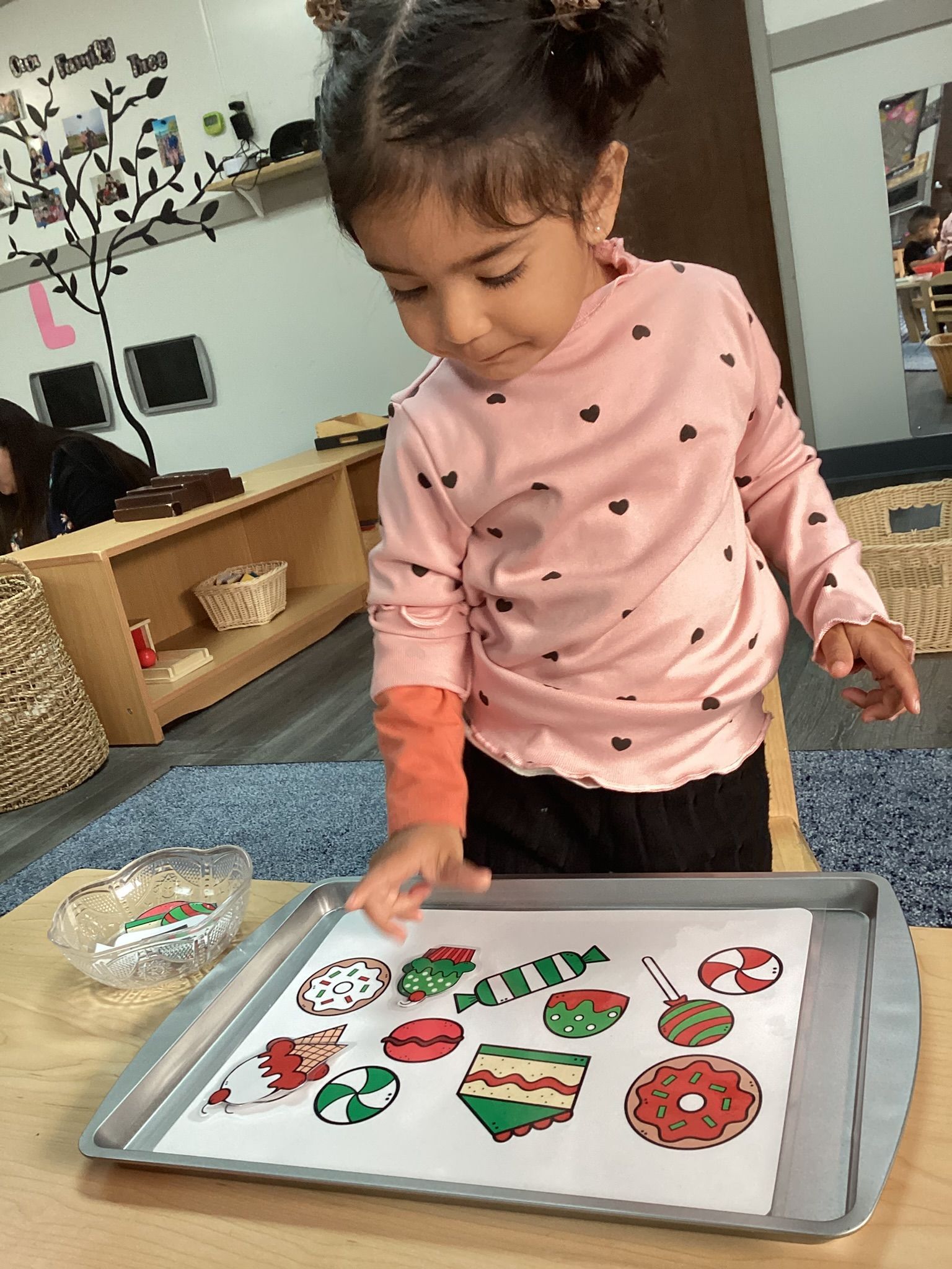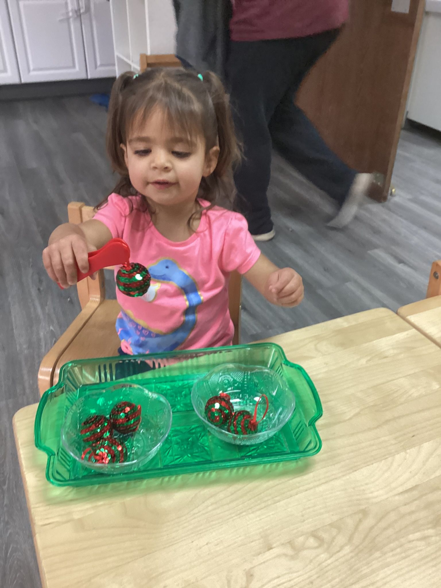 Our theme was Celebrations across the World. We talked about the weather when we played outside on the playground and introduced different holiday traditions with picture cards. We focused on fine motor-skills in the Practical Life area with ornament tonging, posting buttons, and matching nuts & bolts. In Math and Sensorial we introduced triangles; we did triangle counting and featured the triangles we have in our classroom. We also introduced the letters/sound L, M, and N. Ornament tonging and Christmas treat matching were definitely our favorite jobs this month.