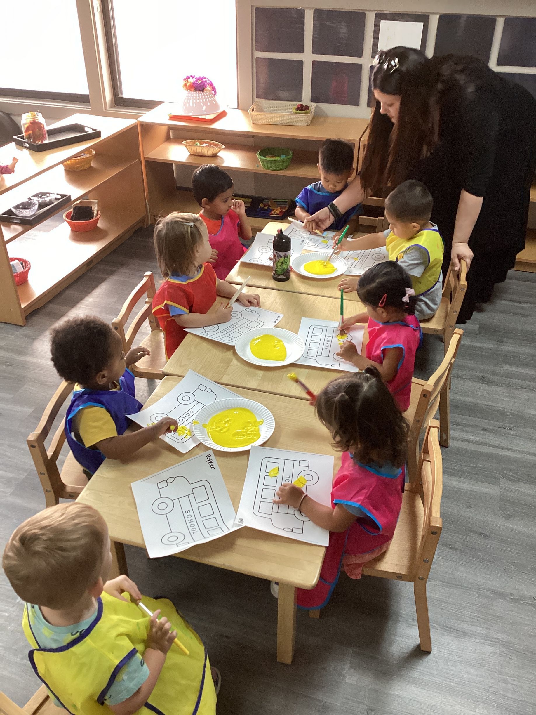 We loved our book of the month, The Kissing Hand by Audrey Penn. We used it to talk about our families and the way they take care of us. We shared our family pictures and talked about the names of the people in our families. We had fun learning about our letters of the week a-d. We sang a song about the sound that each letter makes and named things that start with that letter. In Practical Life, the children practiced their spooning skills with glitter balls and shape bead stringing. Art had us painting big yellow school buses to strengthen our fine motor and paintbrush skills and making handprint apples for our classroom tree. In the Math area, we introduced the numerals 1-5 and started building quantities to 5.