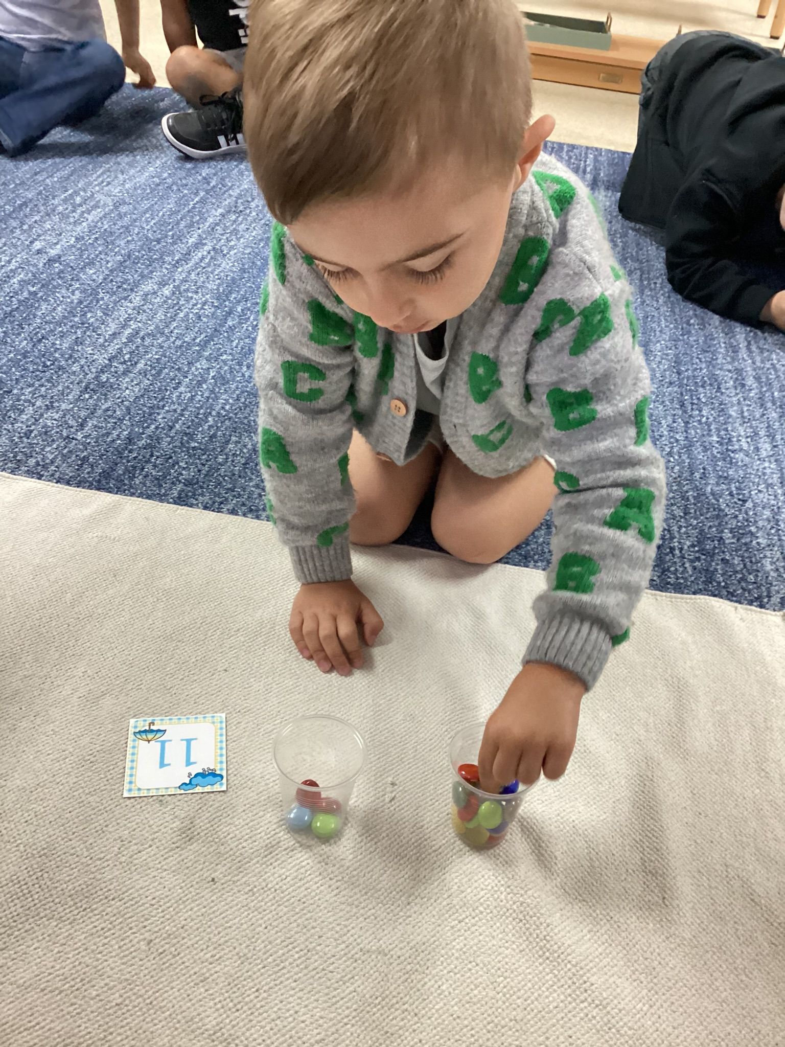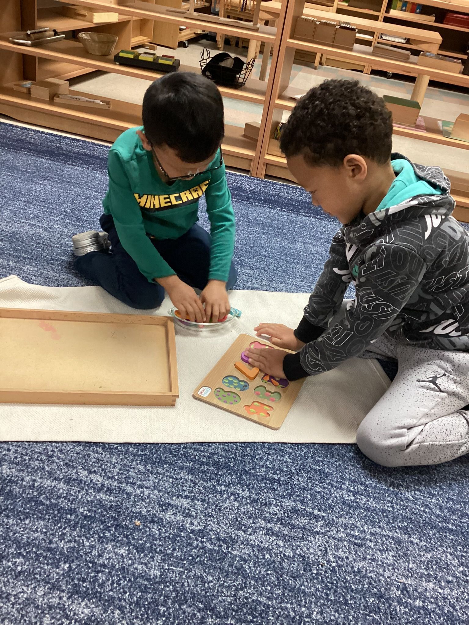 Children have been working very hard on their sounds and numbers. Children have really enjoyed putting the numbers 1-20 in order on our hundred board! One of their favorite jobs this month has been the lock and key work. We also have continued working on our manners by saying please & thank you. We been practicing our sounds with our letter sound work with pictures and by signing the letter sound song. Our enrichment has been full of fun activities. Their favorite was making a snowflake by gluing small blue paper pieces onto a picture of a snowflake.