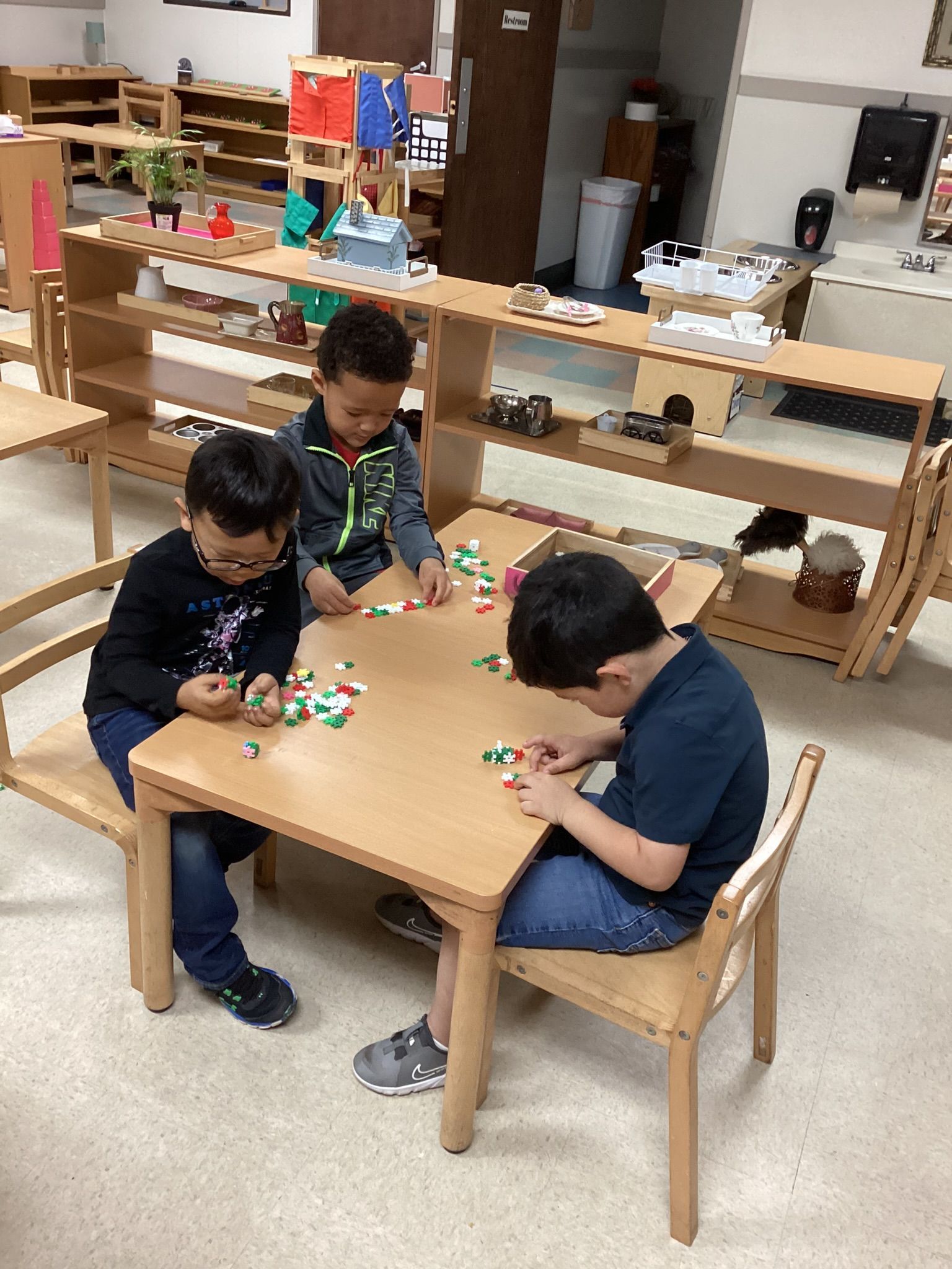 Children have been practicing their fine motor skills with various work such as tweezers, stringing and dressing frames. For language, we have been practicing our letter sounds by singing a song and using our Sandpaper letters. For math, we have been working on our bead stairs and number rods children really enjoy doing this work. Children were introduced to the Triangle box and have been practicing nicely. We have also been practicing how to clean up our area children, really like wiping down their own table with soap and water.