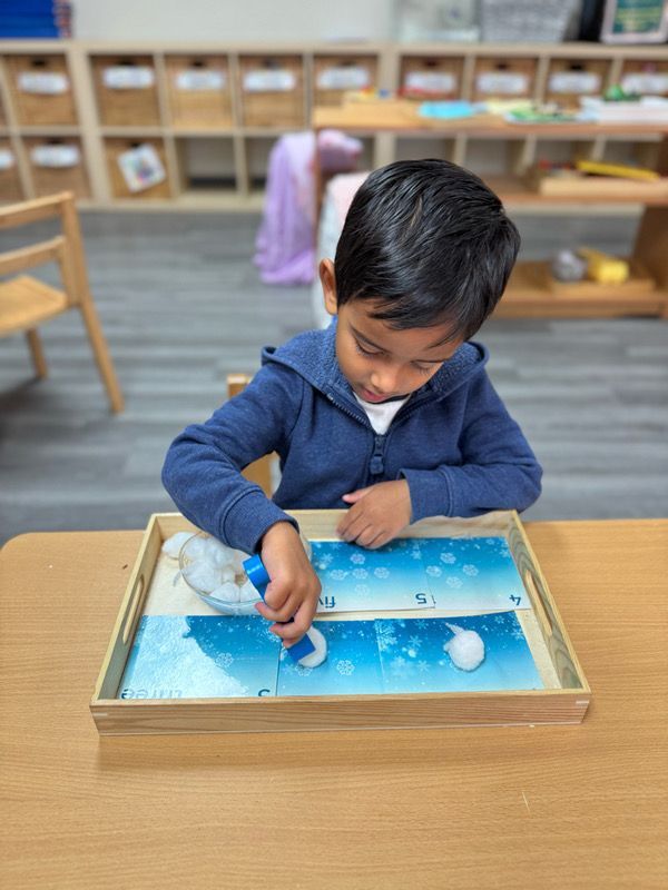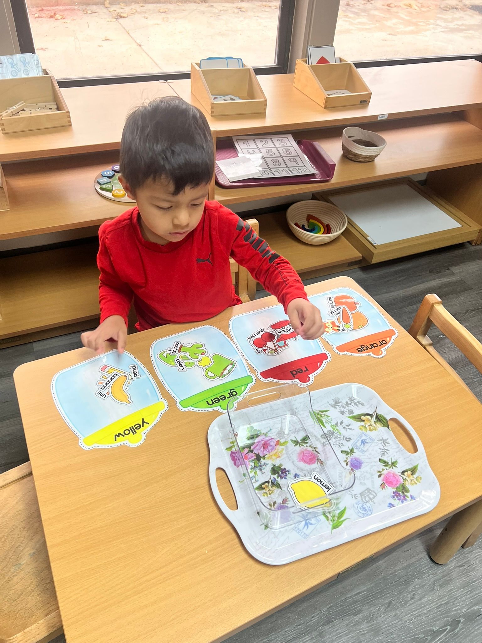 In Montessori curriculum, practical life activities play an important role in helping children develop independence and organization. For example, sorting apples by color into matching bowls not only sharpens categorization skills but also supports habits of order and responsibility. In language, we began with the letters a, b, and c, introducing them through multisensory experiences. Children traced sandpaper letters to connect sound and symbol, and practice dot painting to further explore these shapes in a playful, tactile way. Art activities had also been a highlight students painted a bright yellow school bus using cotton balls and created apple designs with dot painting. These creative projects encouraged fine motor growth, artistic expression, and hands-on discovery, making learning both meaningful and fun.
