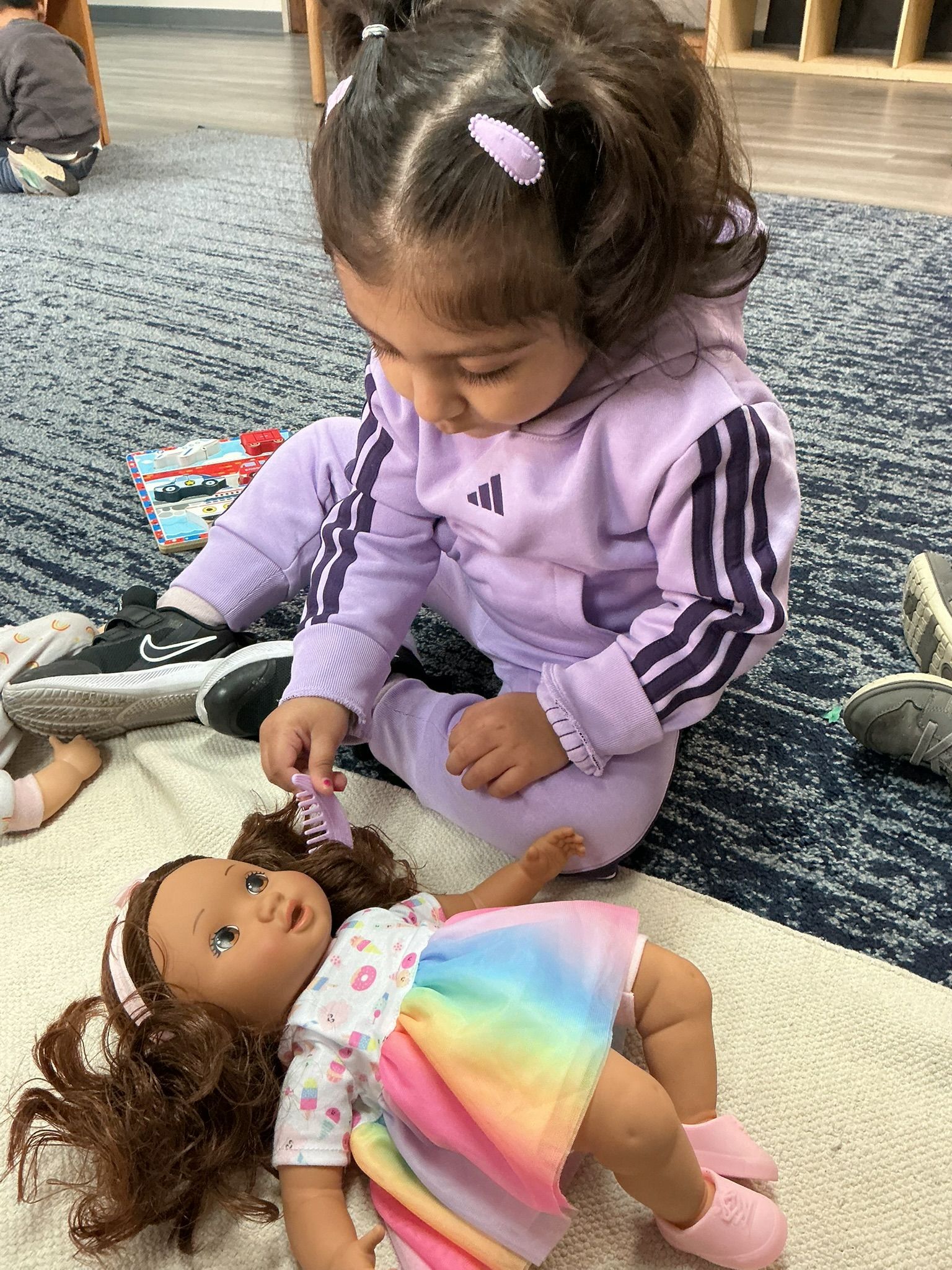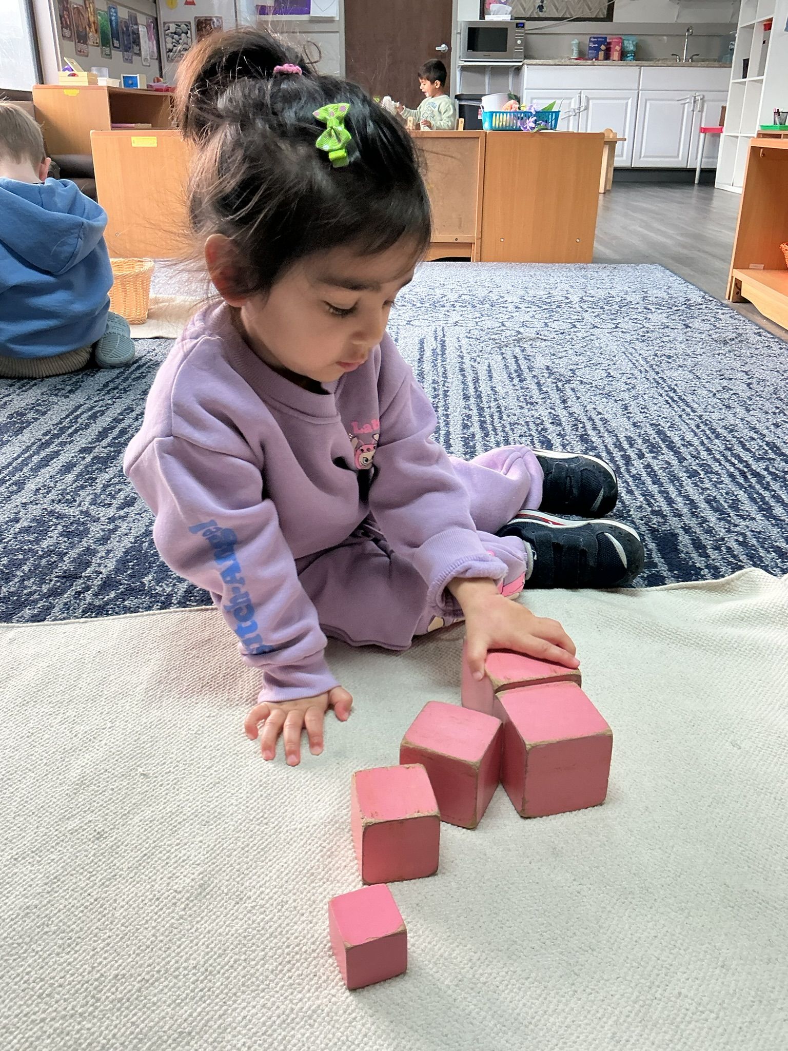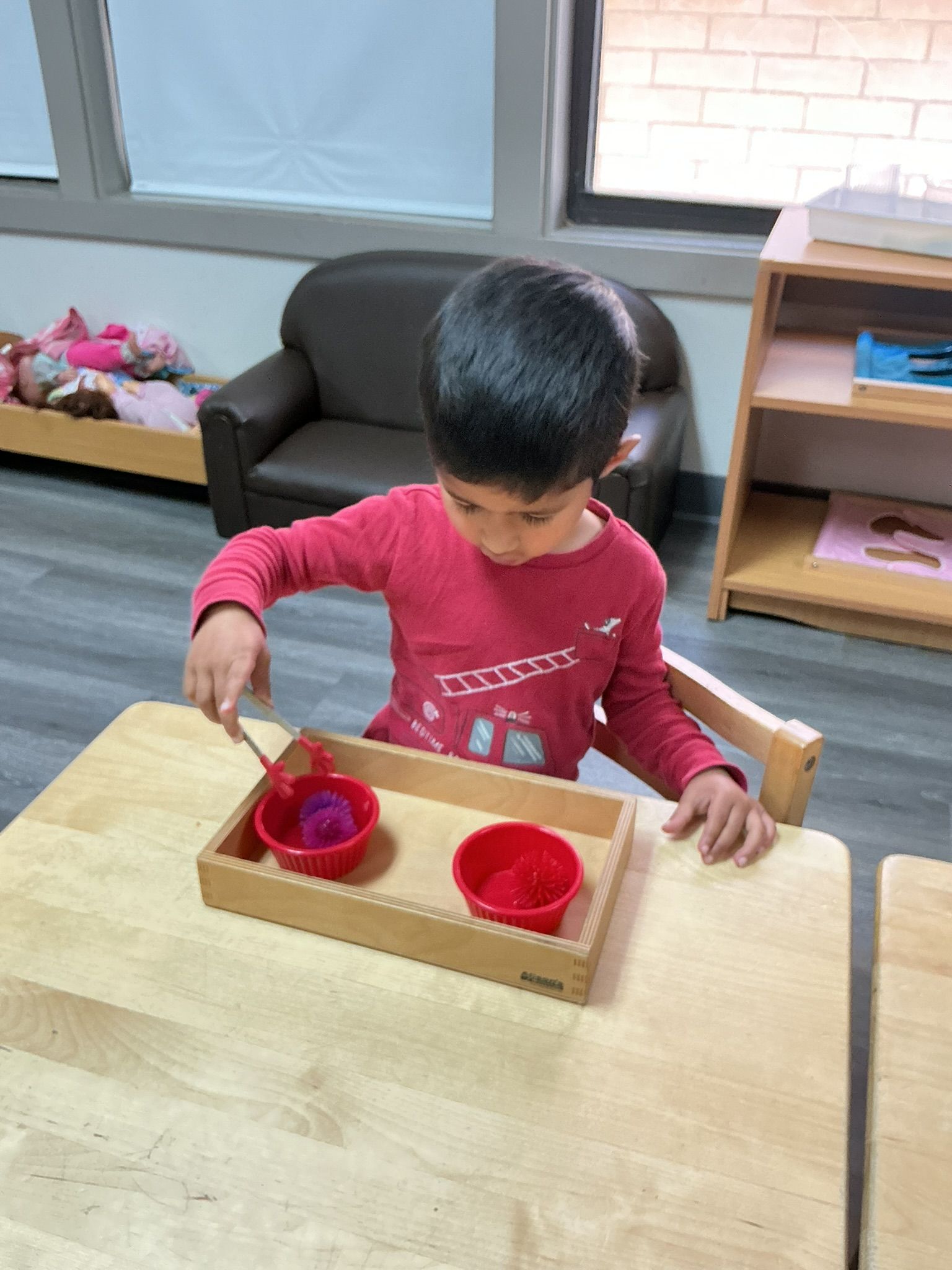 Practical life work continued to be an important part of our days. The children practiced brushing hair with a small brush, building independence and self-care skills. We also worked on walking carefully while carrying a tray, focusing on balance, control, and moving safely around the classroom.