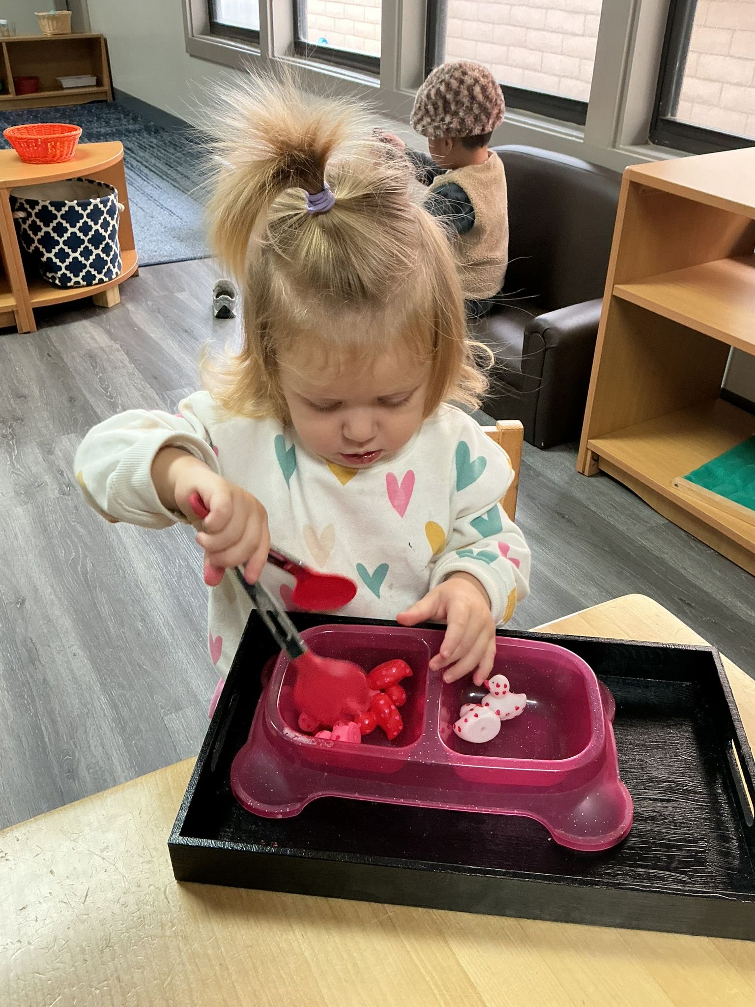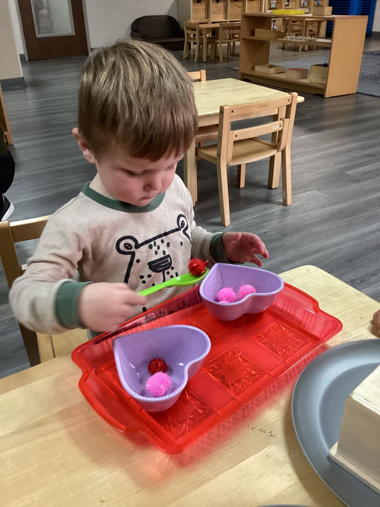 February was a joyful and love-filled month in our Toddler Montessori classroom! The children were busy exploring new concepts, strengthening independence, and celebrating friendship together. Our featured book this month was Little Blue and Little Yellow by Leo Lionni. This sweet story sparked discussions about friendship, colors, and what happens when colors mix. The children enjoyed watching blue and yellow “become” green, and many were fascinated by the magic of color blending. February brought a very special Valentine’s Day celebration, too. We shared lots of yummy food and enjoyed a festive snack together. The children practiced grace and courtesy as they passed out valentines to their friends. It was a beautiful opportunity to build community, kindness, and social skills.