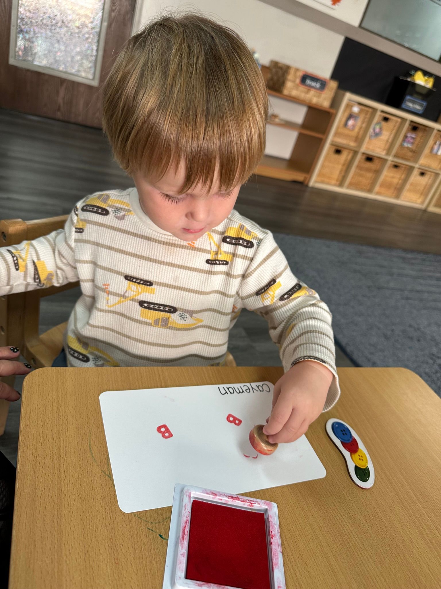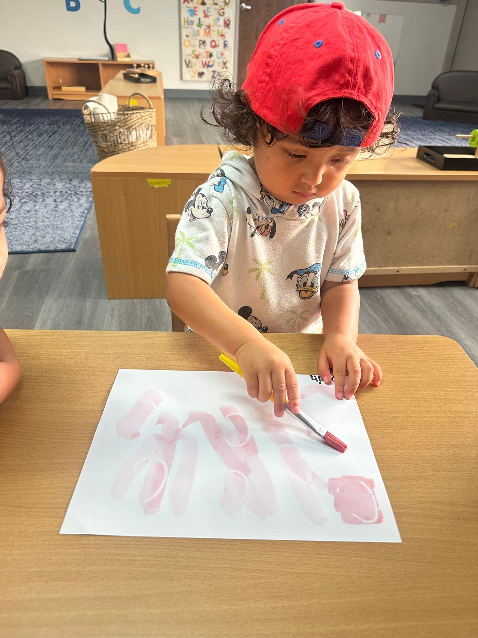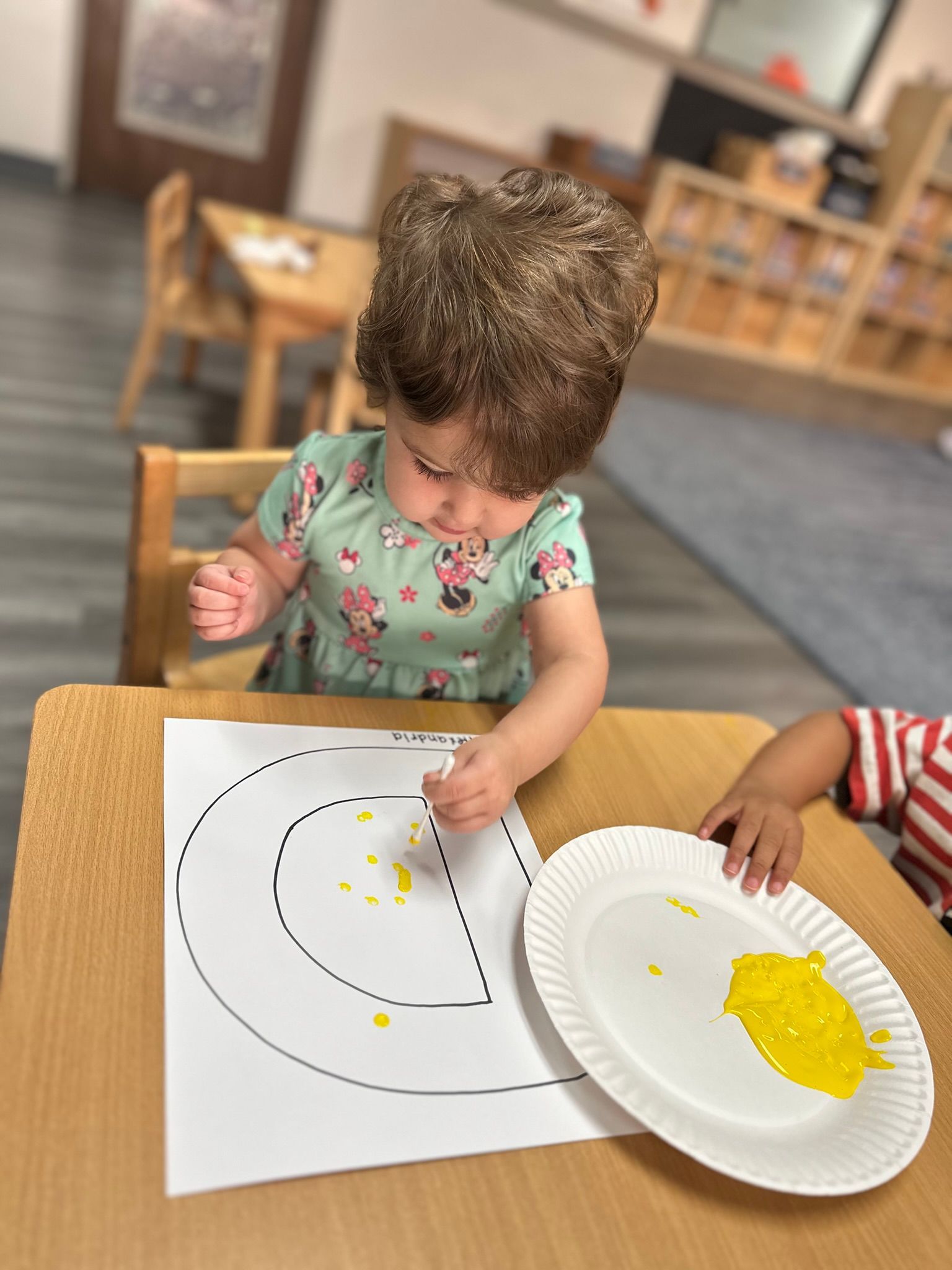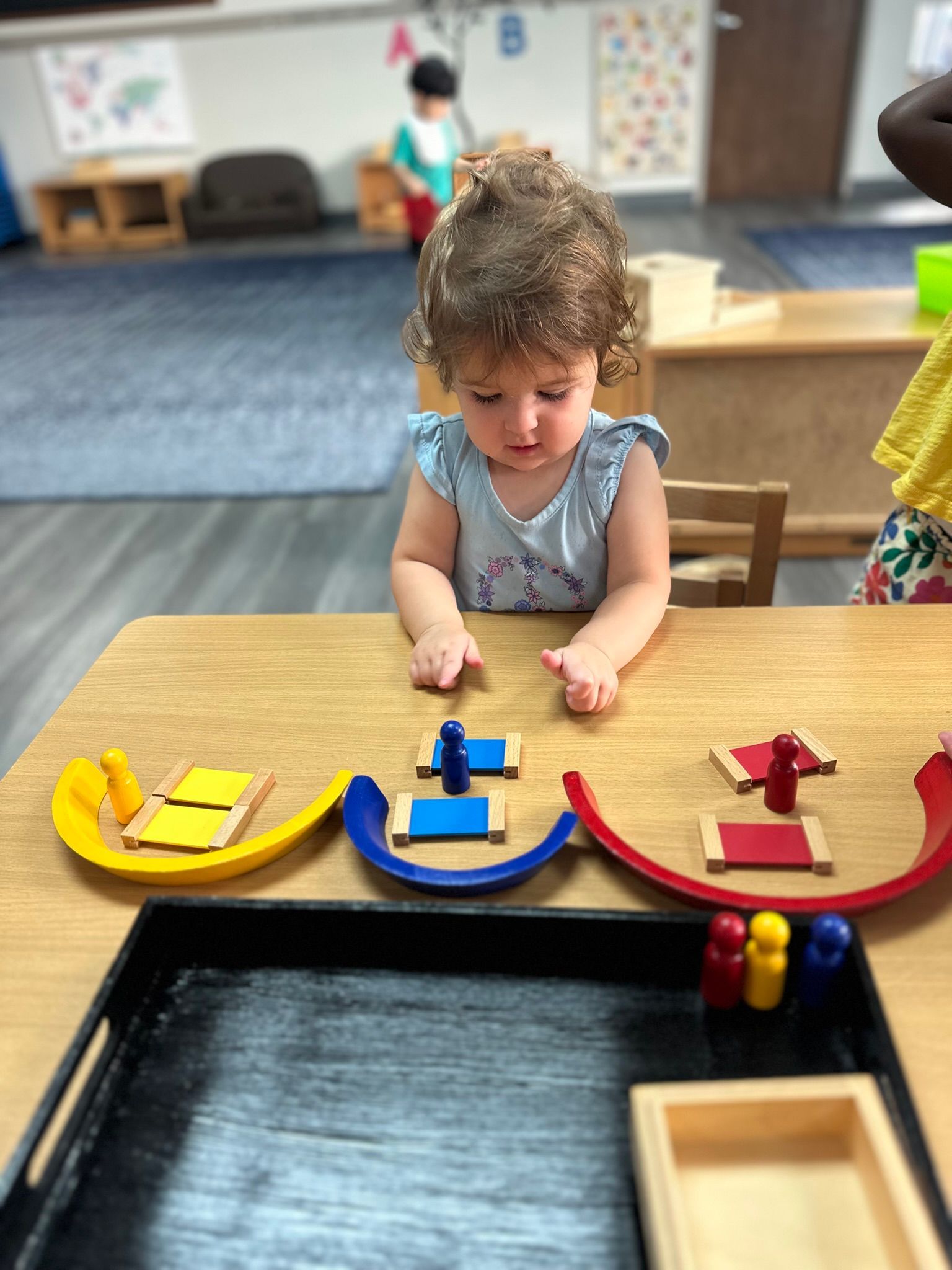 We loved our book of the month, The Kissing Hand by Audrey Penn. We used it to talk about our families and the way they take care of us. We shared our family pictures and talked about the names of the people in our families. We also had fun learning about our letters of the week A-C, we sang a song about the sound that each letter makes and named things that start with that letter. In practical life the children learned about working on their discipline and deportment skills by practicing taking a job from the shelf to the table and replacing it where it belongs. art this month had us painting big yellow school buses to strengthen our fine motor and paintbrush skills and making handprint apples for our classroom tree. In the math area we introduced the numerals 1-3 and practiced counting to 3. In our sensorial area we introduced the colors red, yellow, and blue. We practiced saying the names of the colors and built our visual discrimination skills by sorting objects into groups by color. We also listened to the differences in loud and quiet sounds with our shaker jars.