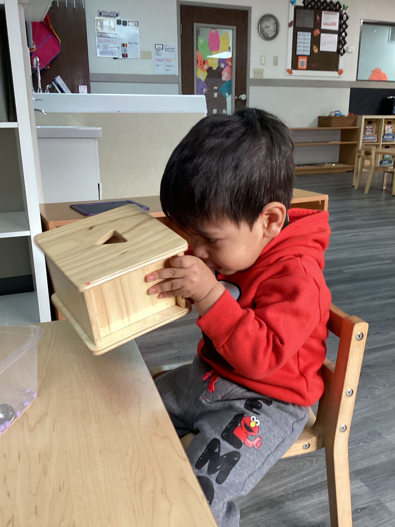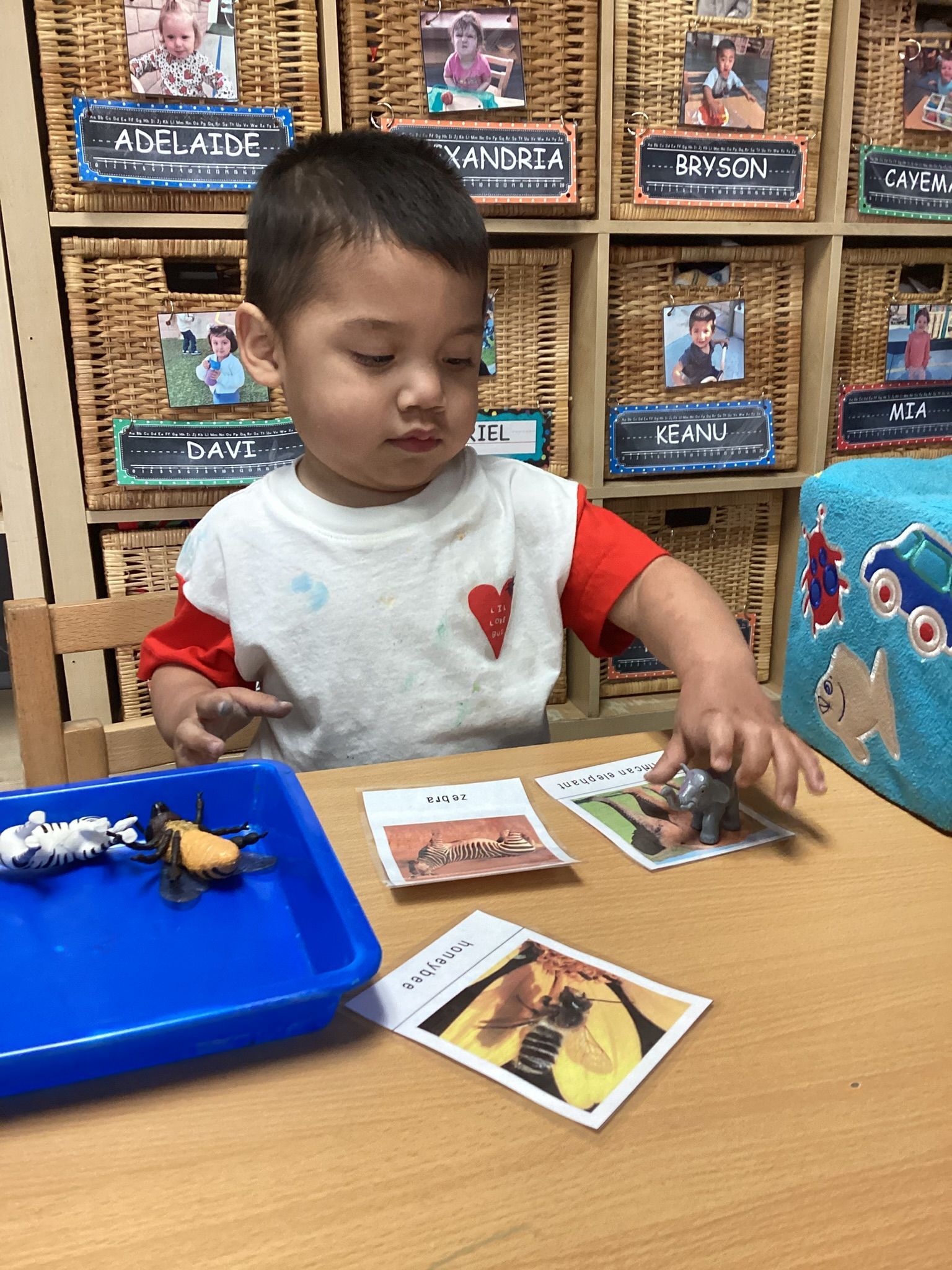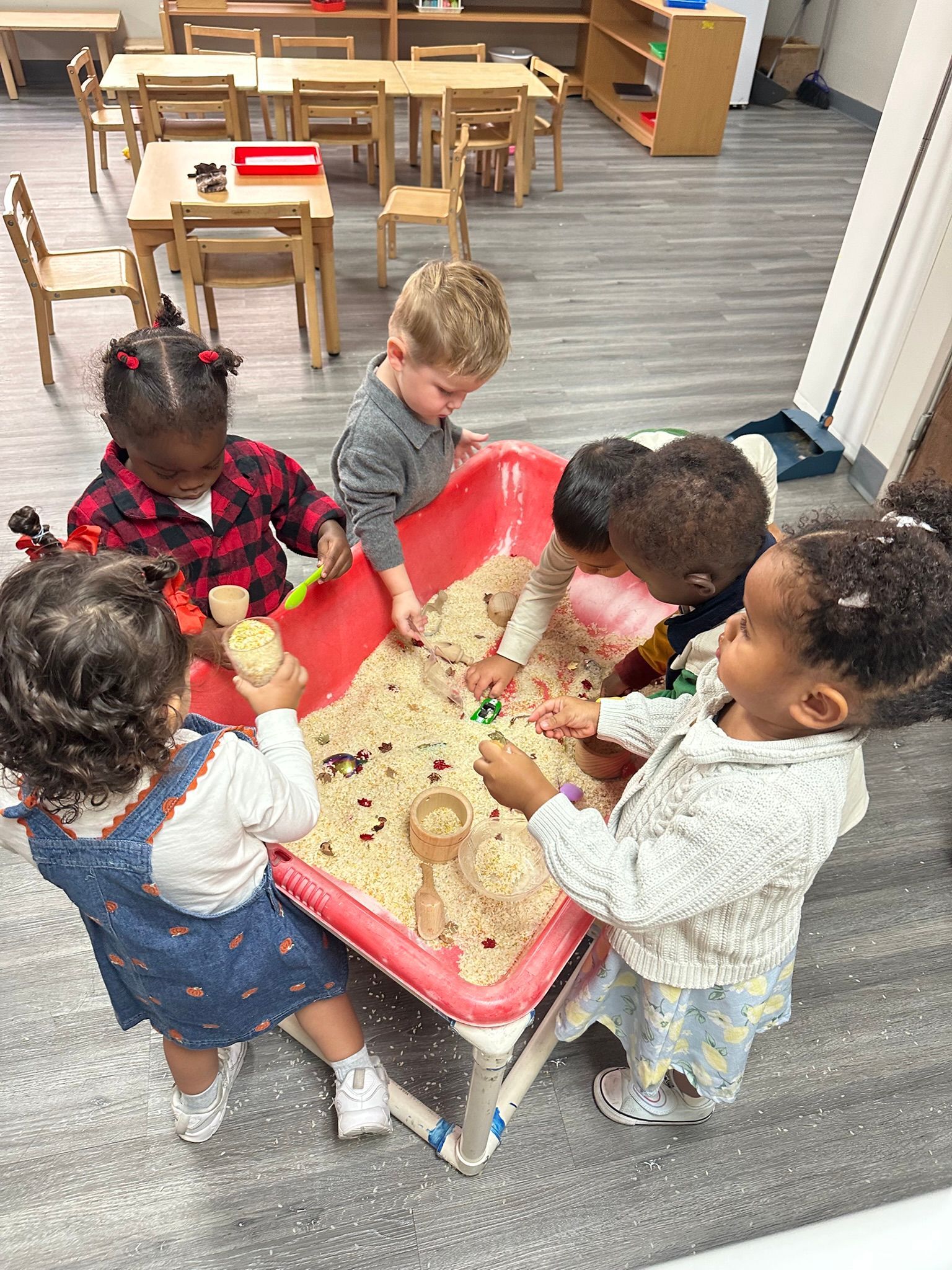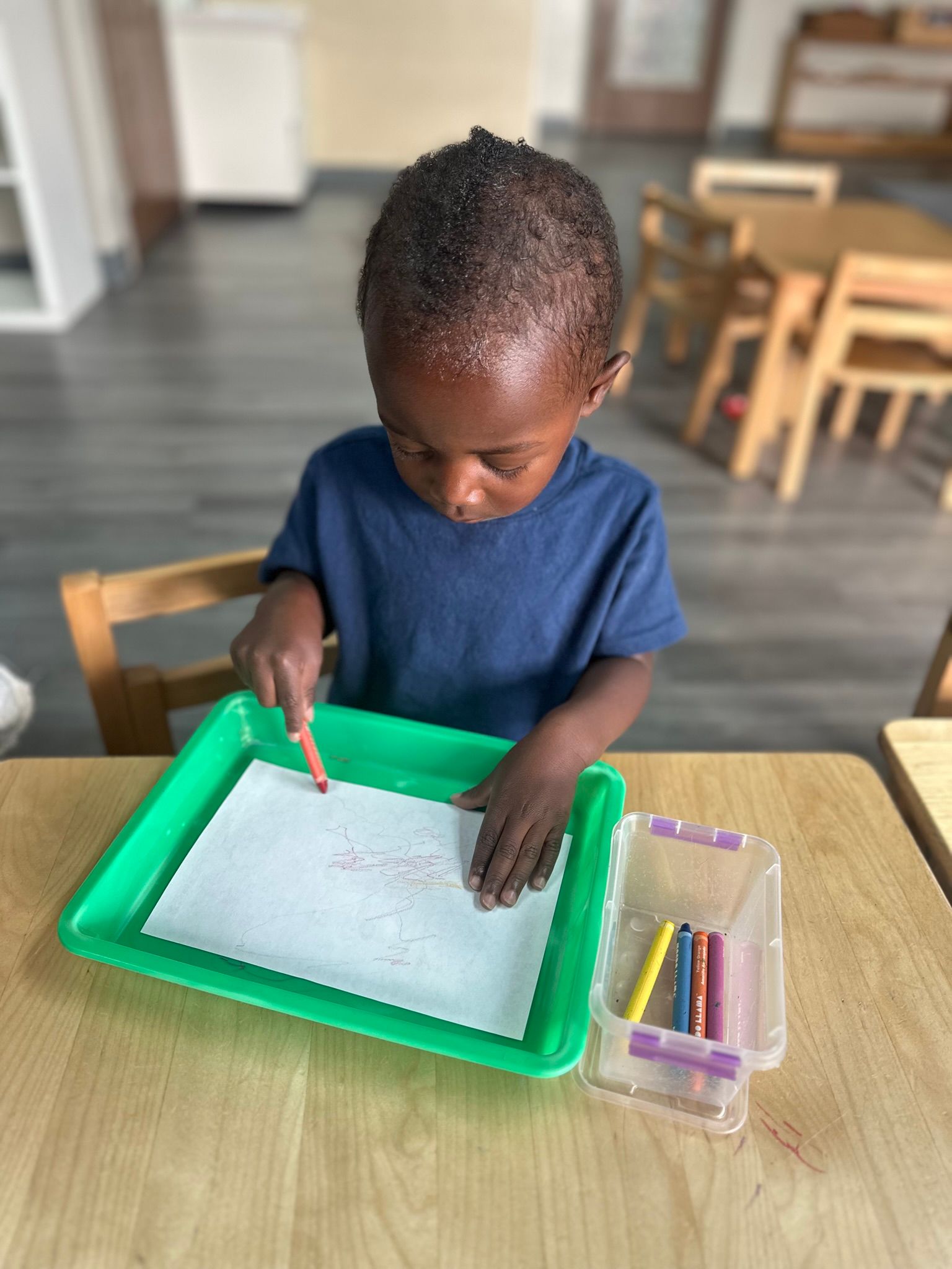 We loved our book of the month, The Kissing Hand by Audrey Penn. We used it to talk about our families and the way they take care of us. We shared our family pictures and talked about the names of the people in our families. We also had fun learning about our letters of the week A-C, we sang a song about the sound that each letter makes and named things that start with that letter. In practical life the children learned about working on their discipline and deportment skills by practicing taking a job from the shelf to the table and replacing it where it belongs. art this month had us painting big yellow school buses to strengthen our fine motor and paintbrush skills and making handprint apples for our classroom tree. In the math area we introduced the numerals 1-3 and practiced counting to 3. In our sensorial area we introduced the colors red, yellow, and blue. We practiced saying the names of the colors and built our visual discrimination skills by sorting objects into groups by color. We also listened to the differences in loud and quiet sounds with our shaker jars.