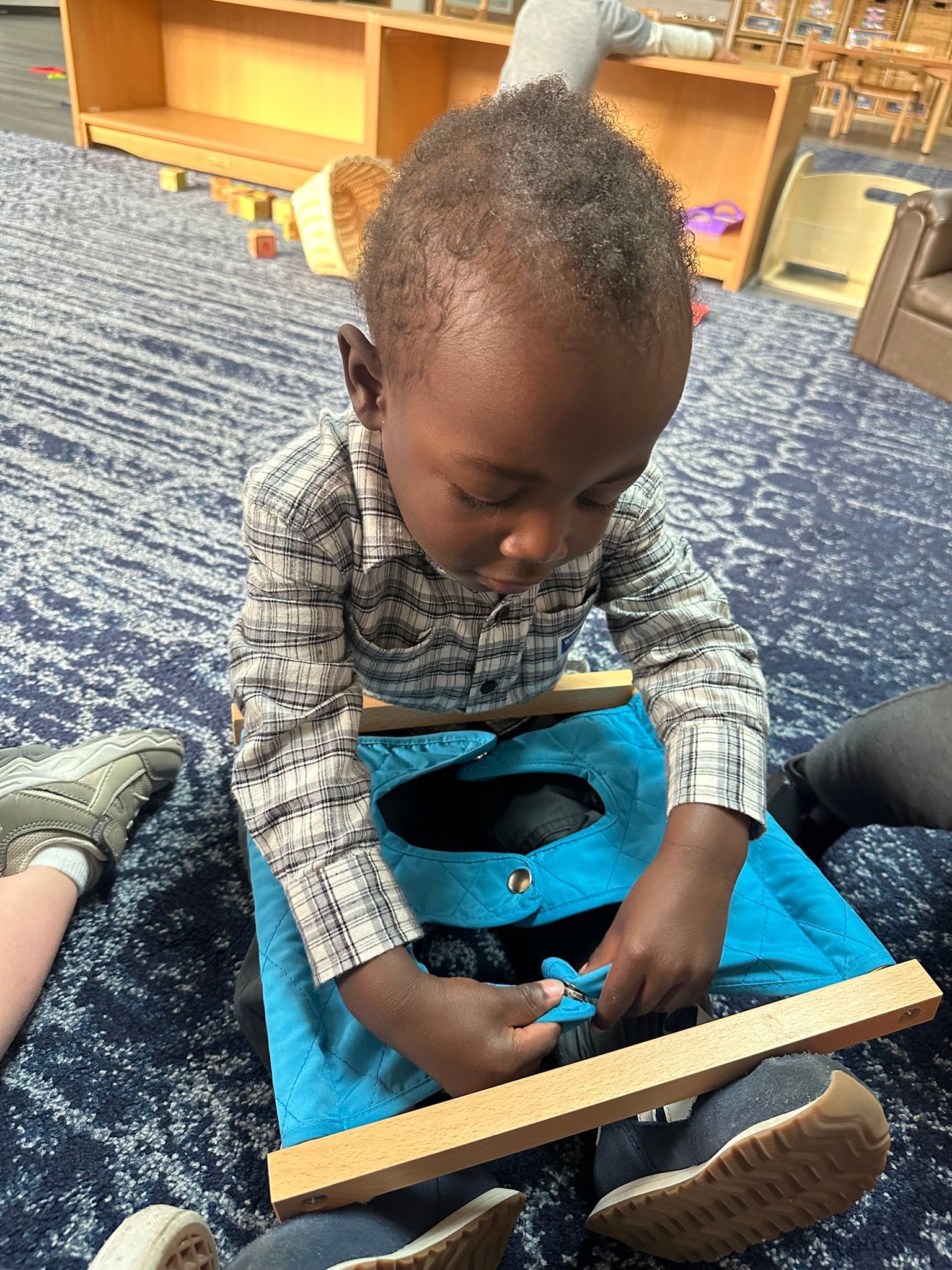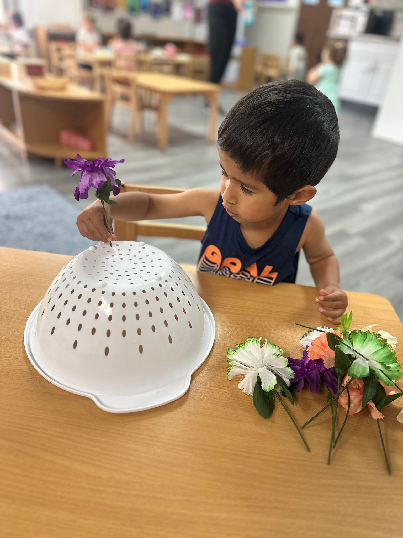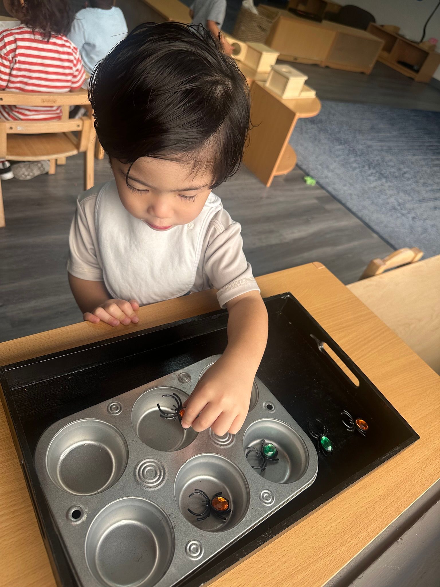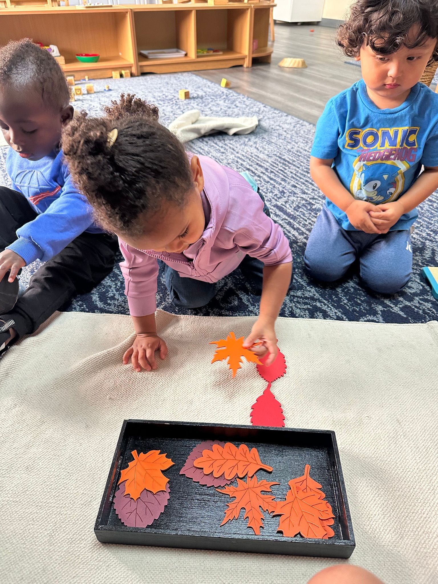 We went on a leaf hunt with our book of the month, We’re Going on a Leaf Hunt by Steven Metzger, we painted fall leaves and sorted and matched different leaf shapes. We were introduced to the letters e, f, and g; we named objects that started with each letter. We strengthened our fine motor skills and hand-eye coordination with popsicle stick posting. In the math area we continued practicing the numbers 1-3 and introduced the numbers 4-6. We sang a song called “How many fingers?” This song helped practice counting to five and working on our hand dexterity as we tried to show the quantity with our fingers. In the Sensorial area we introduced the colors orange, green, and purple. We looked for the three colors around our classroom and did farm animal stamping with green and purple.