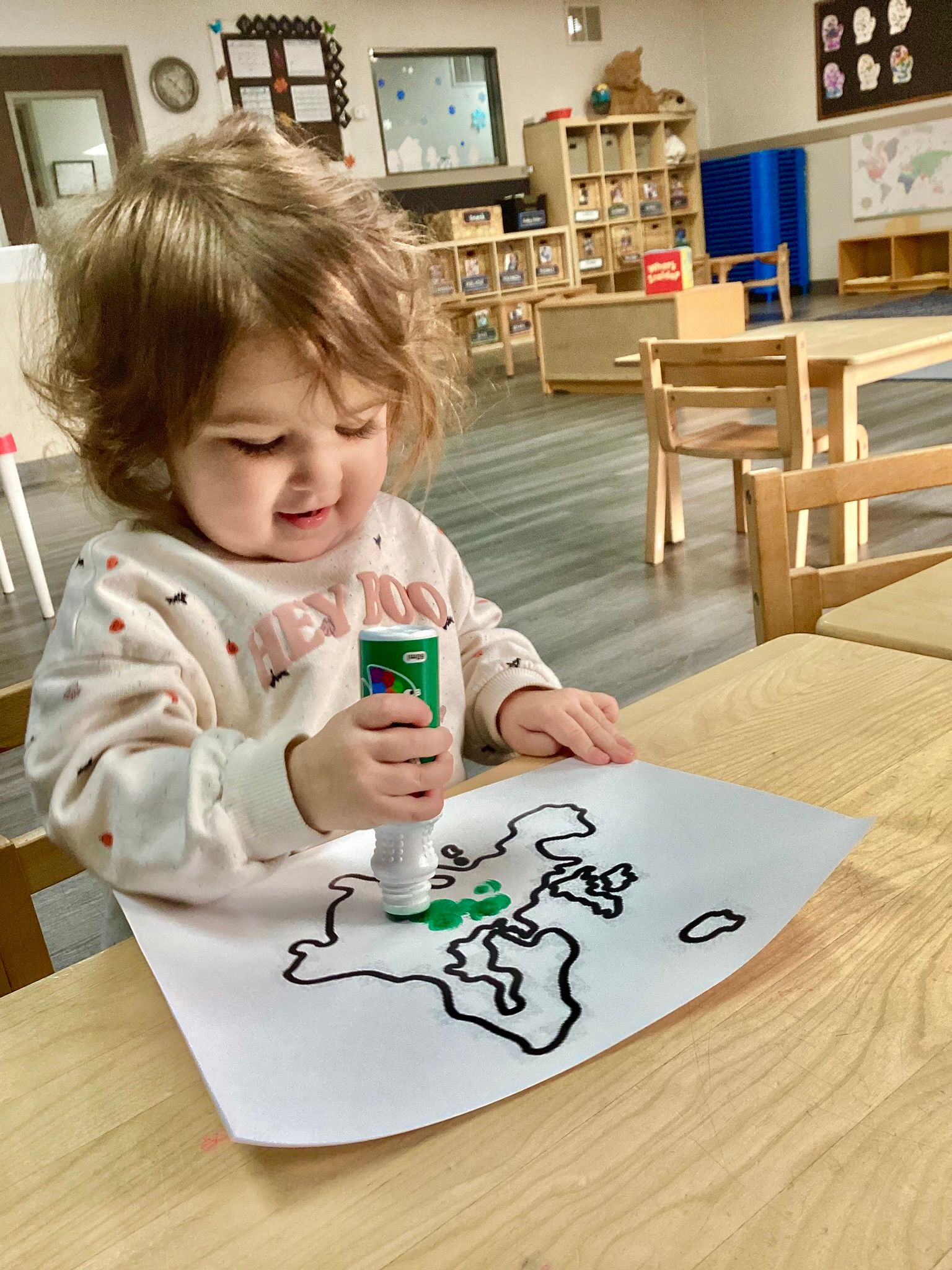 One of the highlights this month was learning about the life cycle of a butterfly. The children were especially excited to watch real caterpillars grow in our classroom! They loved checking on them each day and noticing how they changed. Our geography focus was Europe, we explored where Europe is on the globe and map. Children created map art and talked about different plants that grow in Europe, helping the children make connections between places and nature. The children also made mitten dot-stamping projects, inspired by our book of the month. This activity was great for building fine motor skills and letting the children be creative.