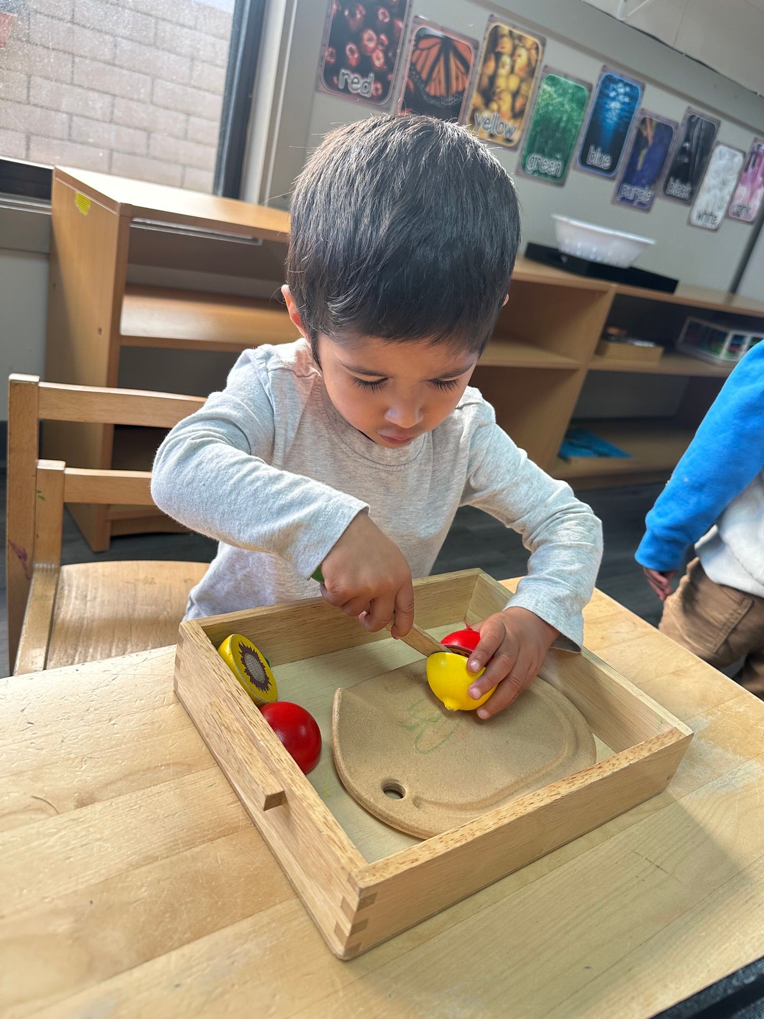 Our Montessori curriculum led us on a journey of discovery. We talked about the names of different fruits and vegetables and practiced cutting pretend fruit on a cutting board. We were introduced to the Velcro dressing frame and practiced opening and closing the fasteners. In our math area we introduced the number 5, we named the numeral and practiced counting out five objects. In the sensorial area we investigated different textures with our fabric matching job and the sandpaper boards. As always, we were introduced to our letters of the month G and H. For art we used a variety of art mediums to create different fruits and vegetables. We had a great time sharing and trying many different foods during our Thanksgiving Feast, thank you to everyone that participated by donating.